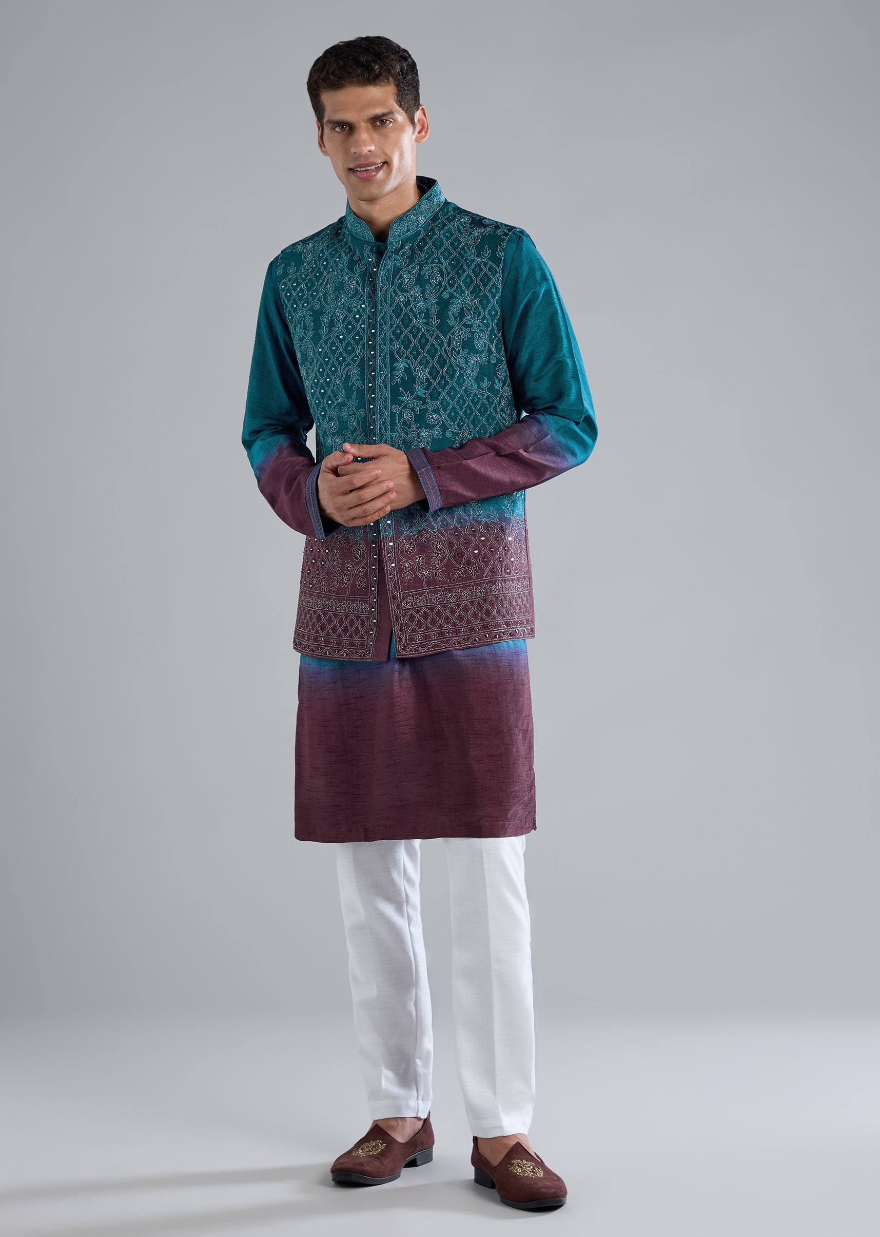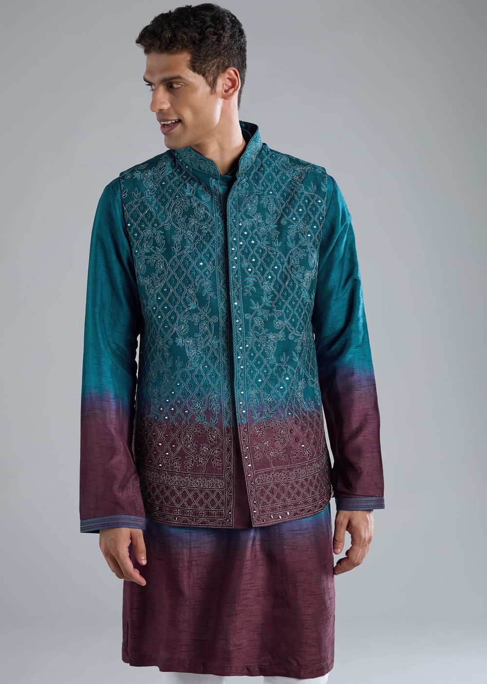 This multi blue and purple kurta jacket set showcases a vibrant ombre effect crafted using silk as the primary fabric and dola silk as the secondary fabric. The ensemble is enriched with intricate zari and mirror detailing, making it an ideal pick for mehendi, sangeet, and festive wedding celebrations. Designed with full sleeves, a mandarin collar, a front hook eye top closure, and a hook eye bottom closure, it comes as a complete set with a jacket, kurta, and pants. Awarded as the Most Trusted Brand, we're delivering styles you love, just as promised.
