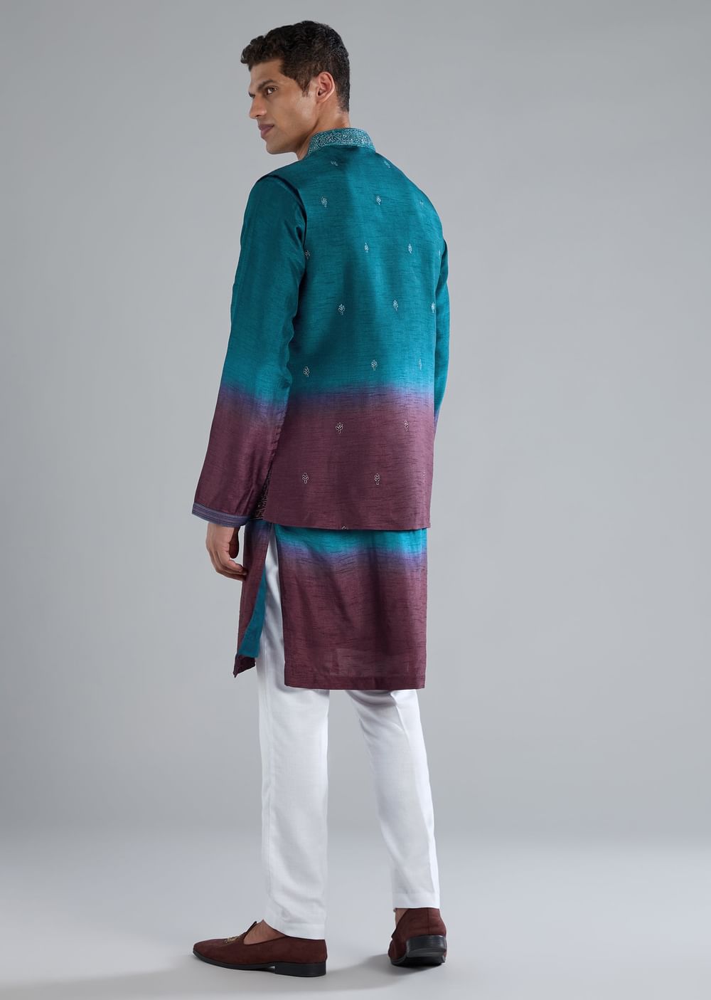 This multi blue and purple kurta jacket set showcases a vibrant ombre effect crafted using silk as the primary fabric and dola silk as the secondary fabric. The ensemble is... More Product Details