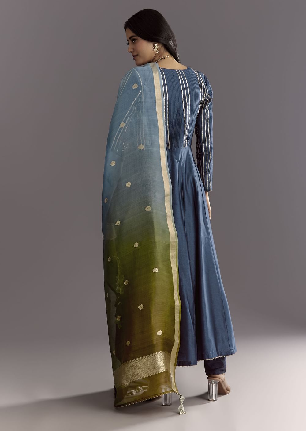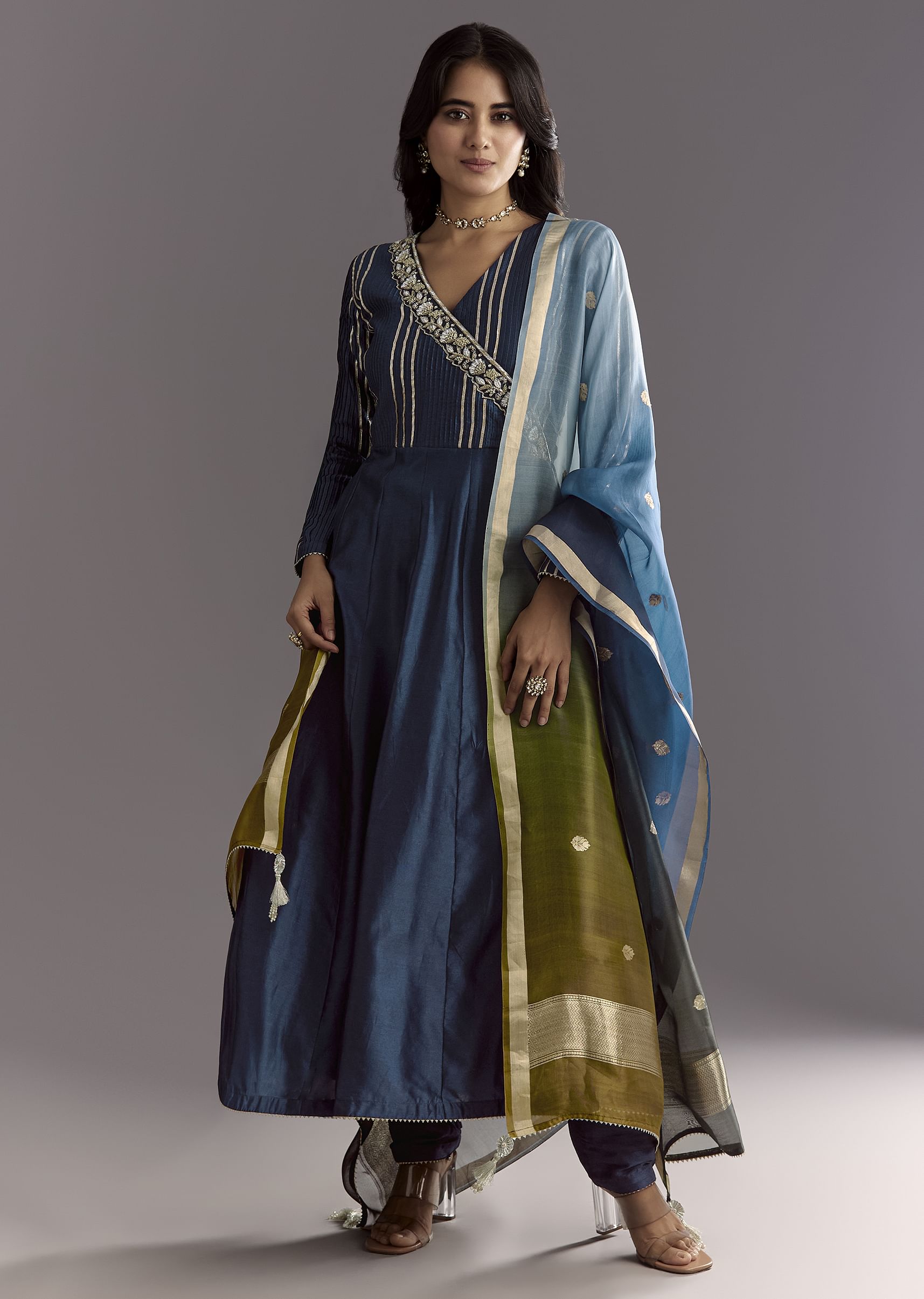 Angrakha silhouette flatters with flowy elegance.