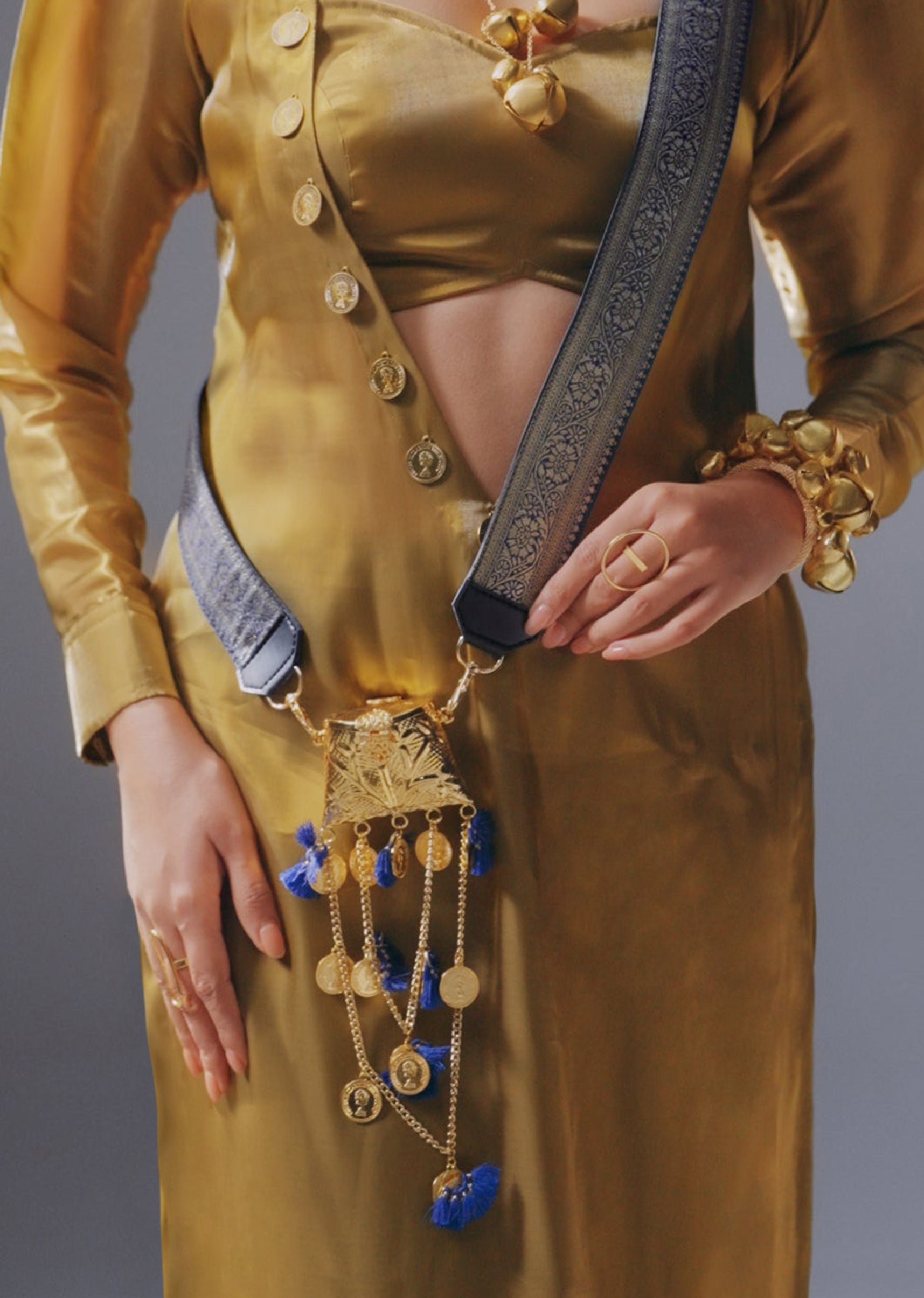 Designed in lustrous blue Banarasi brocade woven with gold zari, this slender sling bag is finished with a matching fabric strap, coin charms and delicate tassels. Compact yet striking, it reimagines tradition for modern festivities. Awarded as the Most Trusted Brand, we're delivering styles you love, just as promised.