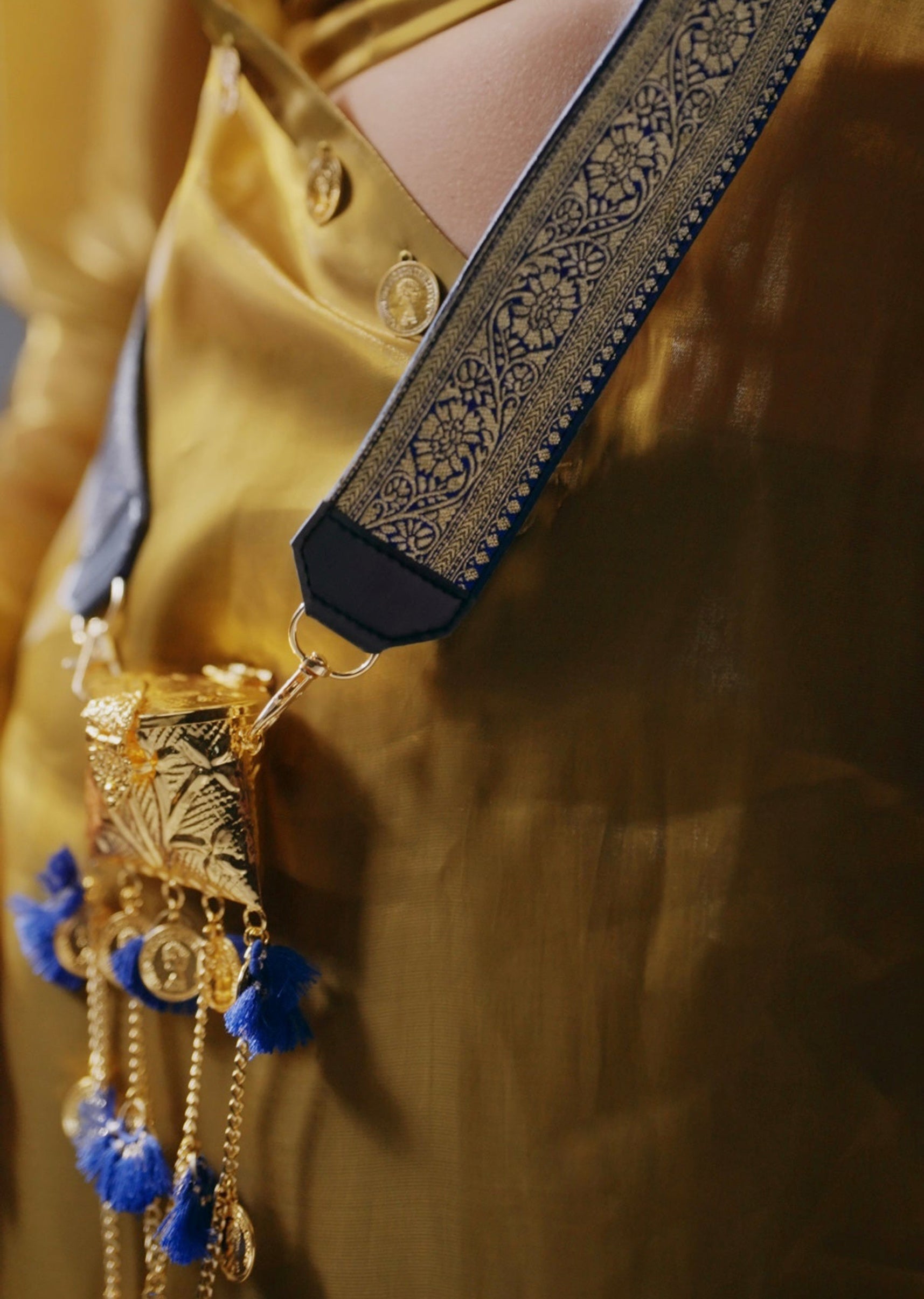 Designed in lustrous blue Banarasi brocade woven with gold zari, this slender sling bag is finished with a matching fabric strap, coin charms and delicate tassels. Compact yet striking, it... More Product Details