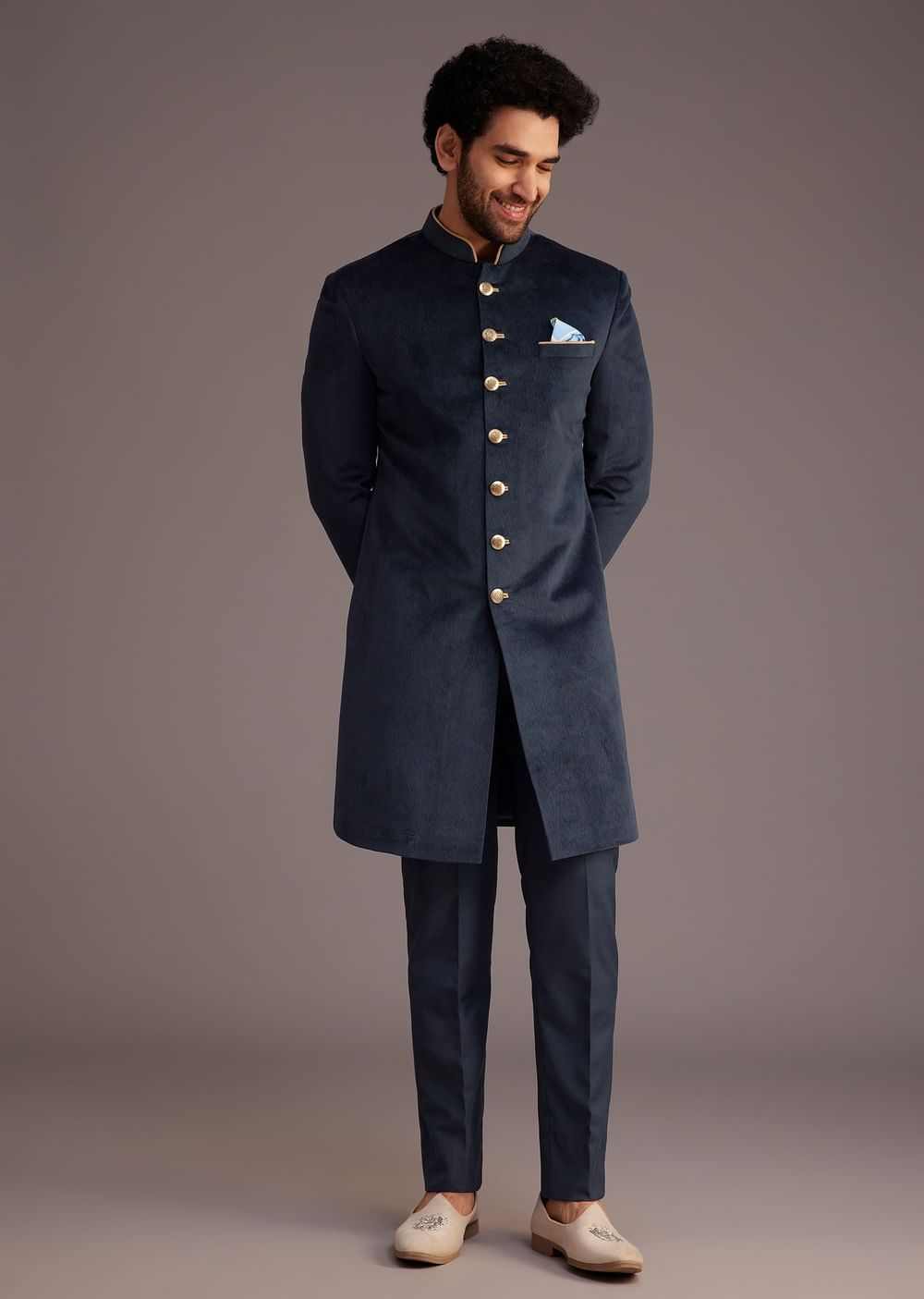 - This blue bandhgala suit exudes understated elegance featuring a classic design accented with regal gold buttons and a coordinating pocket square.