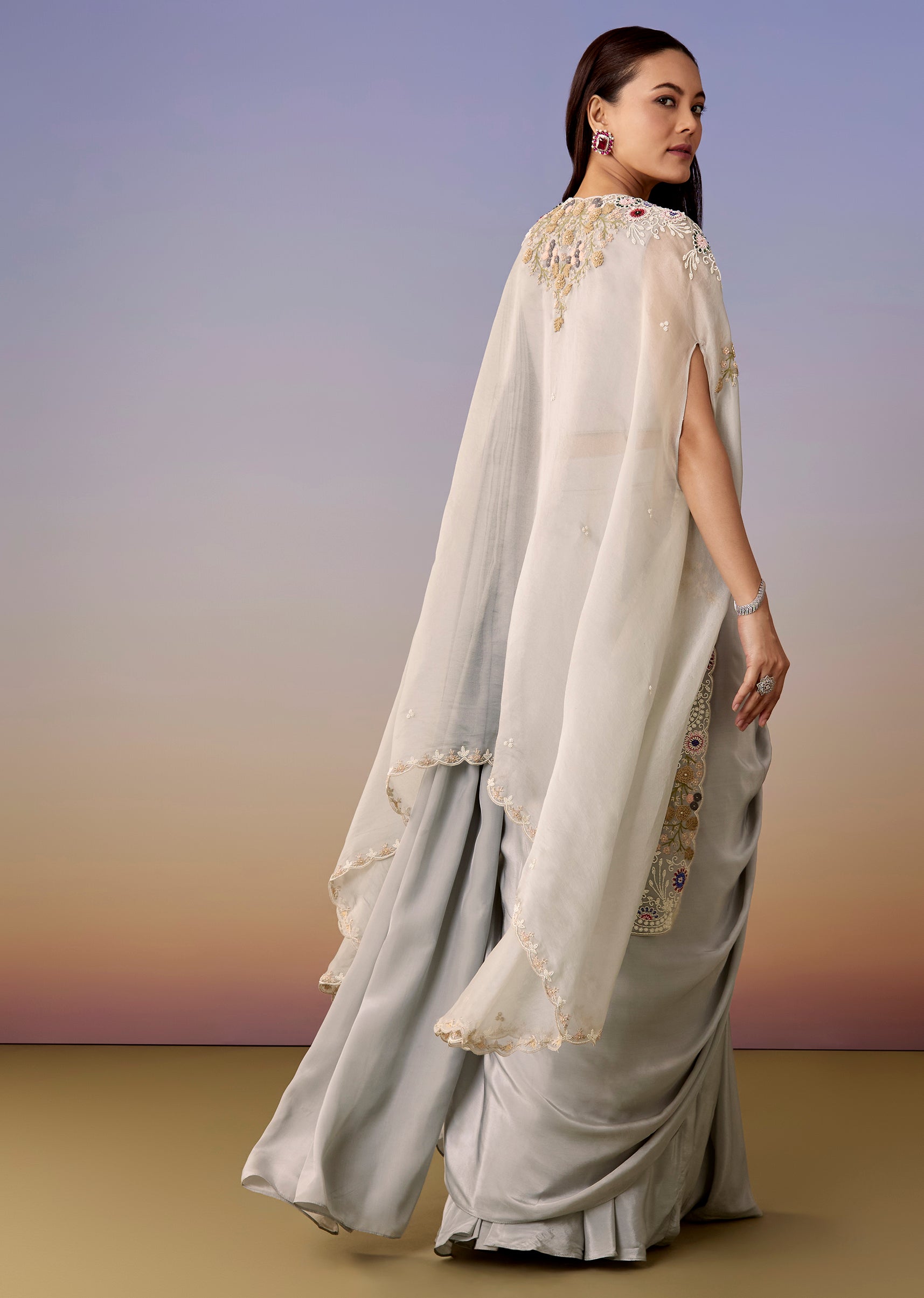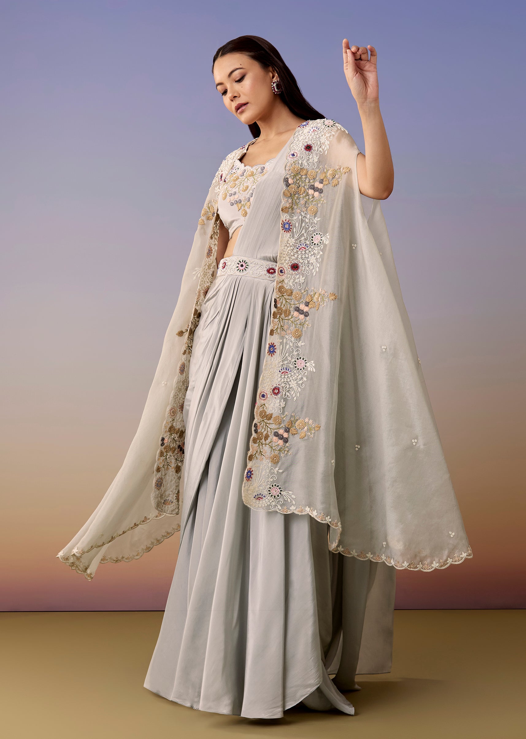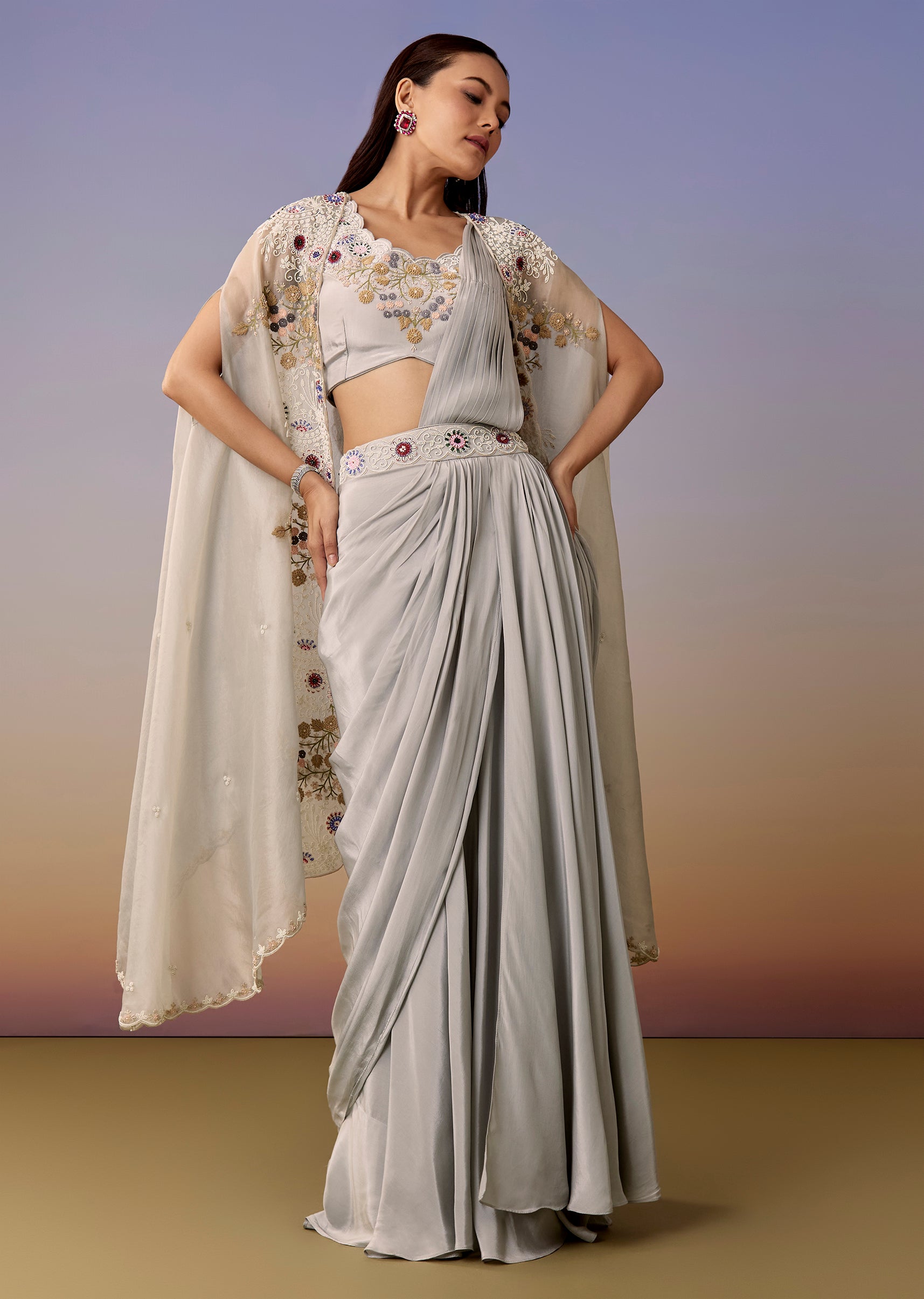 Pack Contains: 1 Blouse 1 Cape 1 Pre-drape saree