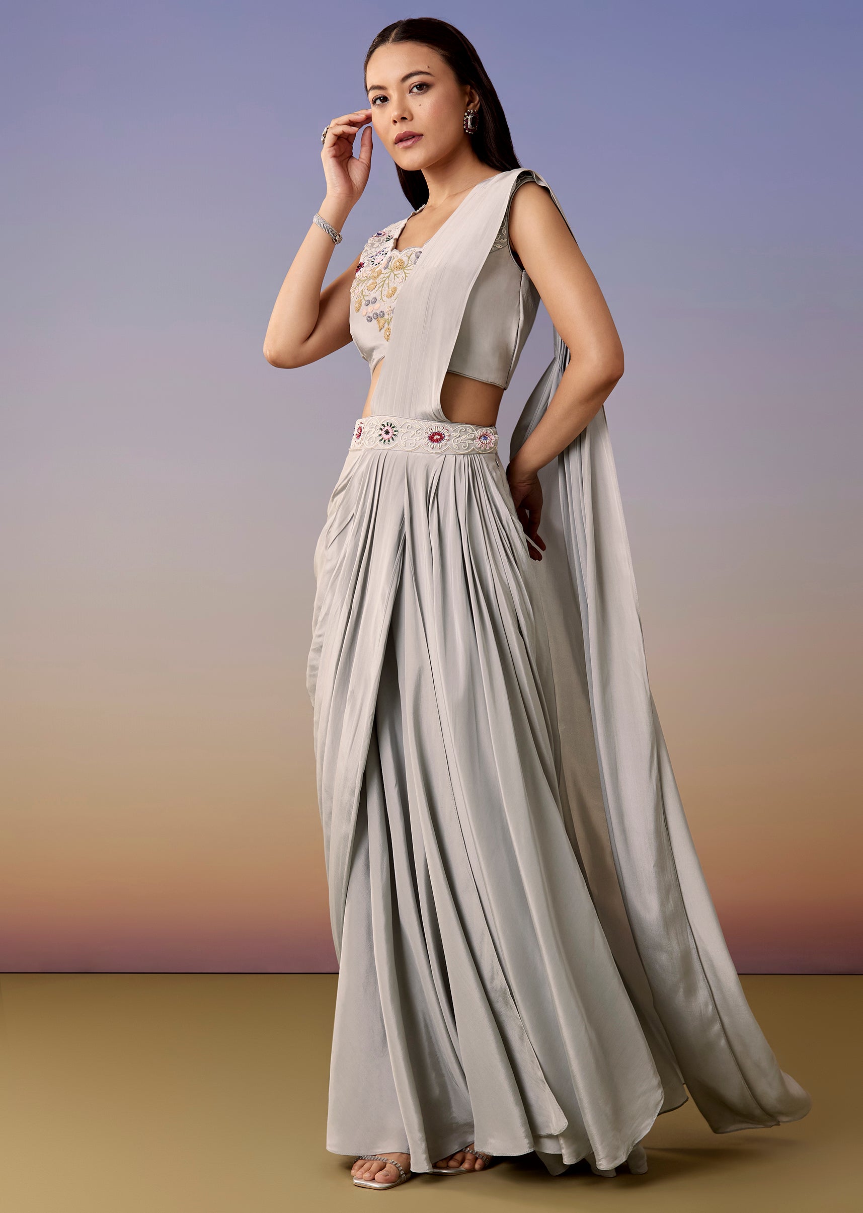 A pastel-blue pre-draped saree set with a stitched blouse, matching cape, and belt styling—accented with moti and threadwork. Sleeveless blouse with round neck and a clean contemporary fall—perfect for haldi... More Product Details