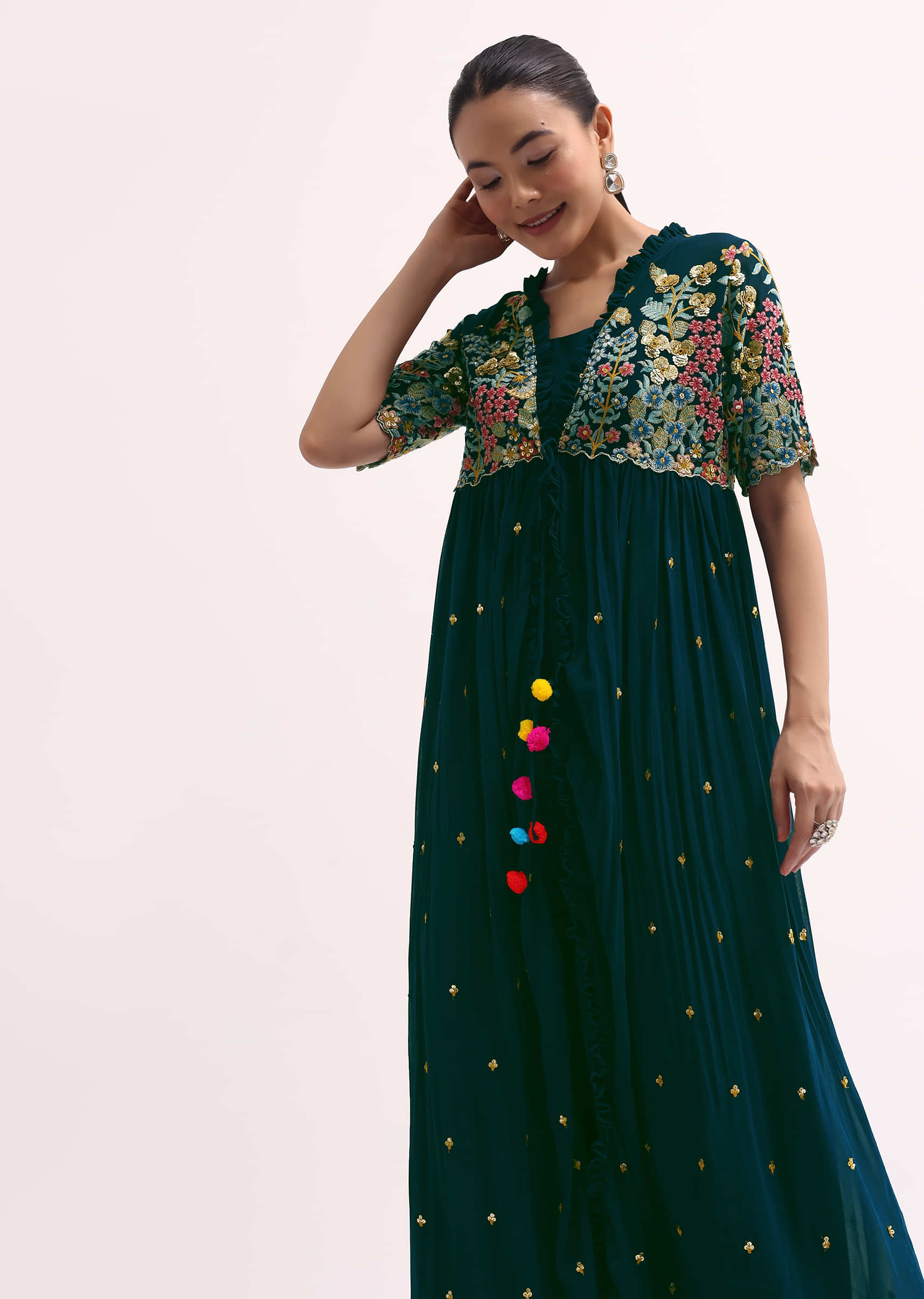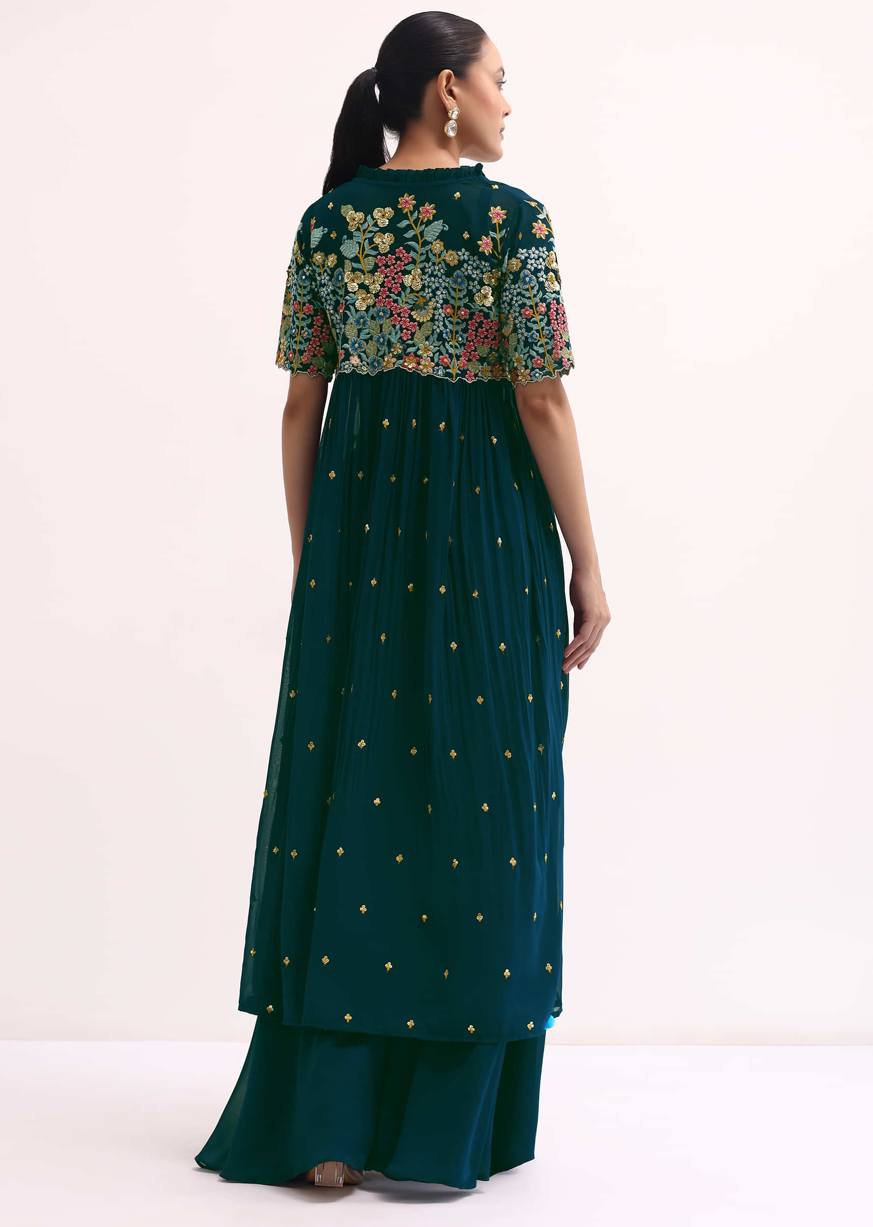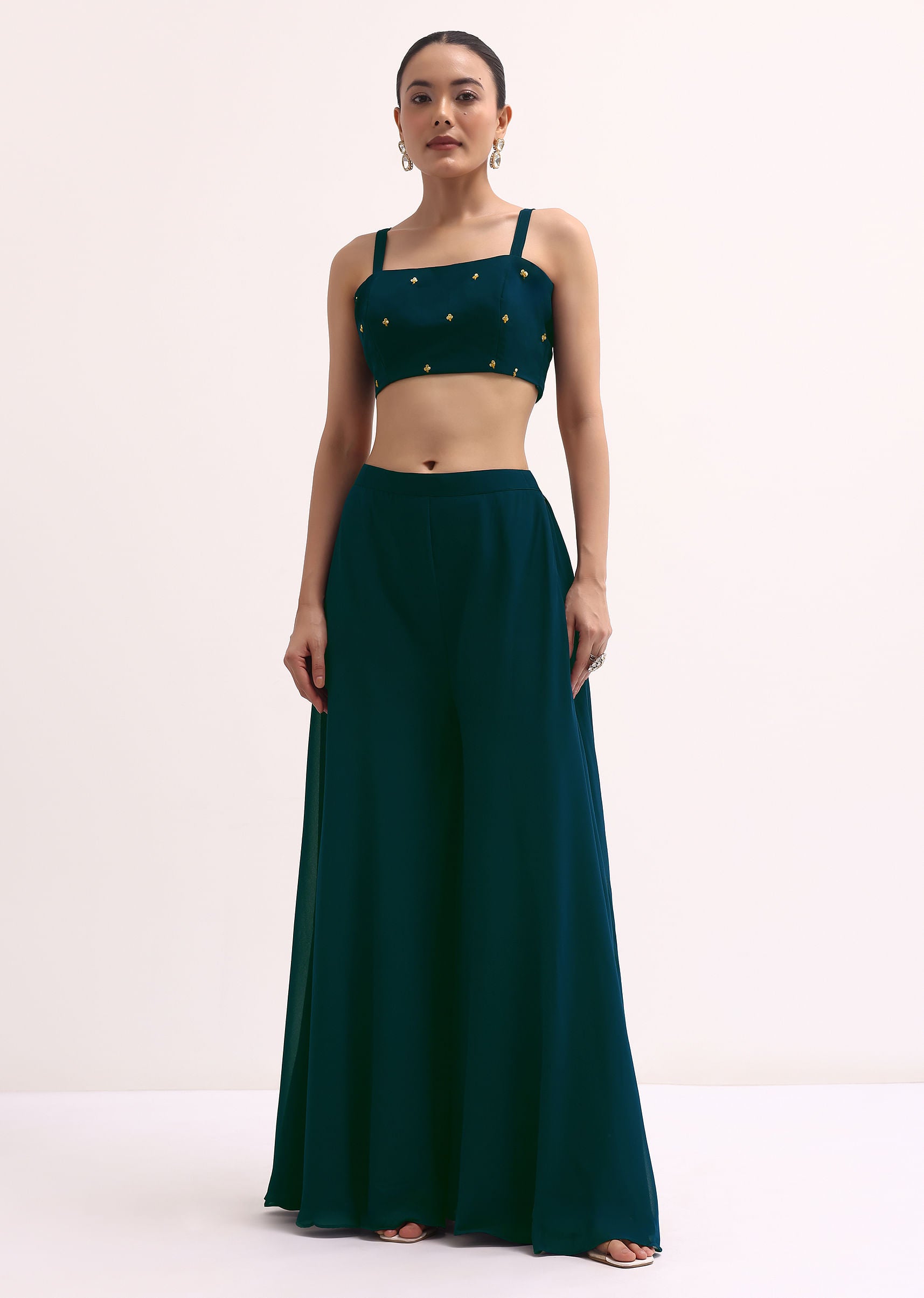 Dive into the timeless allure of our blue crop top and palazzo set meticulously crafted for mehendi and sangeet events. This ensemble is fashioned from chiffon and adorned with resham work and sequin embroidery. The crop top is gracefully paired with palazzo pants and a jacket offering a complete and polished look. Awarded as the Most Trusted Brand, we're delivering styles you love, just as promised.