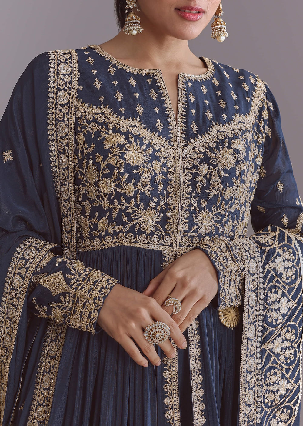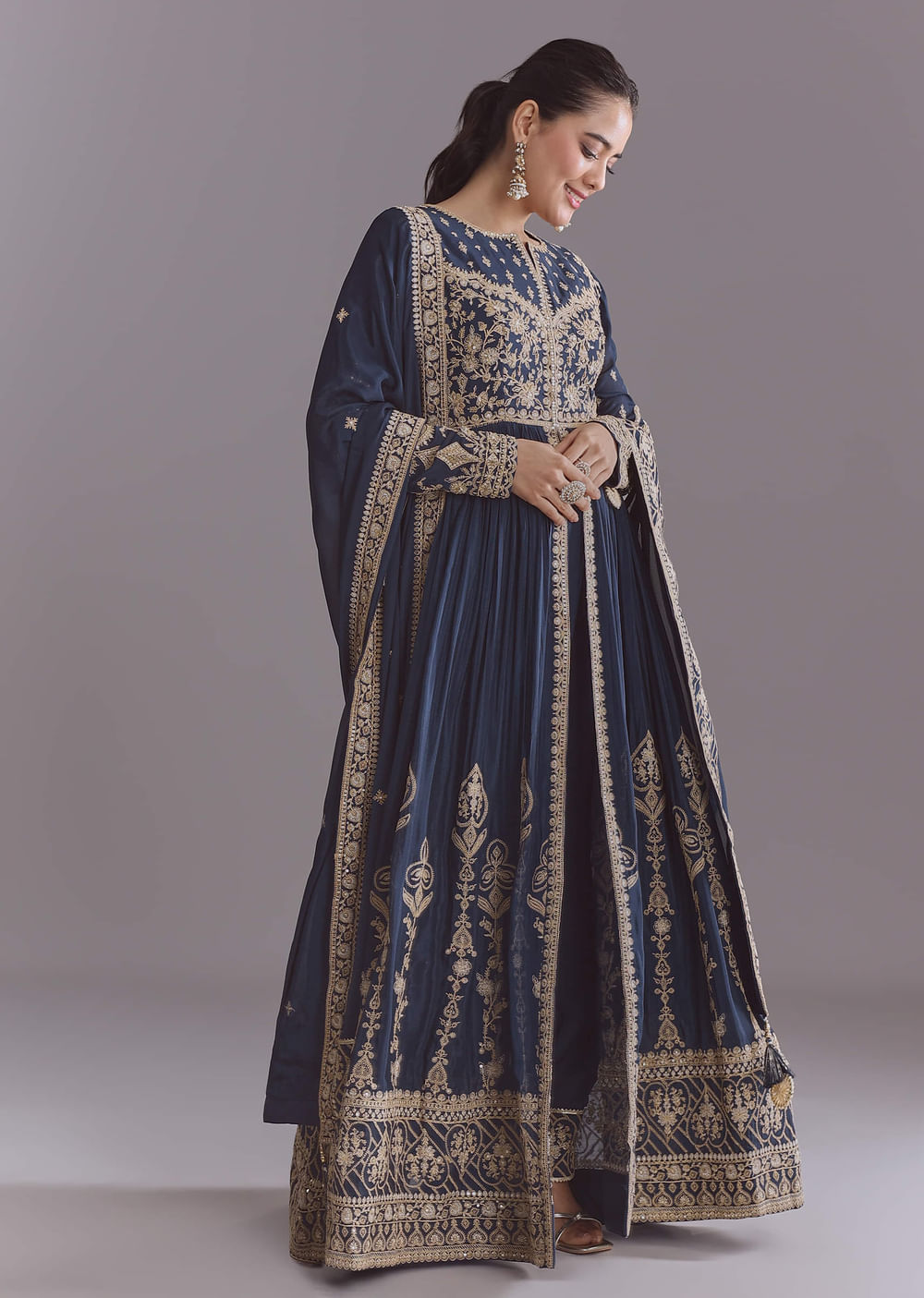 Blue Chinon Anarkali Suit With Embroidery And Front Slit