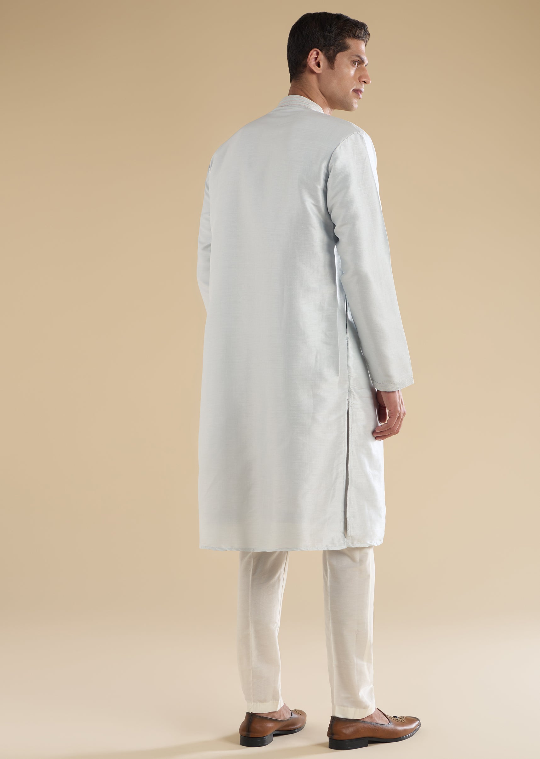 A timeless blue kurta set in art silk featuring subtle thread detailing. Finished with a mandarin collar, full sleeves, and front button closure, paired with straight mid-waist pants—great for festive and pooja dressing.