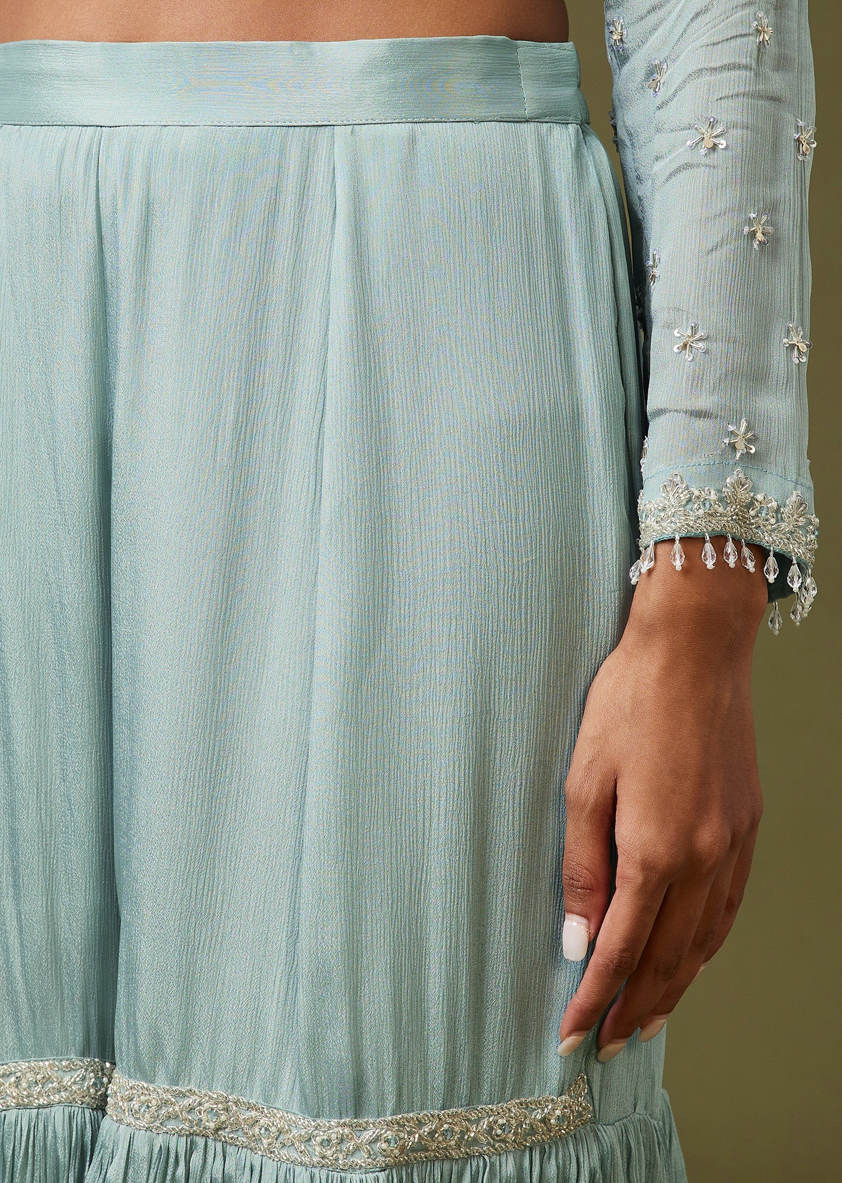 A festive must-have in blue, this chinon sharara set features cut dana and sequin work for a dressed-up finish. Designed with full sleeves and a V-neckline, it comes paired with... More Product Details