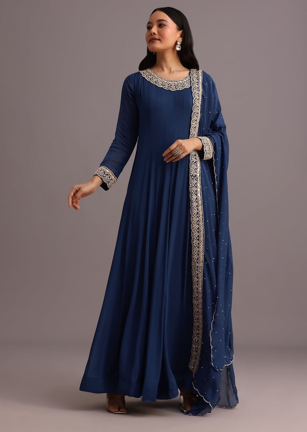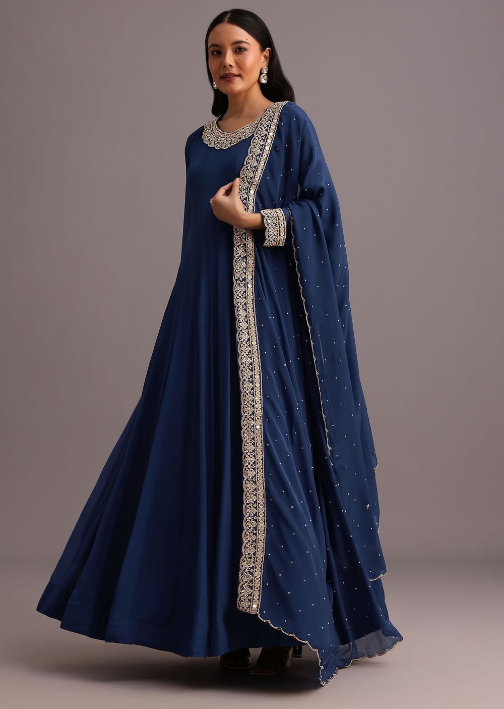 A dreamy vision of blue this anarkali set is a masterpiece of embroidery.The intricate cutdana sequins and mirror work on the neckline and sleeves create a dazzling display.while the dupatta... More Product Details