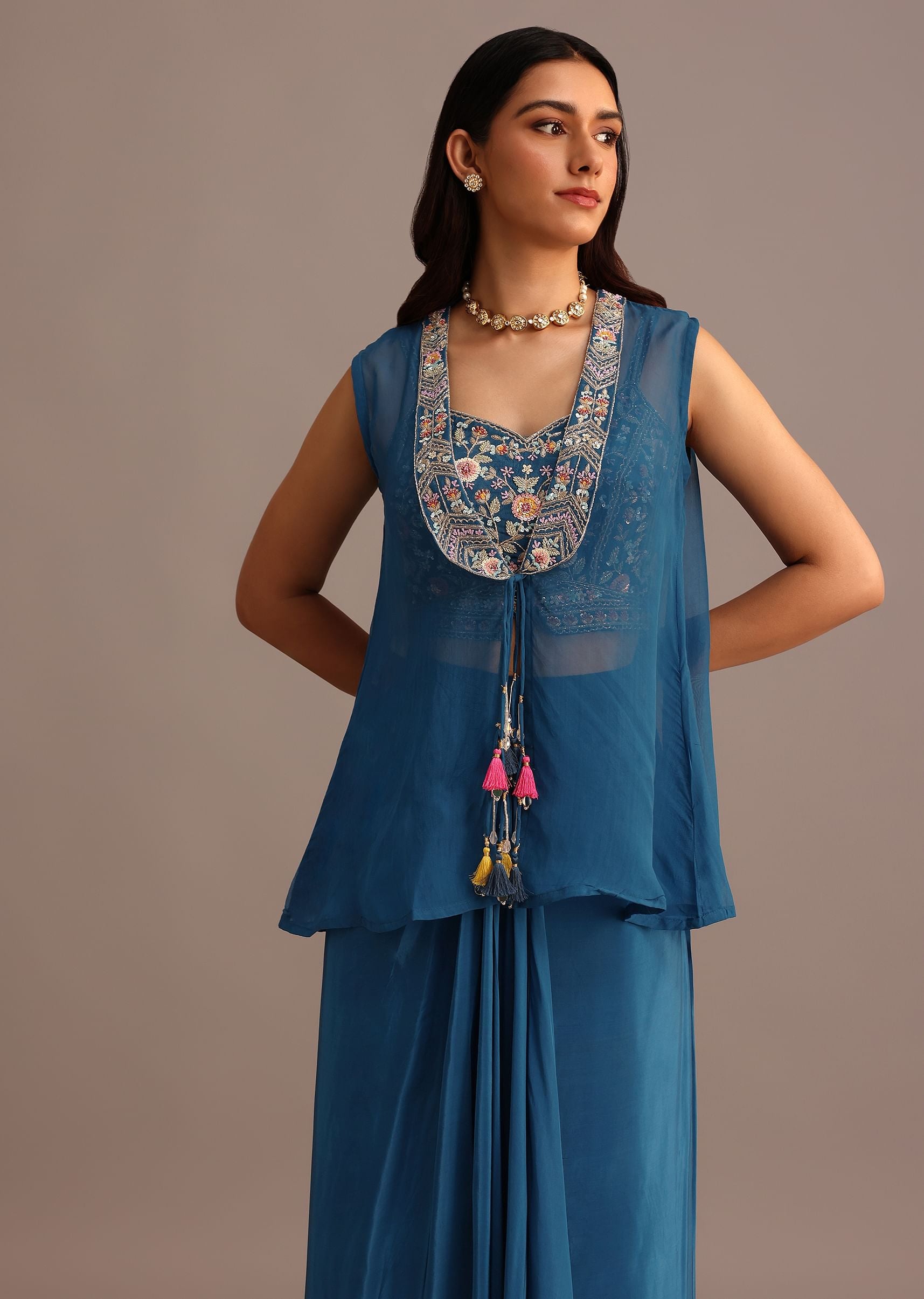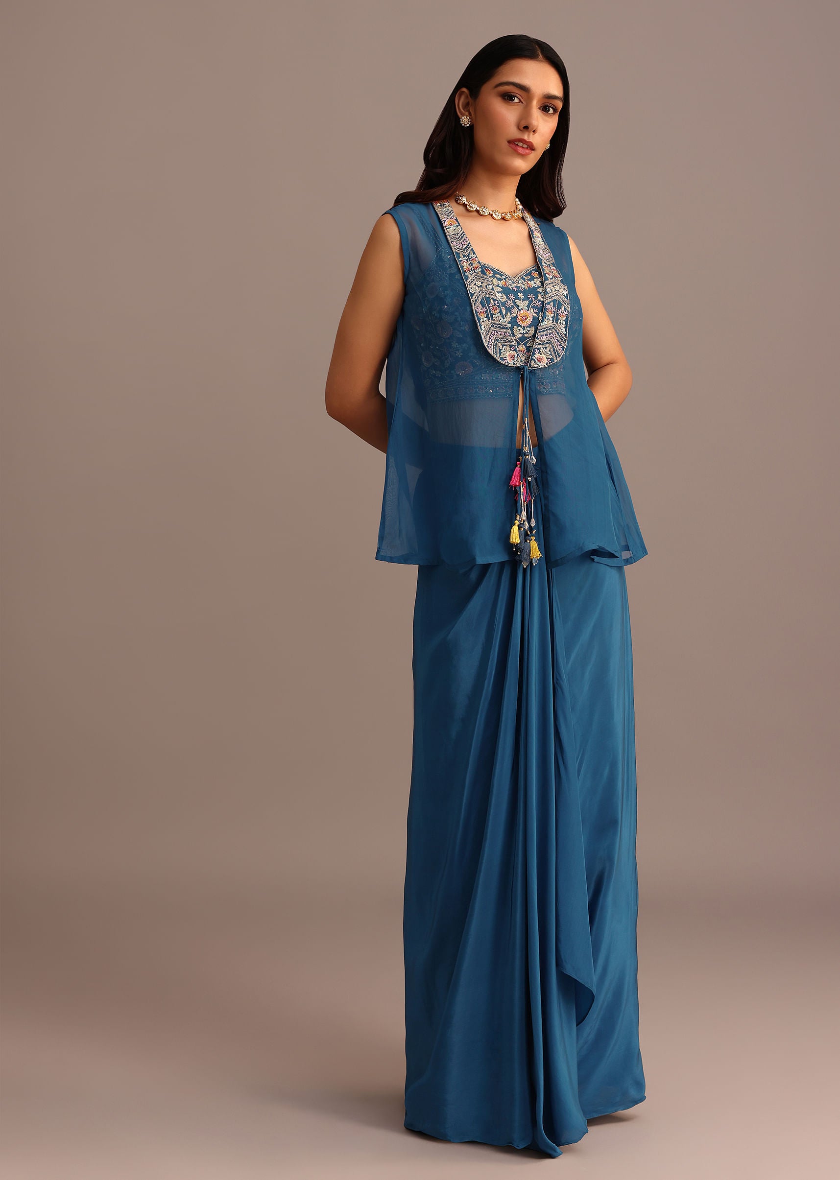 Blue Embroidered Croptop With Drape Skirt And Organza Jacket