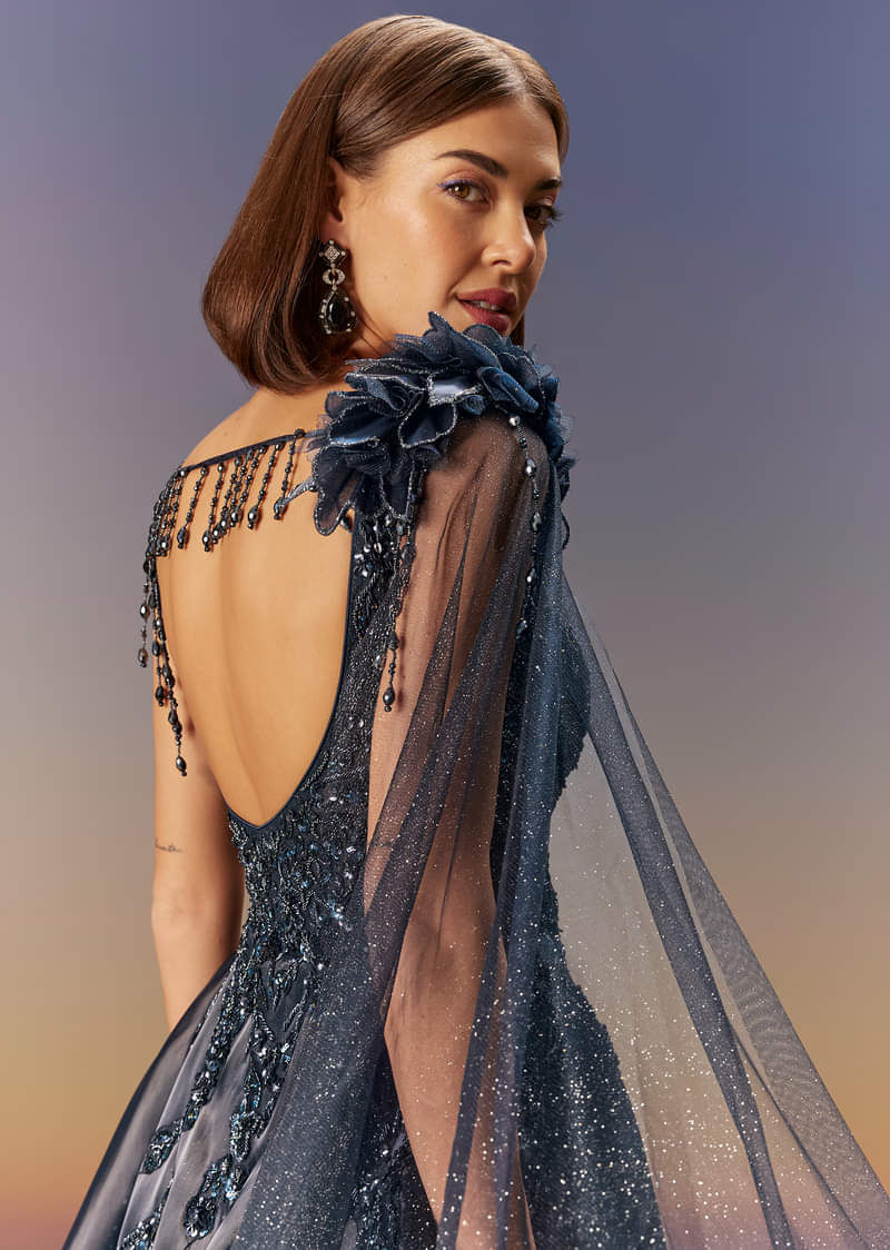 The cape provides visual balance, while the tailored bodice enhances a statuesque silhouette.