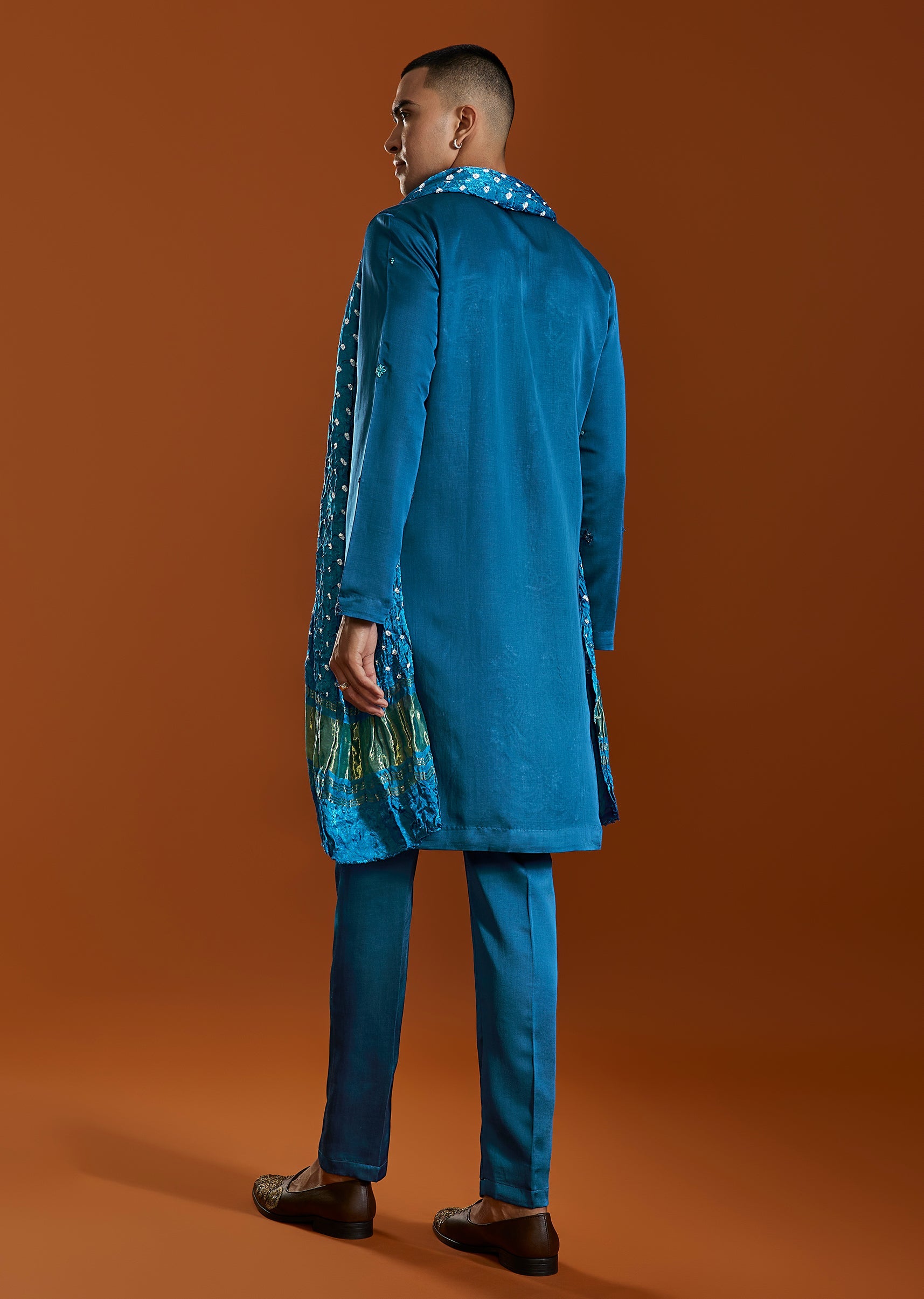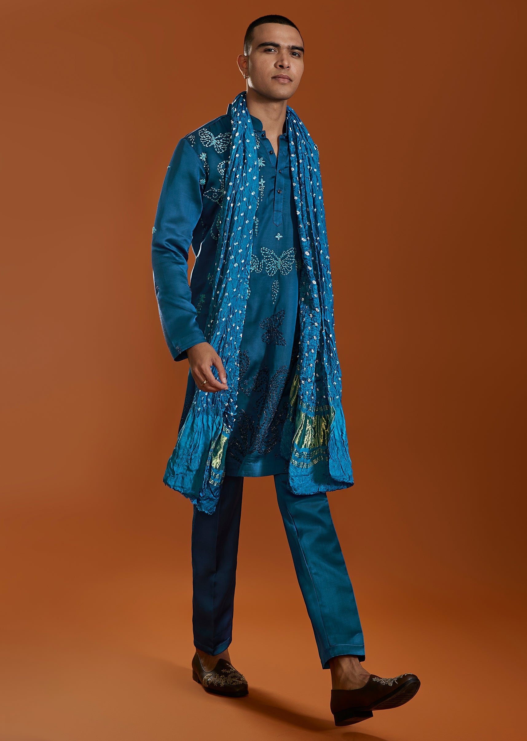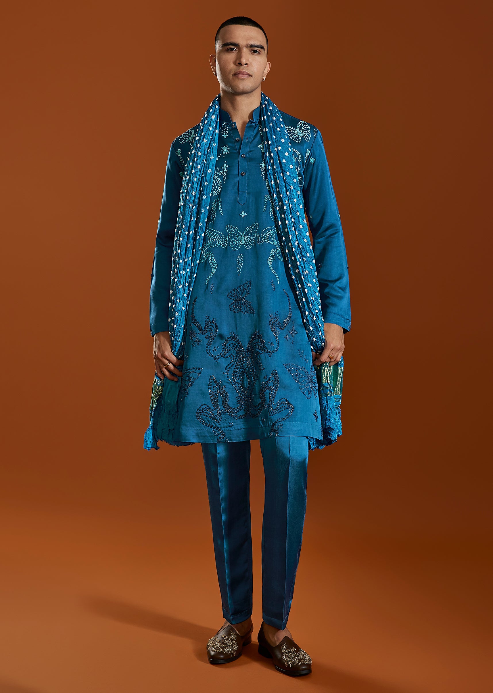 A striking blue satin silk kurta set detailed with elegant thread embroidery, designed to bring vibrant festive energy to wedding celebrations. Featuring a mandarin collar and paired with straight pants and a coordinated dupatta, this ensemble is ideal for mehendi and sangeet occasions. Awarded as the Most Trusted Brand, we're delivering styles you love, just as promised.