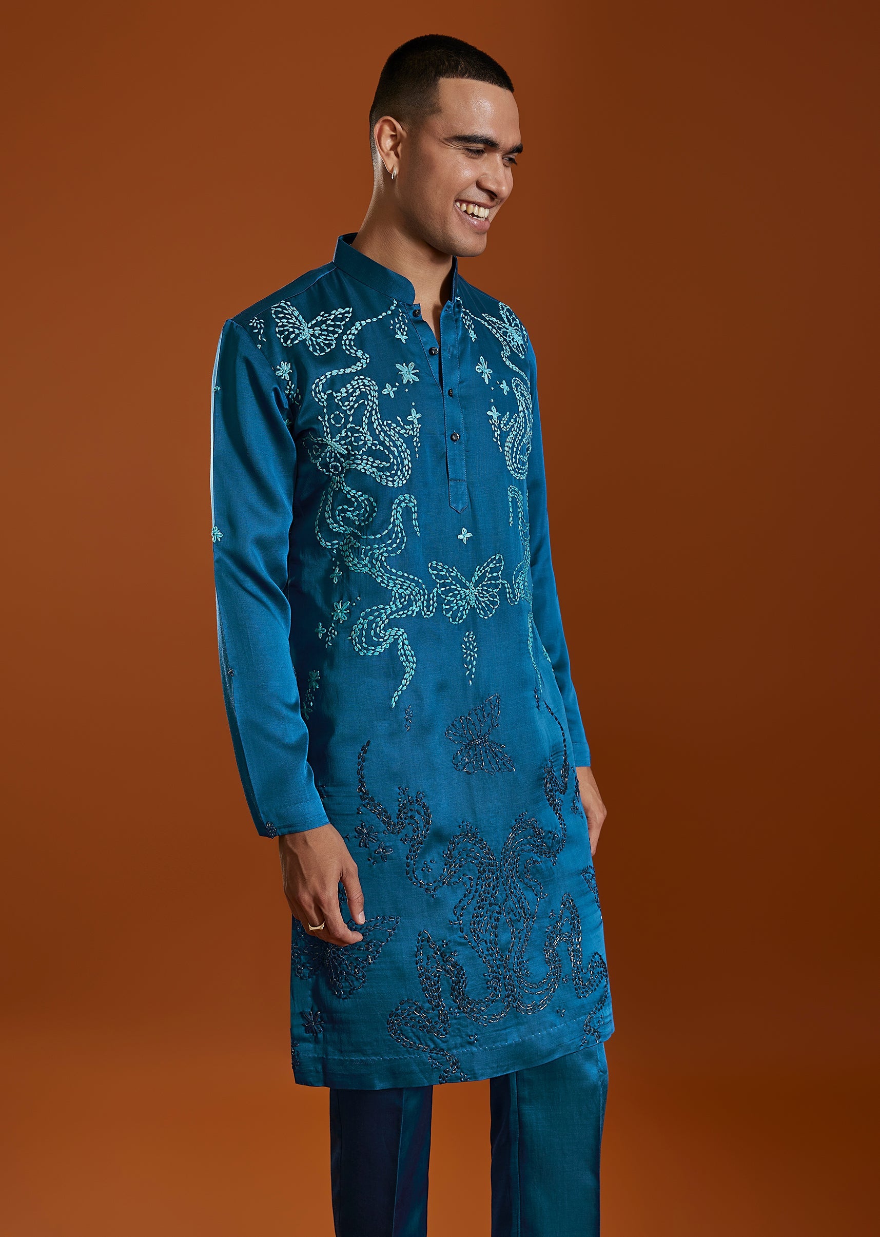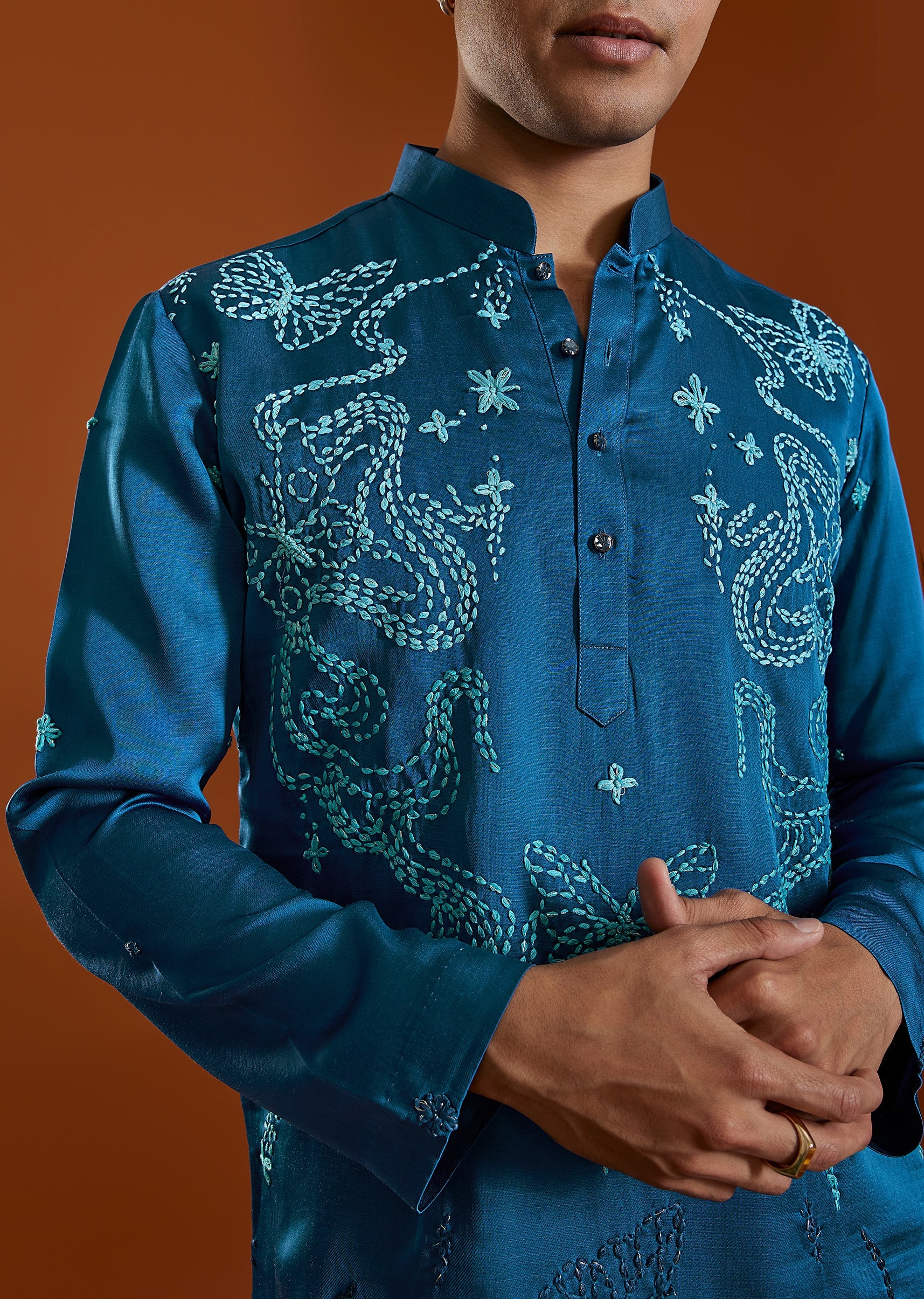 A striking blue satin silk kurta set detailed with elegant thread embroidery, designed to bring vibrant festive energy to wedding celebrations. Featuring a mandarin collar and paired with straight pants... More Product Details