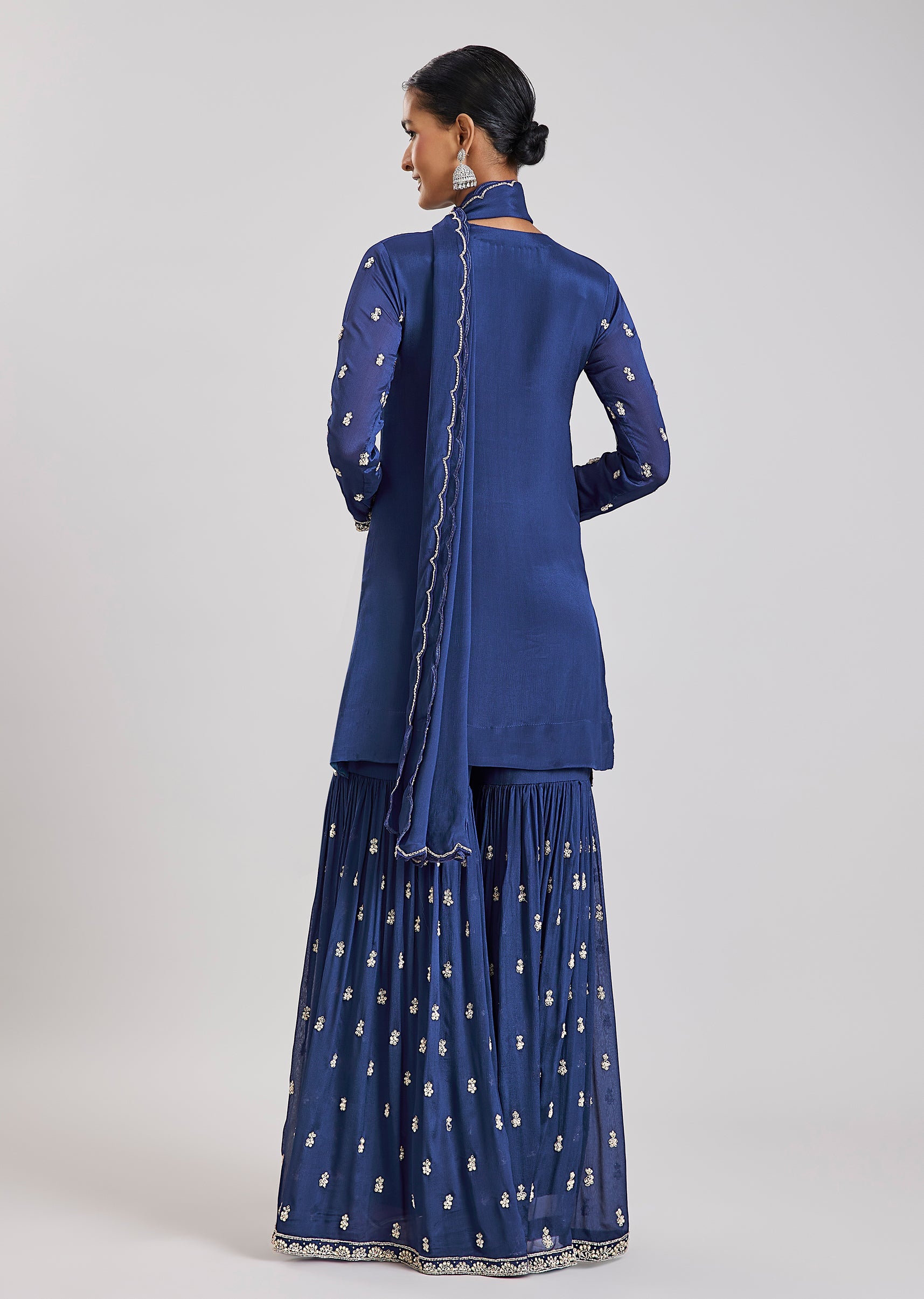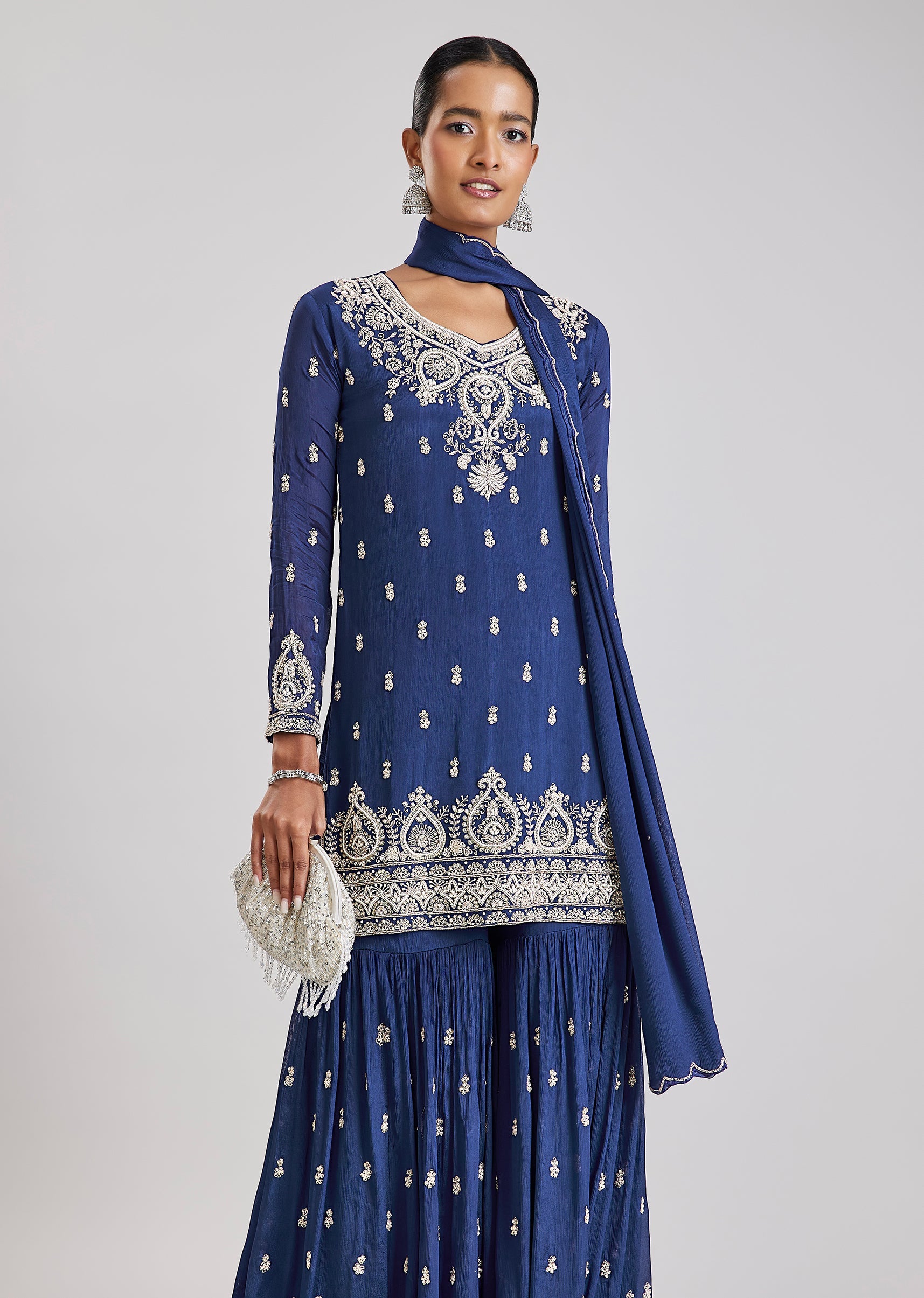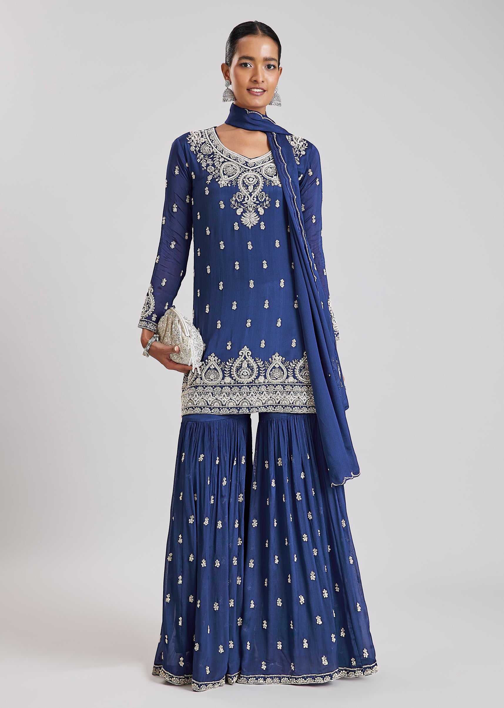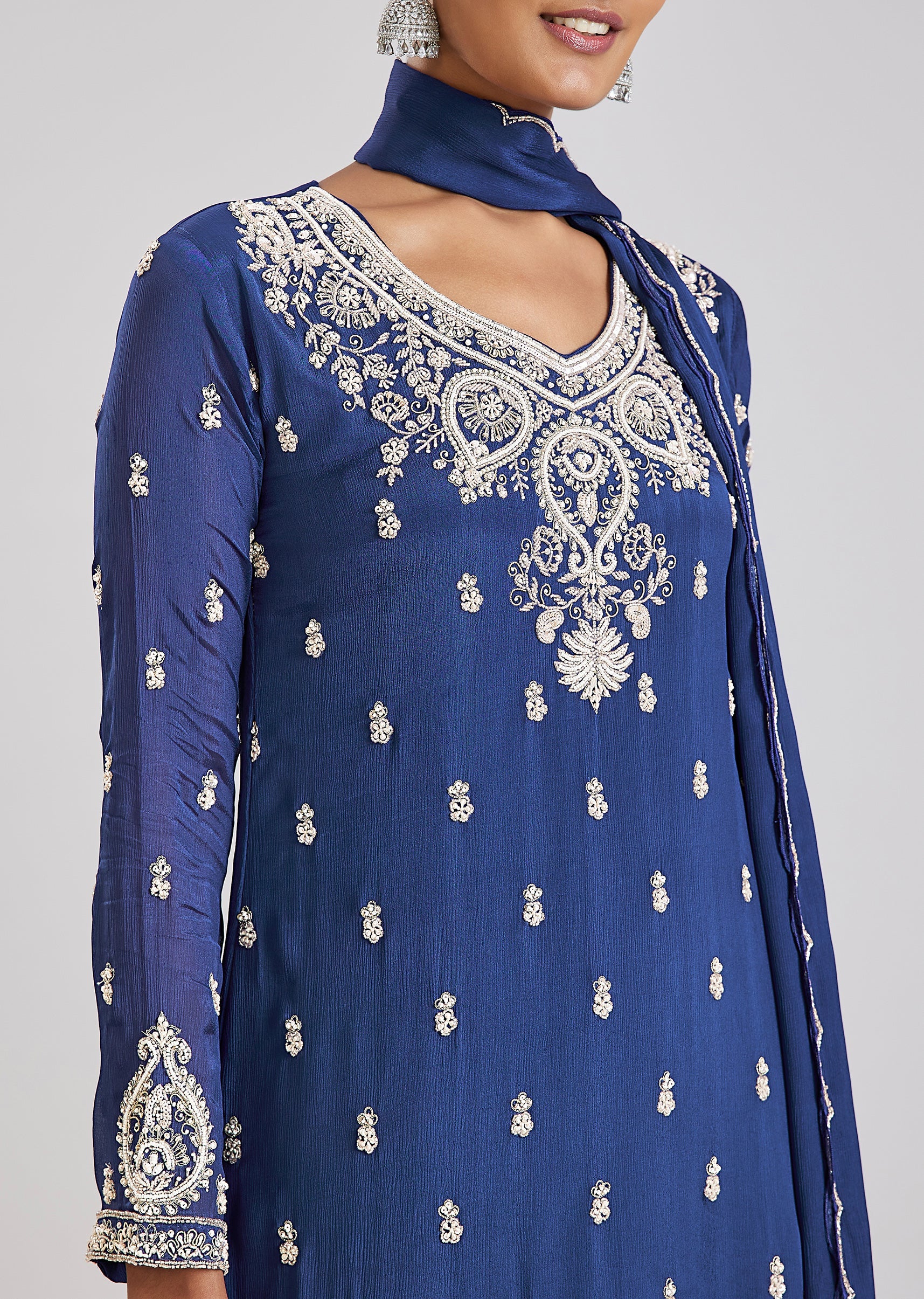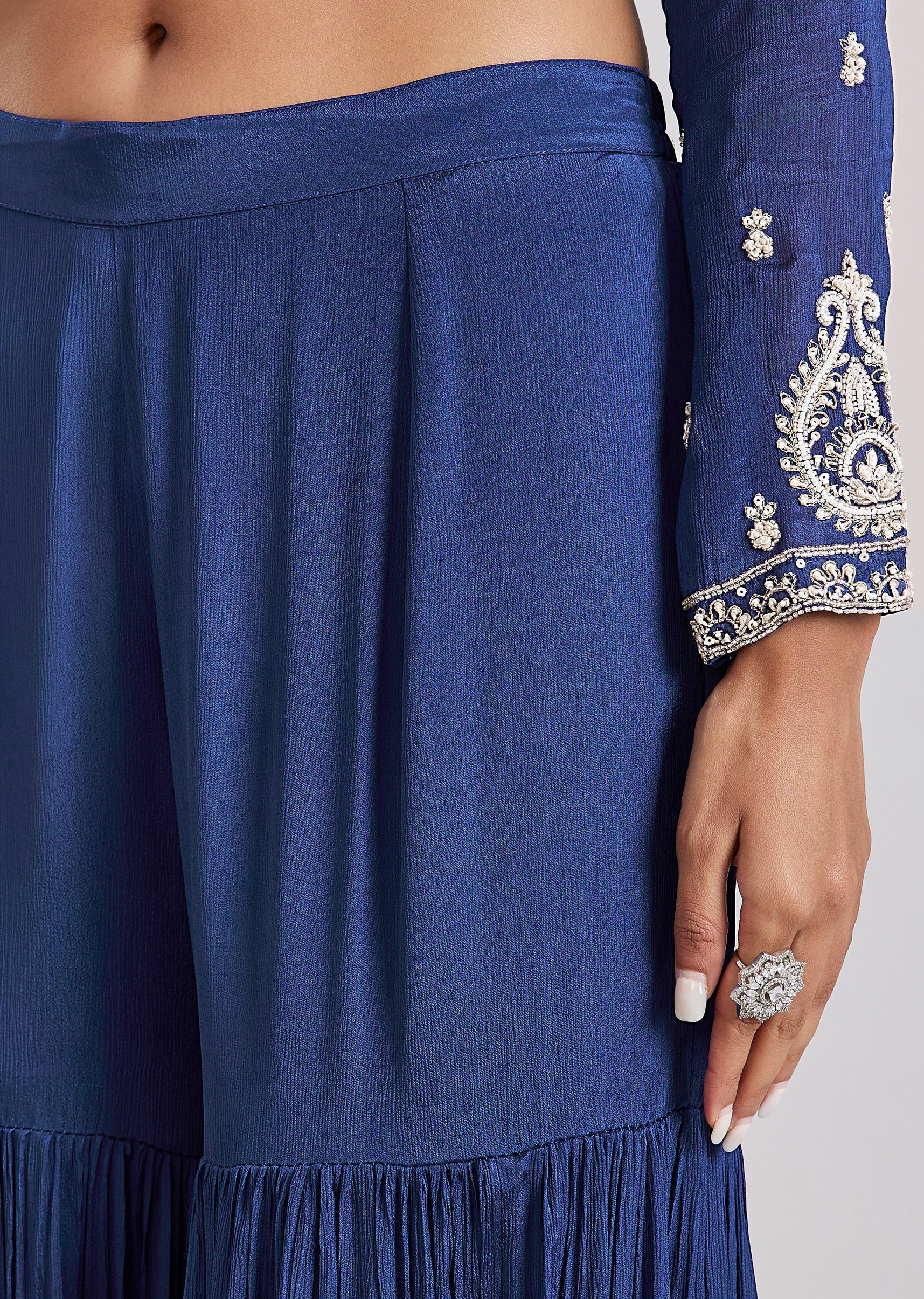 A refined choice for celebratory occasions, this blue sharara set features detailed cut dana and moti embroidery on the kurta that adds understated glamour. Crafted in flowing chinon fabric, the... More Product Details