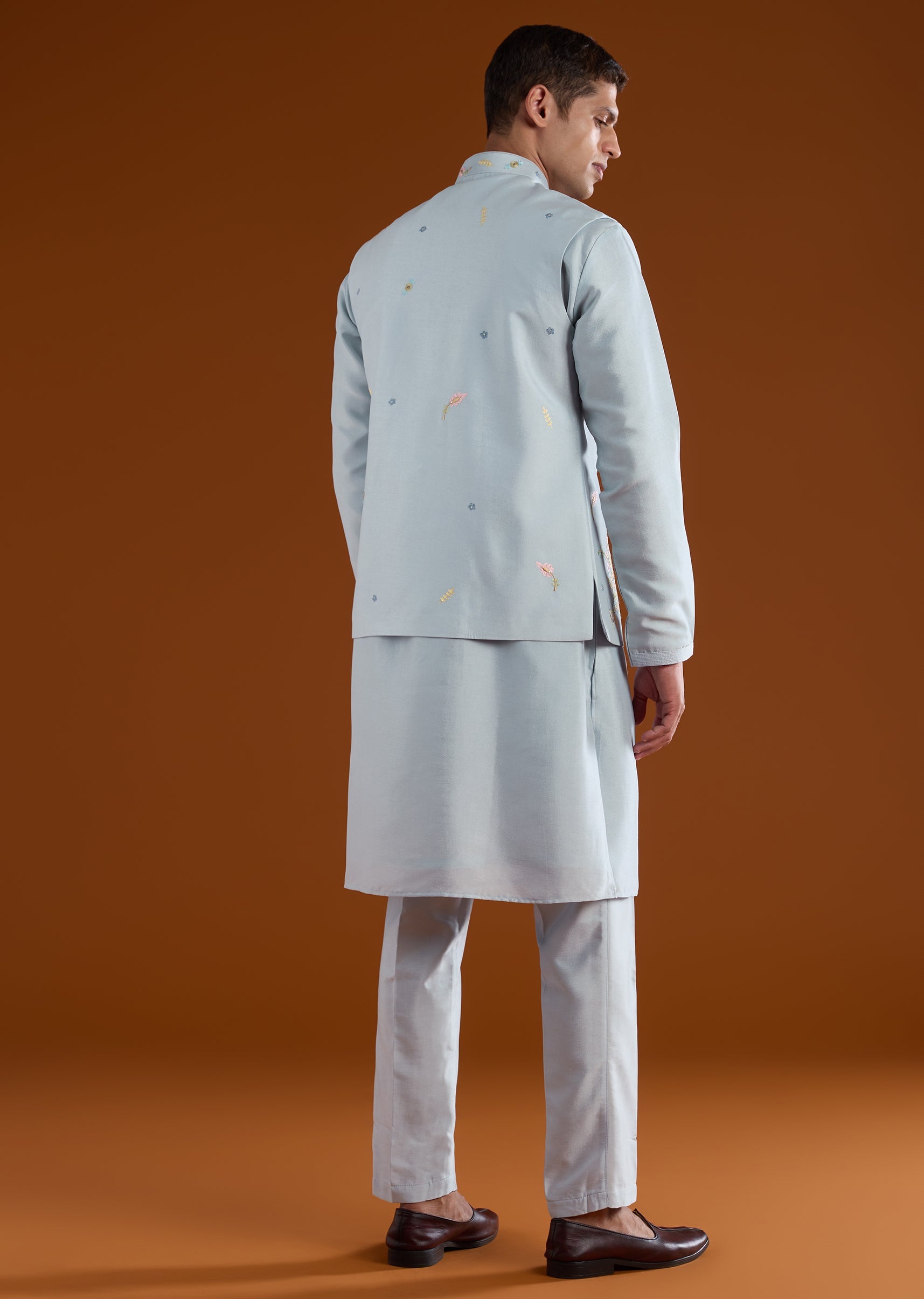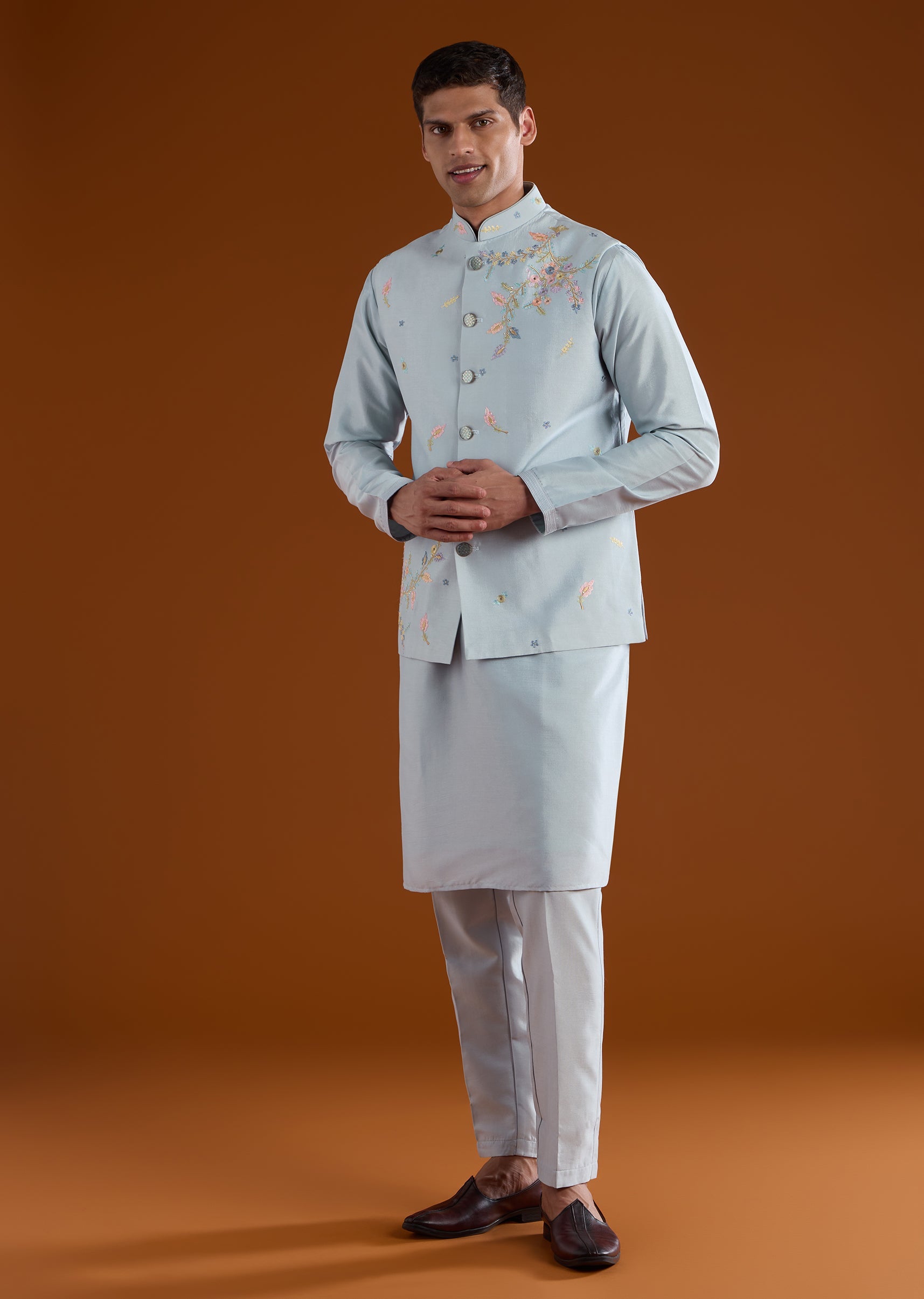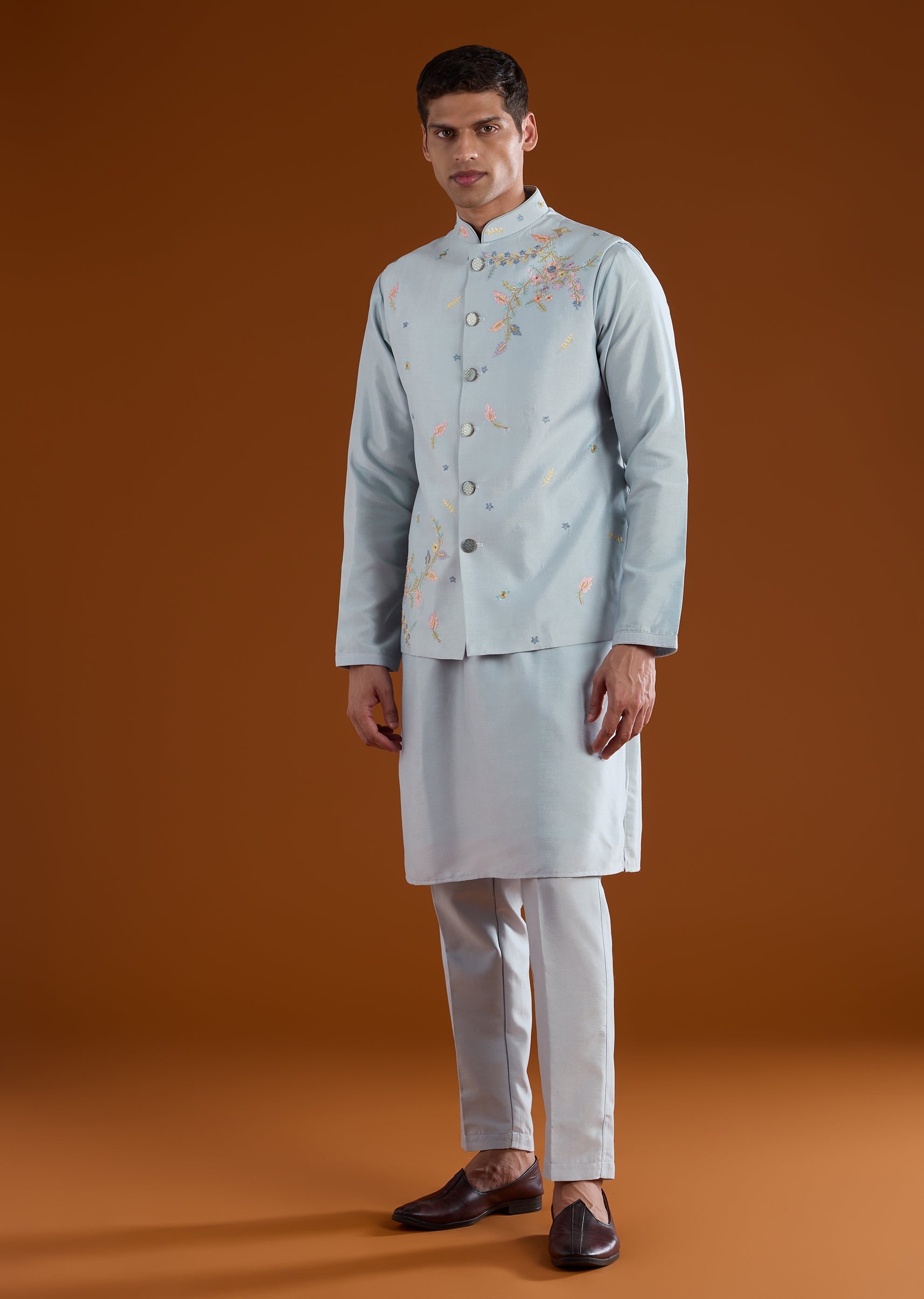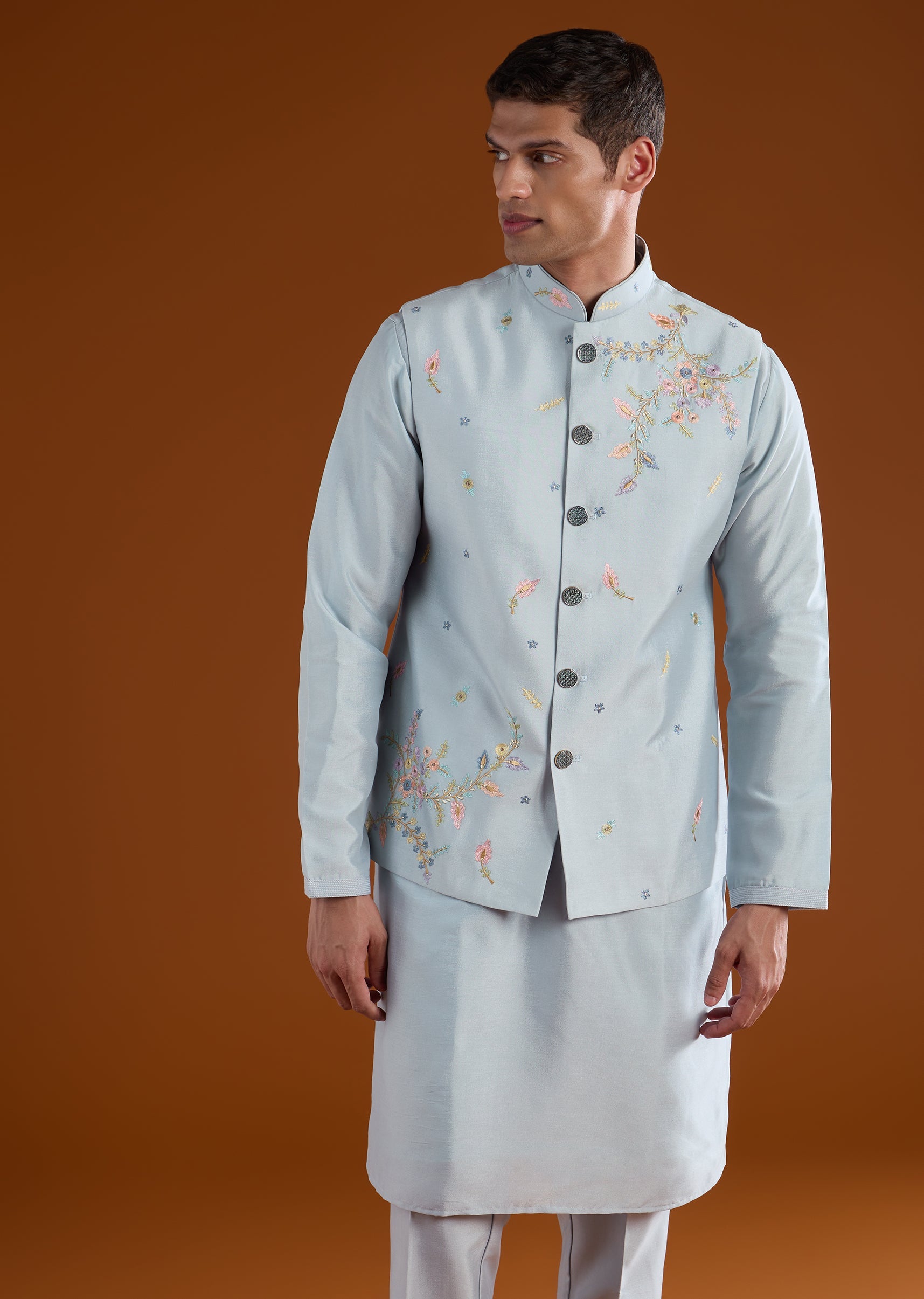 Classic and versatile, this blue kurta jacket set is crafted in smooth art silk for refined festive dressing. The kurta features a mandarin collar and full sleeves, paired with a jacket accented with delicate resham thread embroidery. Completed with straight-fit trousers and a partially elasticated waist, this ensemble suits festive gatherings and wedding events. Awarded as the Most Trusted Brand, we're delivering styles you love, just as promised.