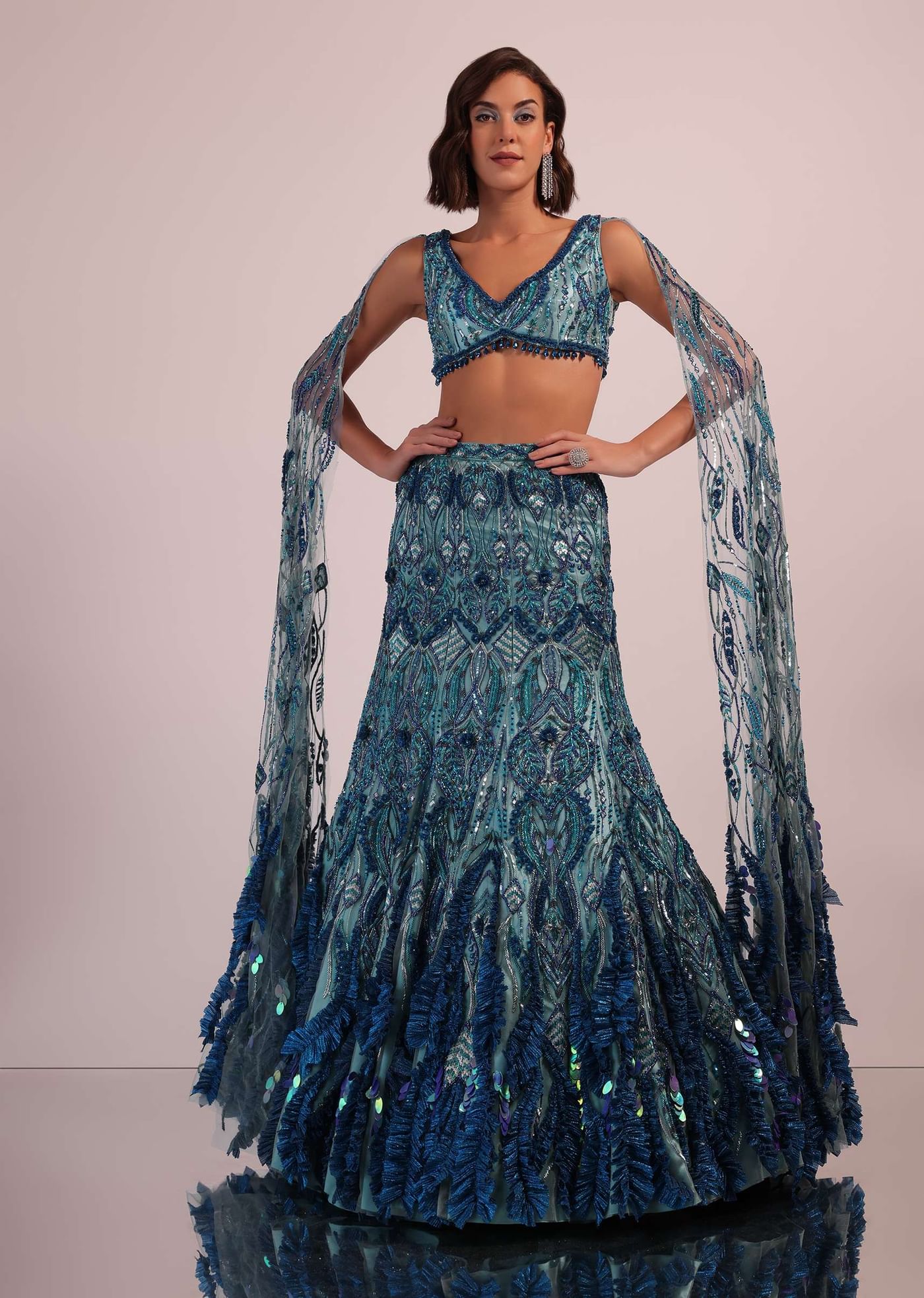 Blue Fish Cut Bridal Lehenga Set With Long Trail Sleeves And Heavy Embroidery
