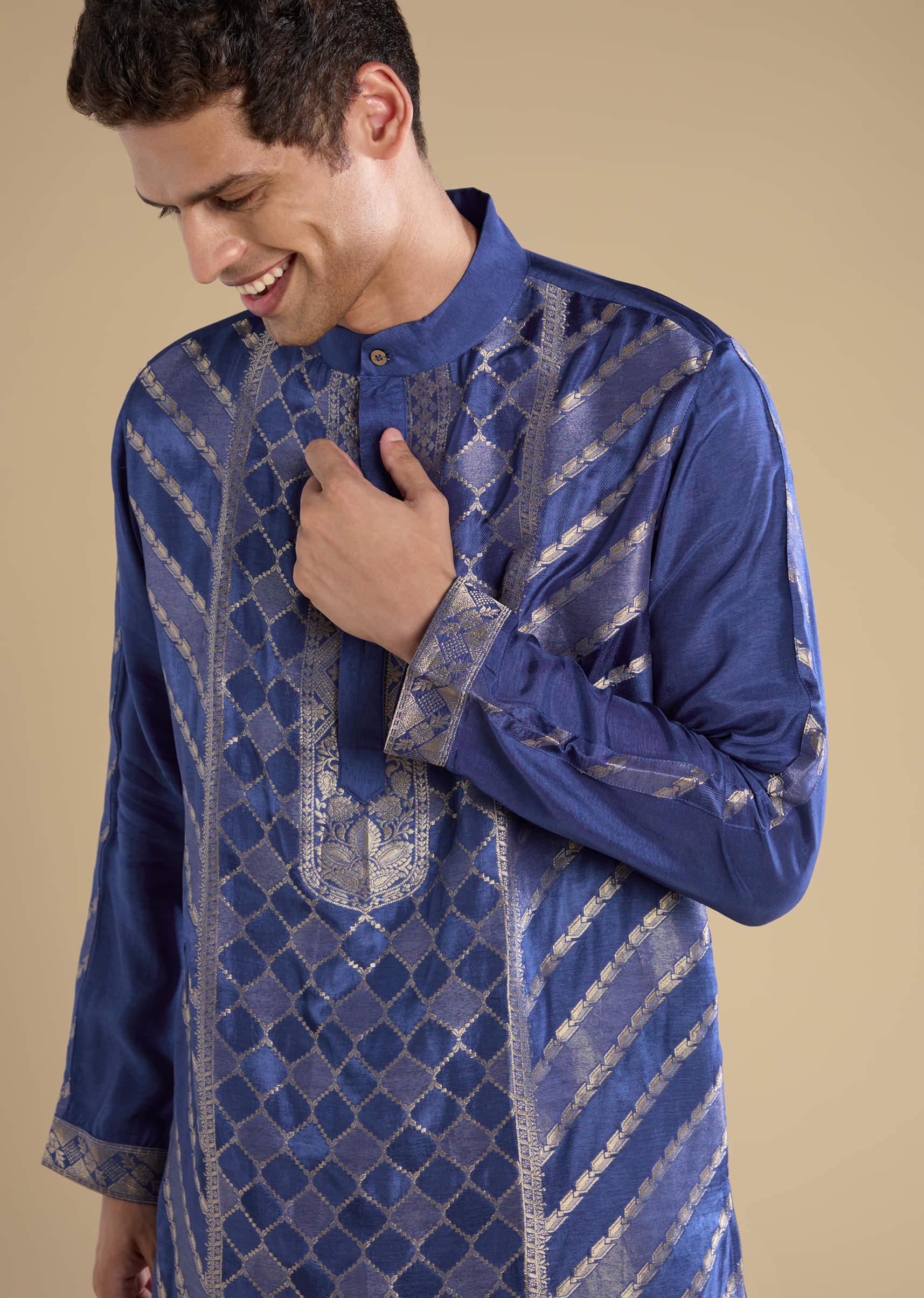Blue Handwoven Jacquard Silk Mens Kurta and Pant Set