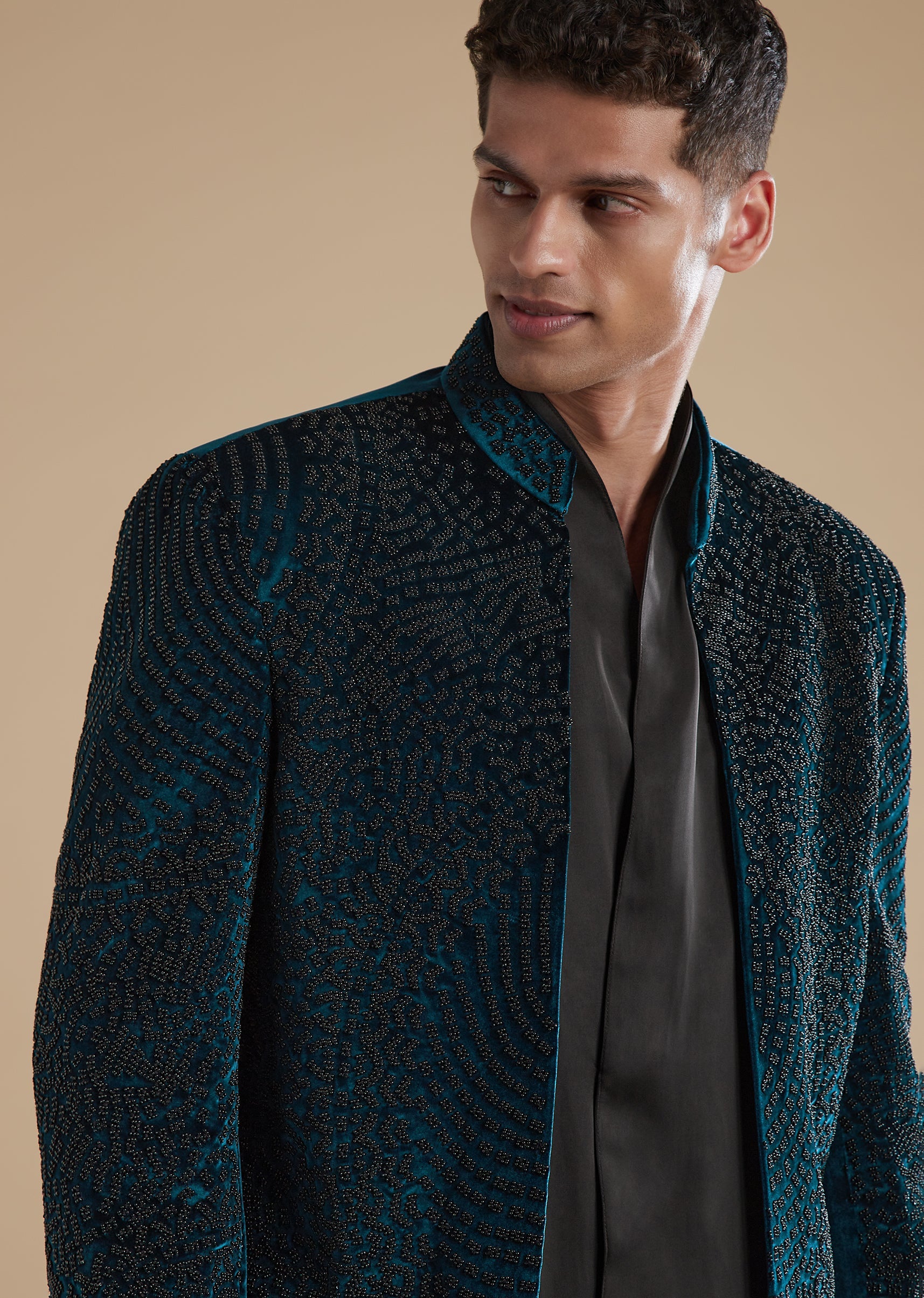 Crafted for modern festive elegance, this blue indowestern is tailored in premium silk with art silk as the secondary fabric, giving it a refined sheen ideal for sangeet and cocktail... More Product Details