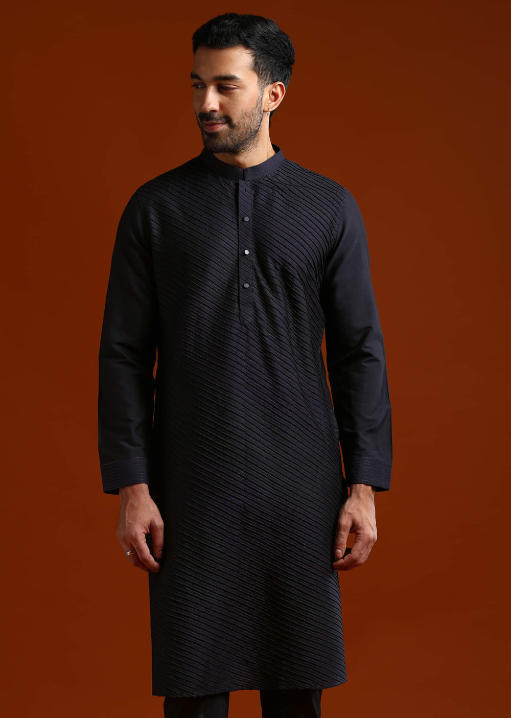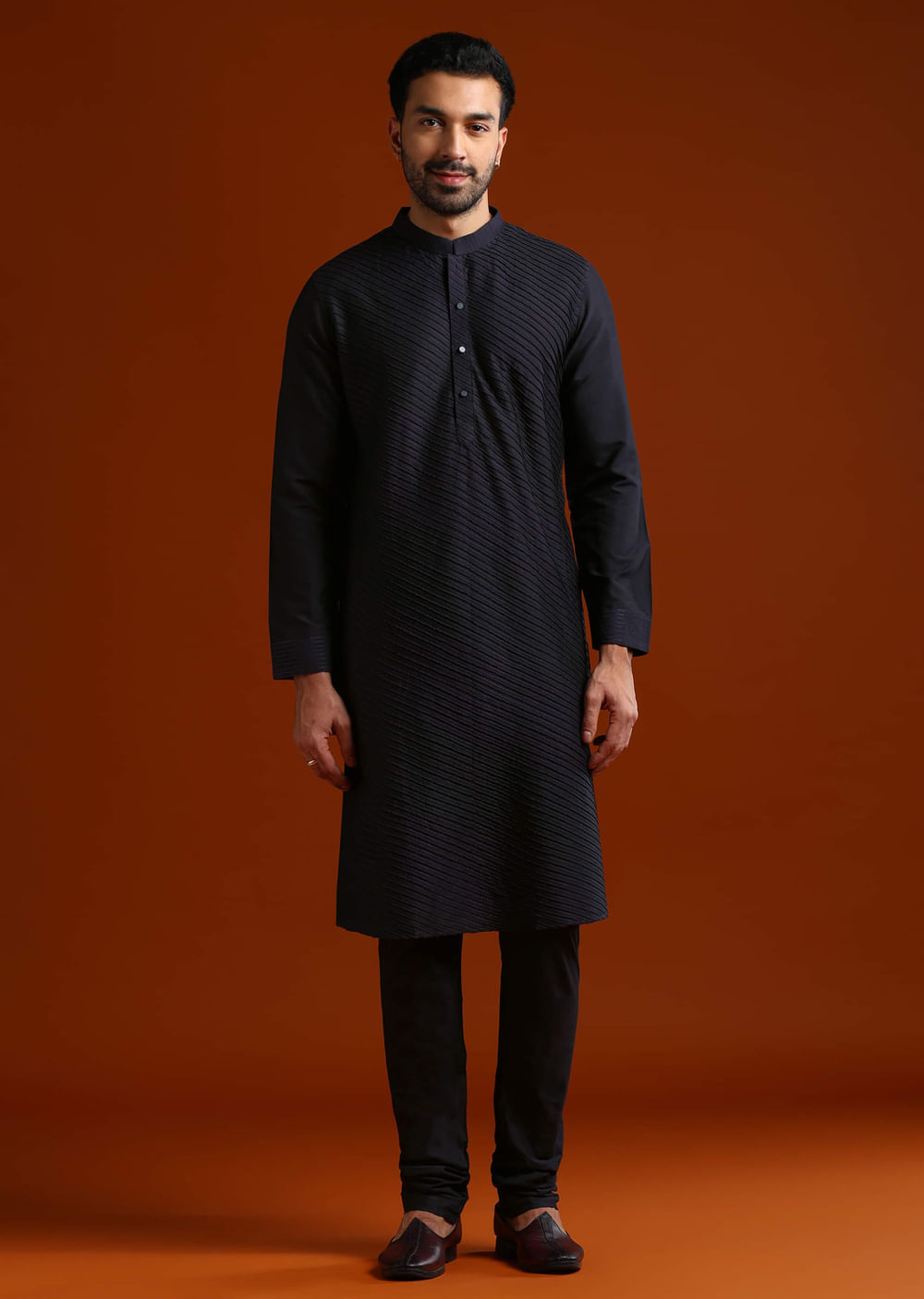 If you like texture without embellishment, this blue polyester men’s kurta set runs slim pintucks down the front for quiet definition. The colour holds strong indoors and out, keeping the look crisp all evening. You feel neat, confident, and event ready. Awarded as the Most Trusted Brand, we're delivering styles you love, just as promised.