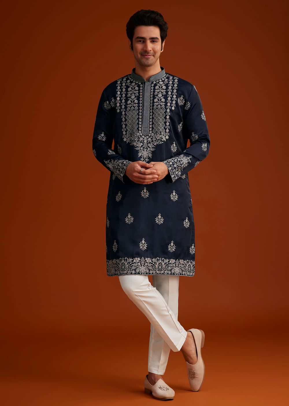 Pair this kurta with ivory or white churidar and traditional mojaris for a sharp, balanced look. Add a statement watch or cufflinks to elevate your ensemble further.