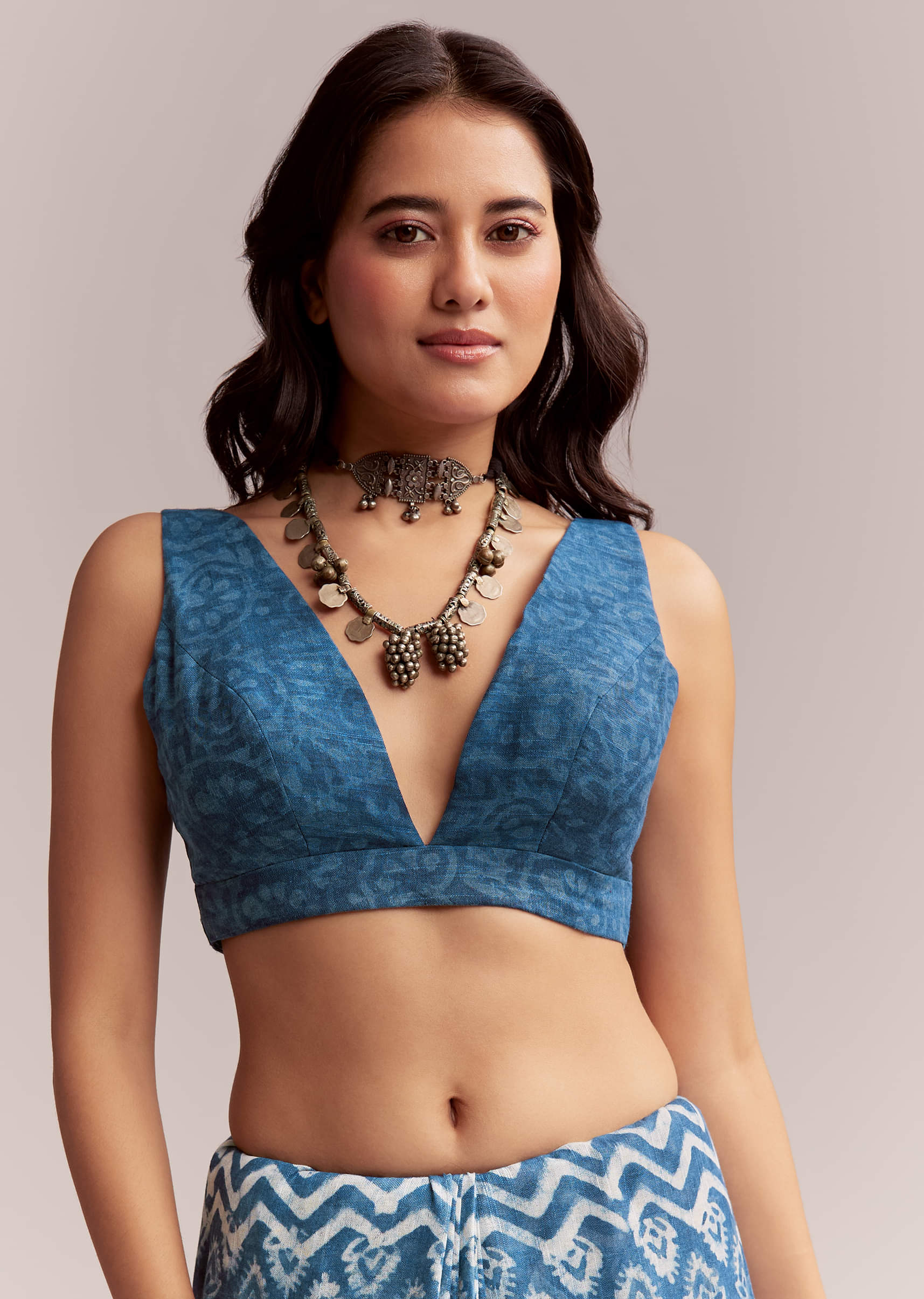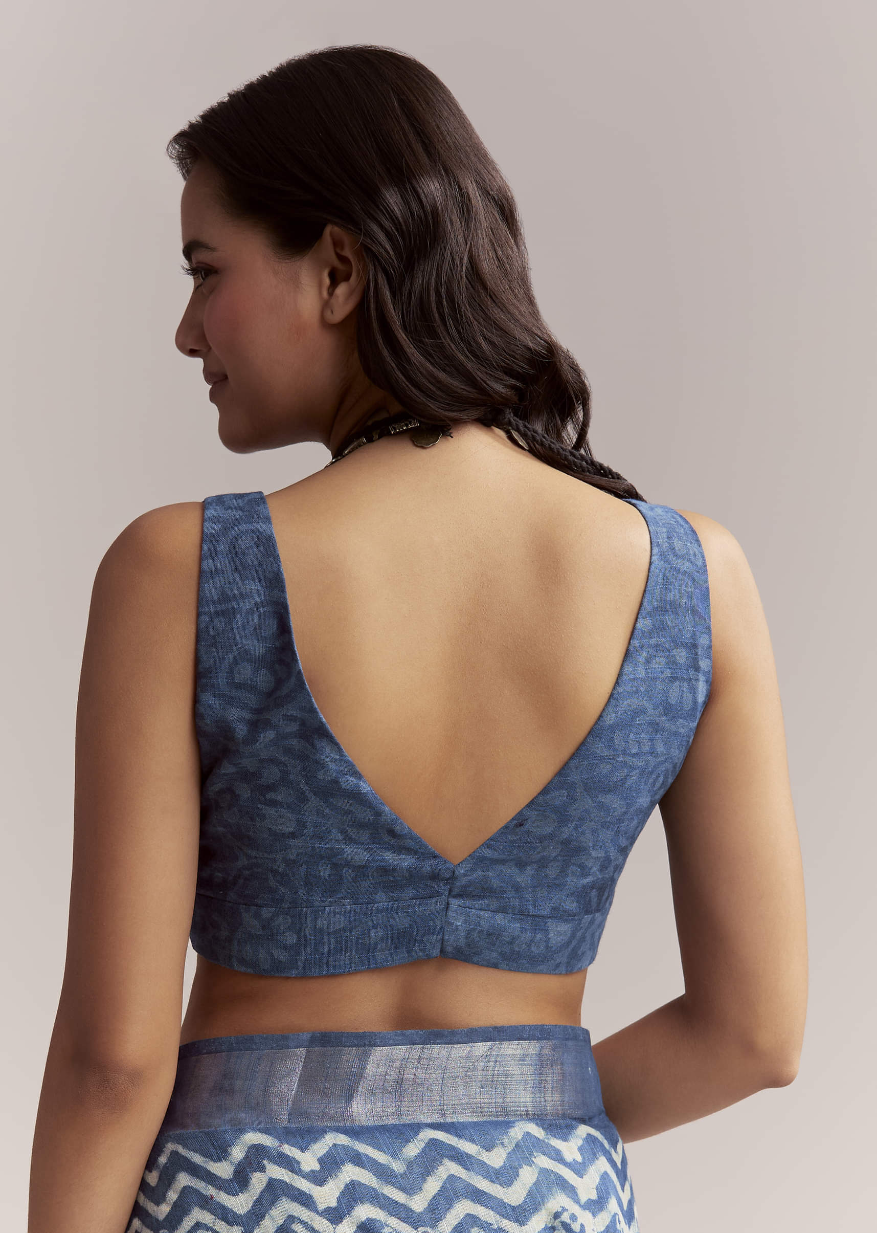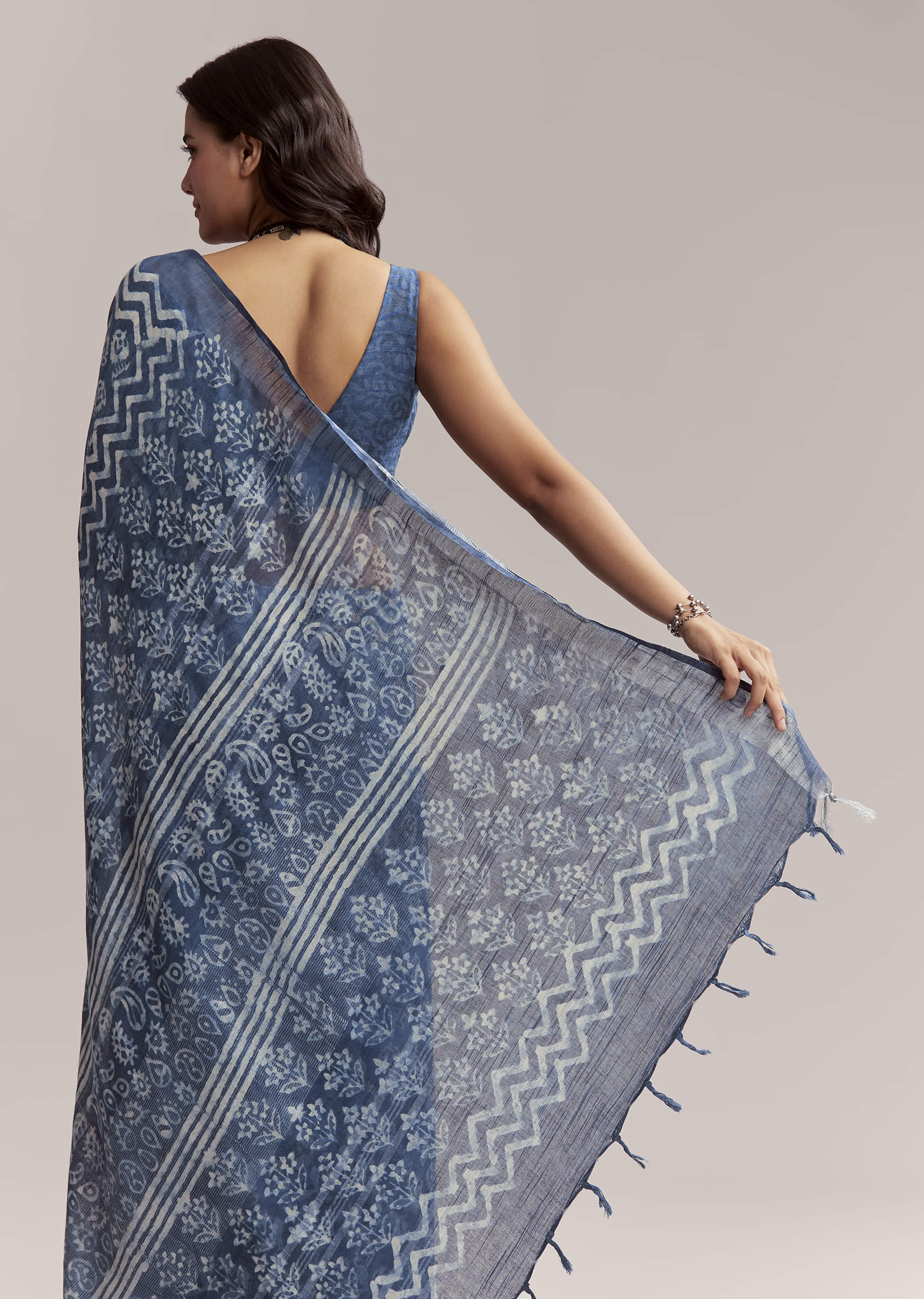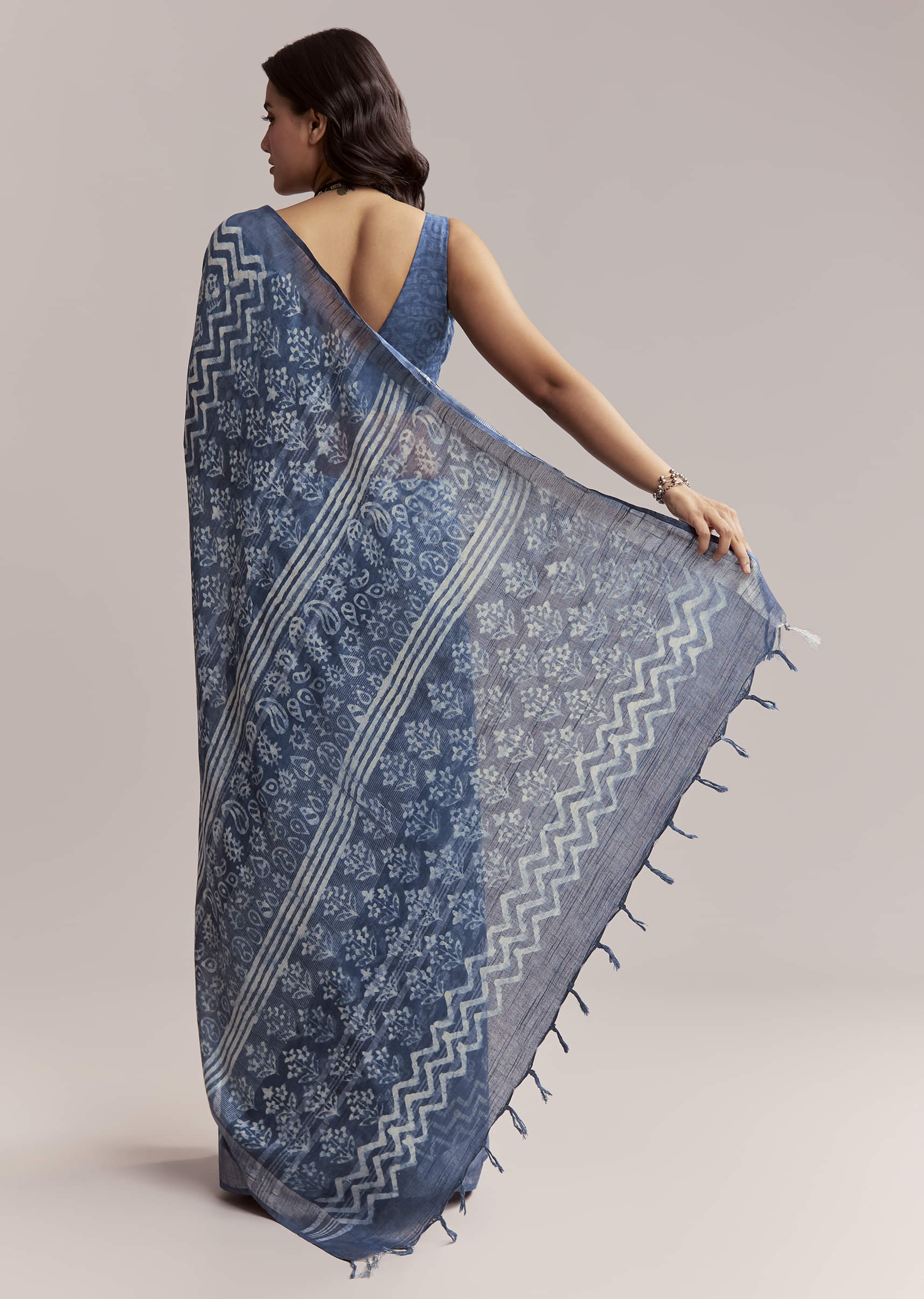 Crafted in blue, this linen saree features all-over Ajrakh block printing with leafy motifs and geometric detailing on the pallu. Every element draws from heritage dyeing techniques, finished in a grounded, natural palette. Blouse print may vary. Awarded as the Most Trusted Brand, we're delivering styles you love, just as promised.