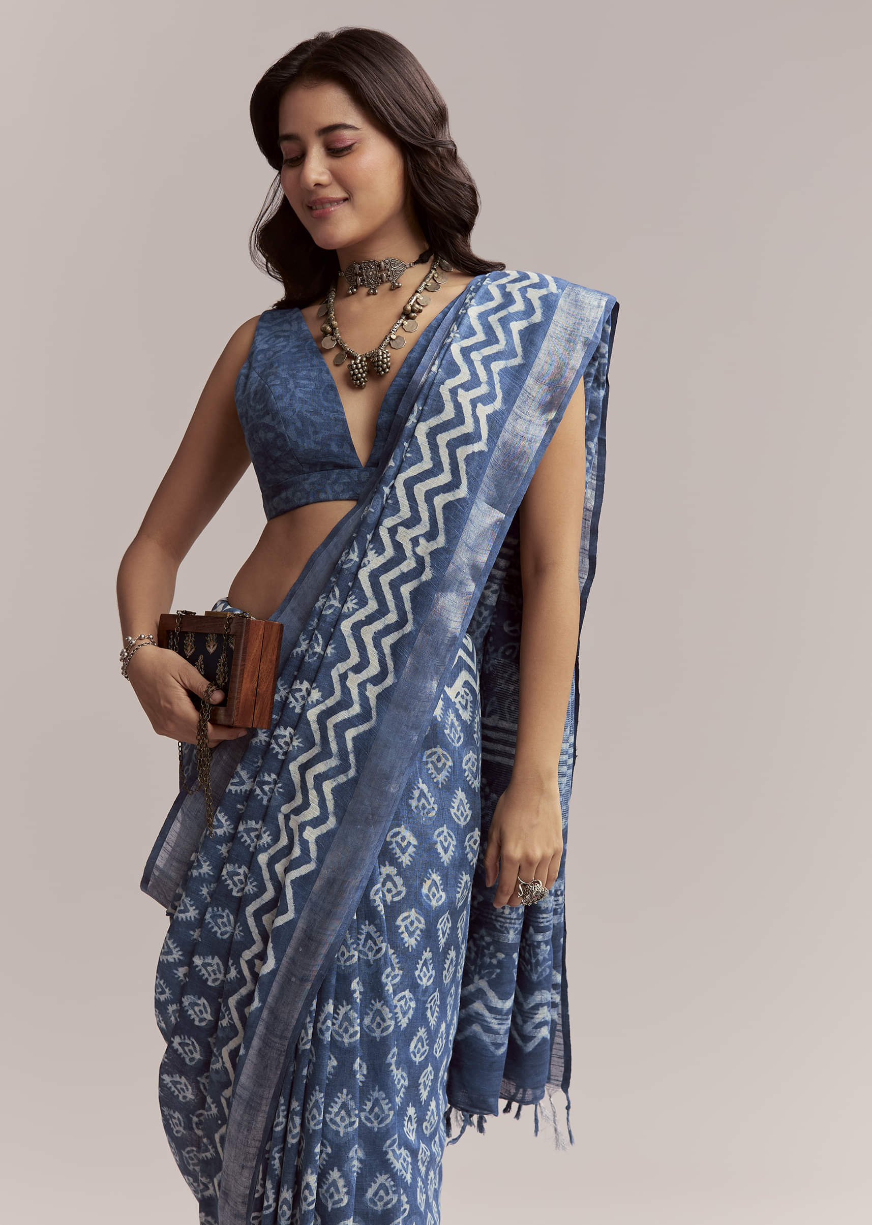 Blue Linen Printed Saree With Traditional Ajrakh Leaf Print