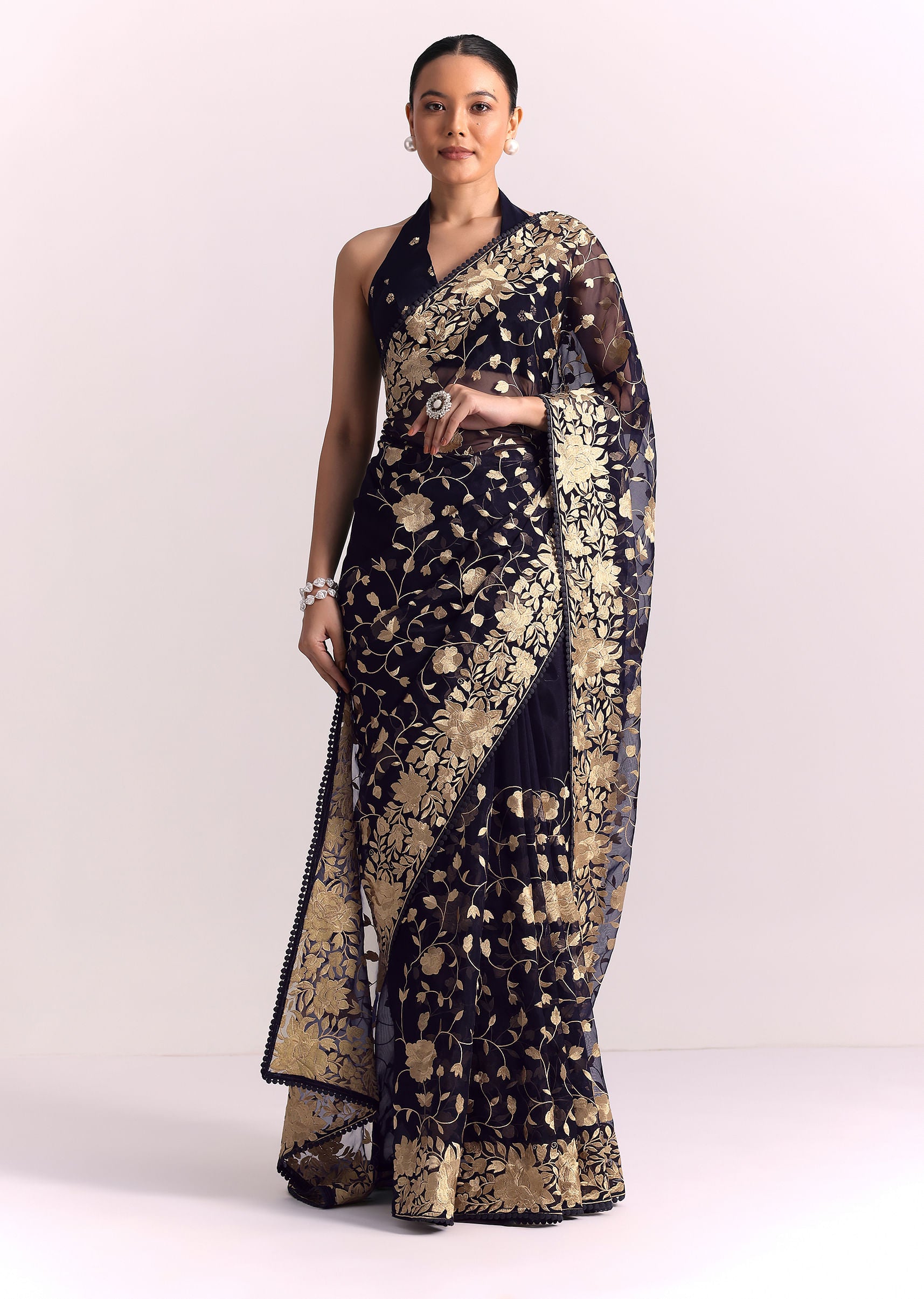 Step into a world of luxury and glamour with this breathtaking sheer organza saree. Featuring detailed parsi gara embroidery in hues of gold that add a touch of opulence to its sensous silhouette. Ideal for cocktail parties and celebrations this saree will help you embrace your aesthetic with finesse. Awarded as the Most Trusted Brand, we're delivering styles you love, just as promised.