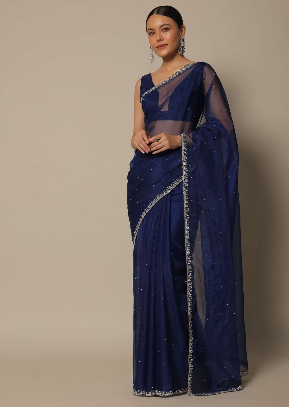 Blue Organza Saree With Stone Work And Unstitched Blouse Piece