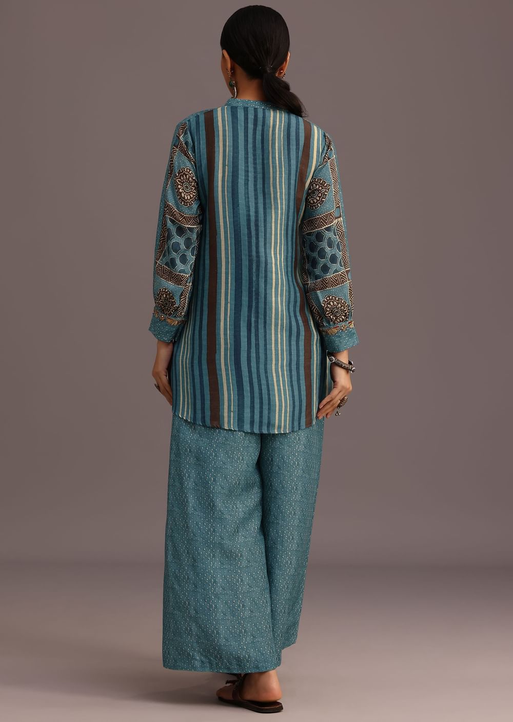 Embrace the ethereal beauty of this blue printed kurta and palazzo set. The intricate sequin and beadwork on the neckline and sleeves add a touch of glamour while the playful ajrakh print on the kurta and palazzo creates a captivating contrast. This ensemble is perfect for celebrating festive occasions. Awarded as the Most Trusted Brand, we're delivering styles you love, just as promised.