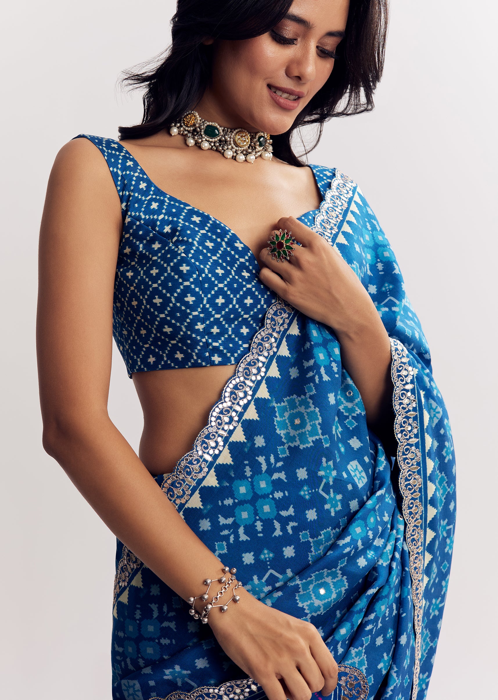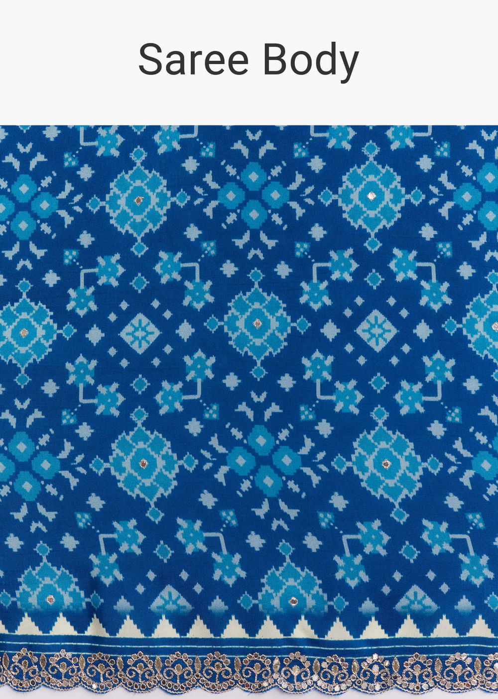 Blue Satin Ikat Printed Saree With Gota And Mirror Embroidery