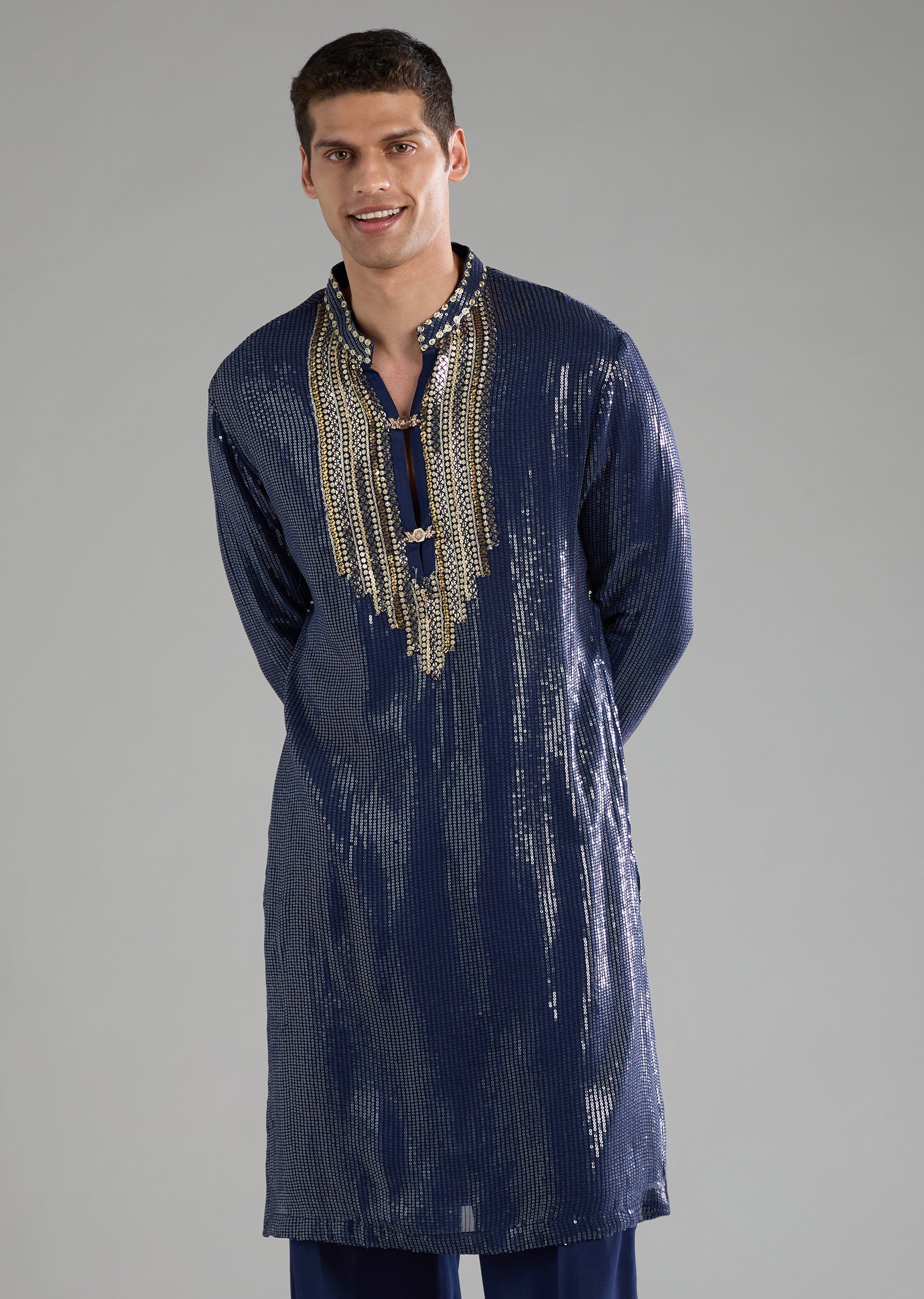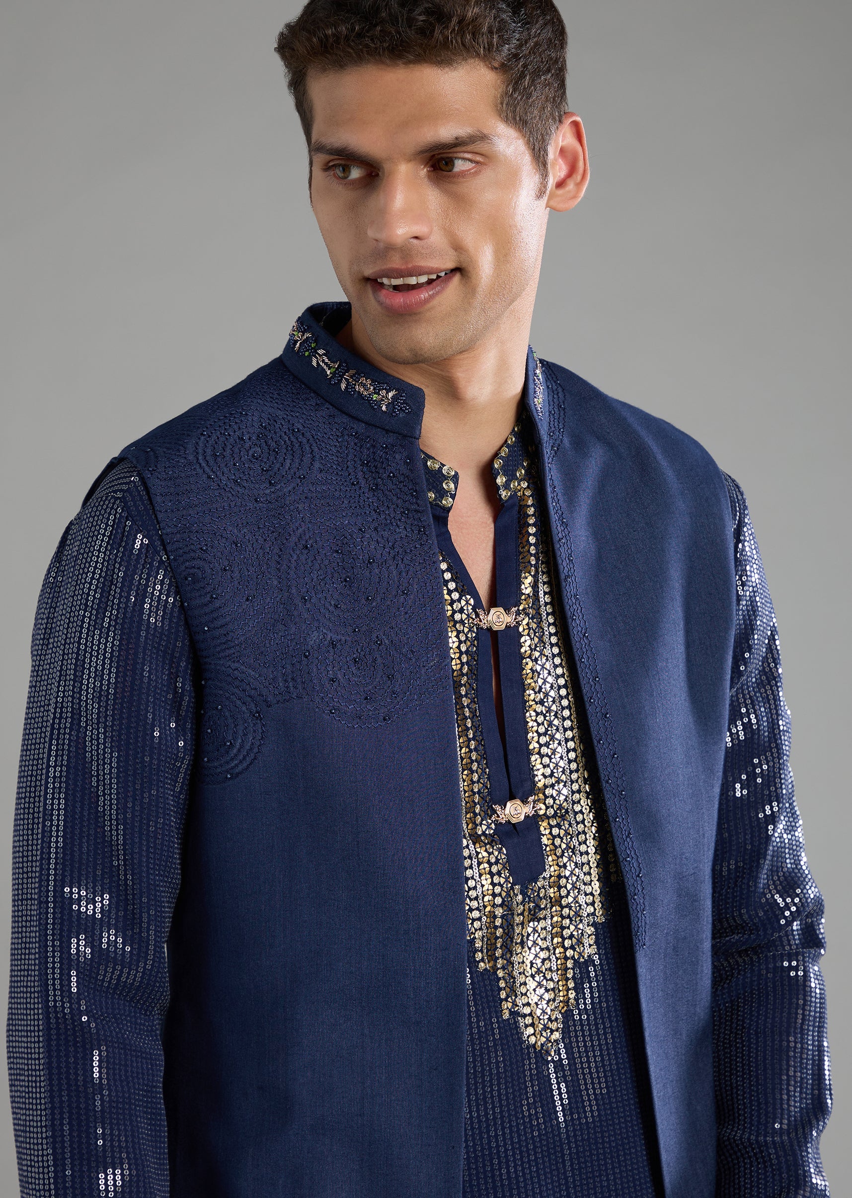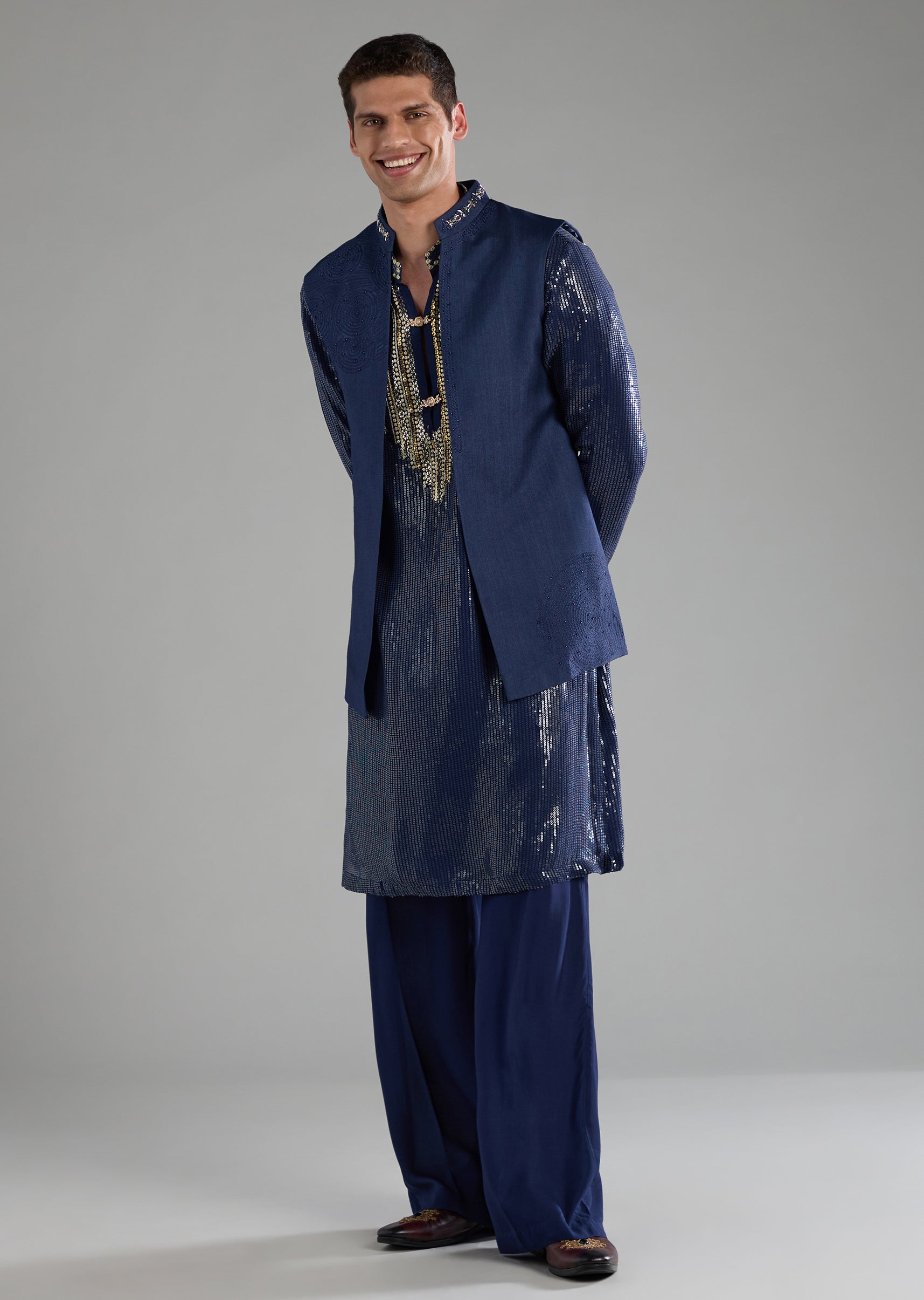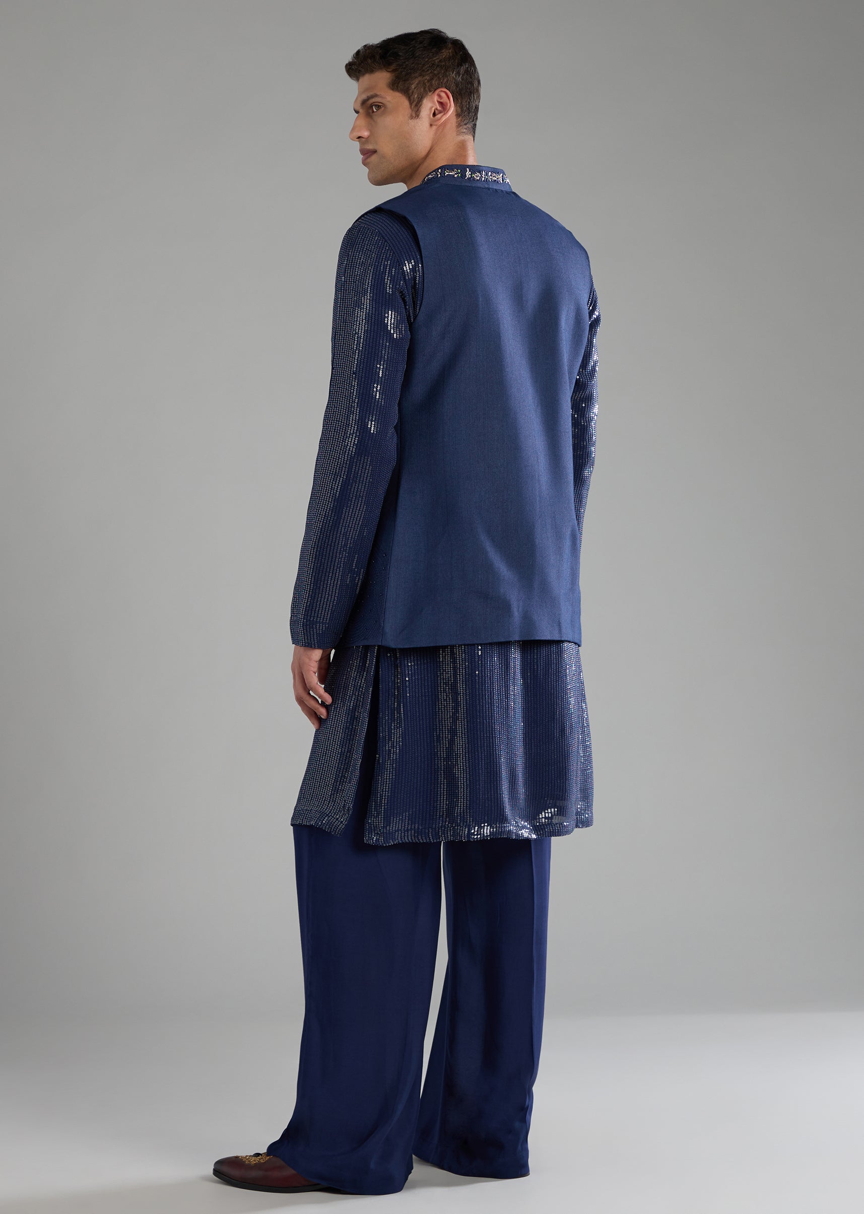 Blue Sequin Embellished Mens Jacket Kurta Set