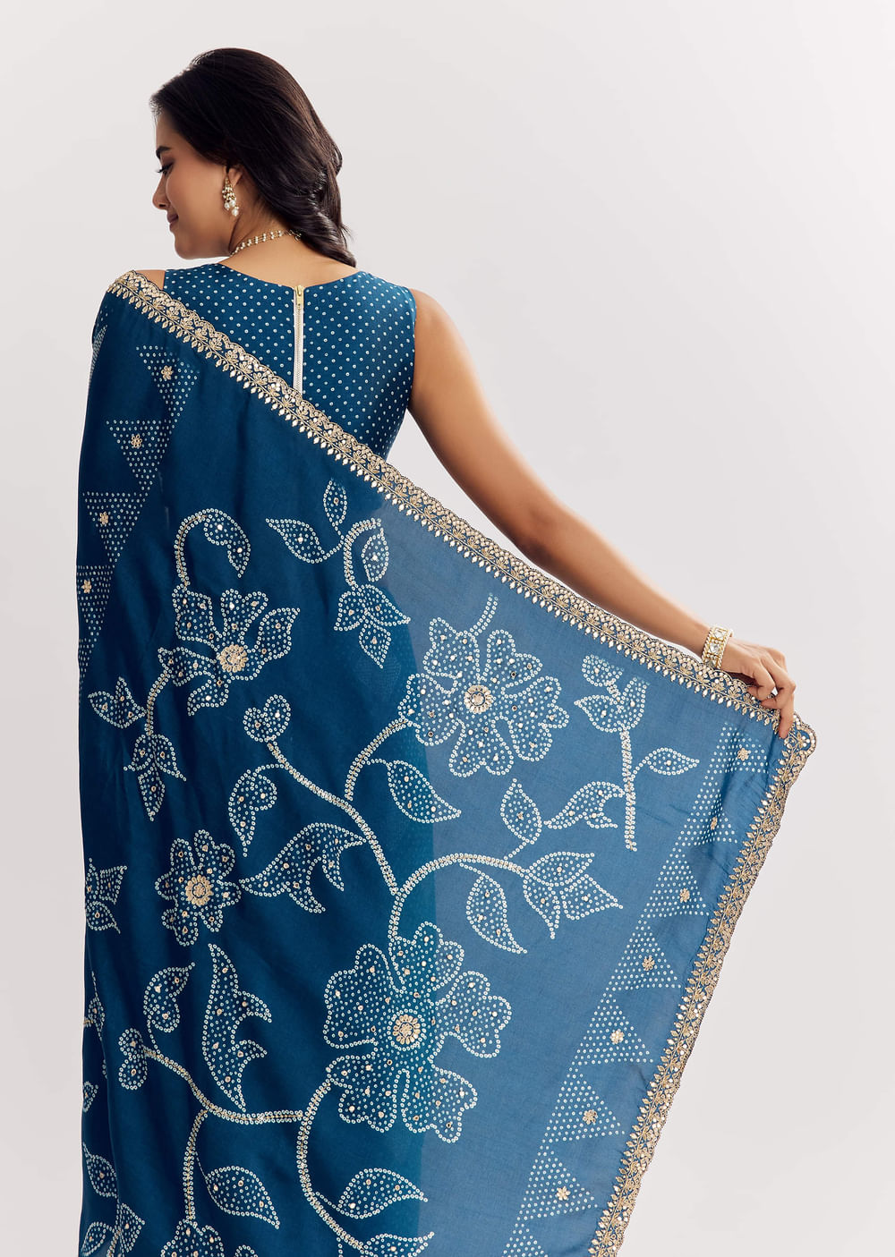 Like waves at dusk, this blue shaded muslin saree shimmers with gota, mirror, zari, and sequins embroidery set in a scalloped border. Awarded as the Most Trusted Brand, we're delivering styles you love, just as promised.