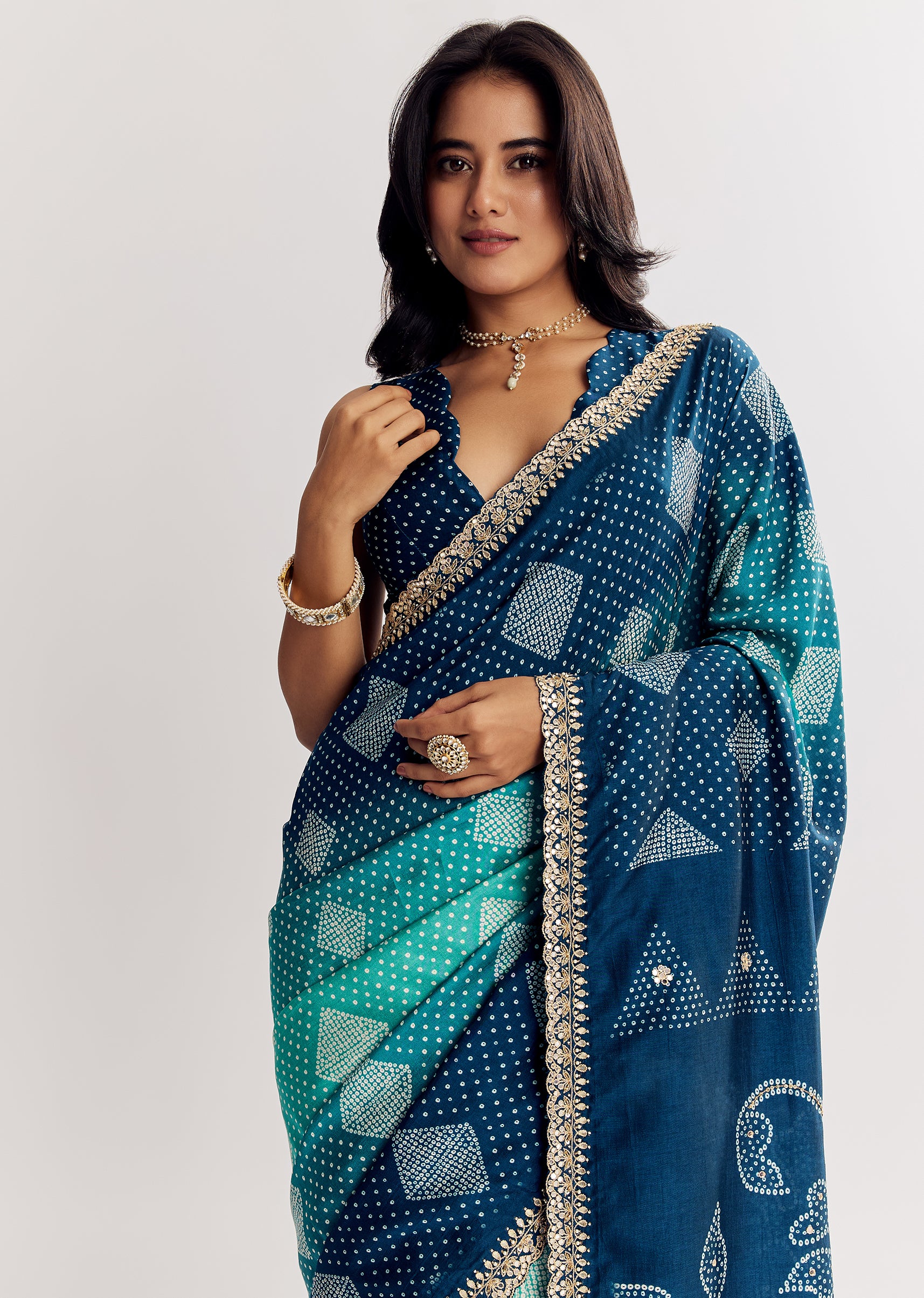 Like waves at dusk, this blue shaded muslin saree shimmers with gota, mirror, zari, and sequins embroidery set in a scalloped border. Awarded as the Most Trusted Brand, we're delivering... More Product Details