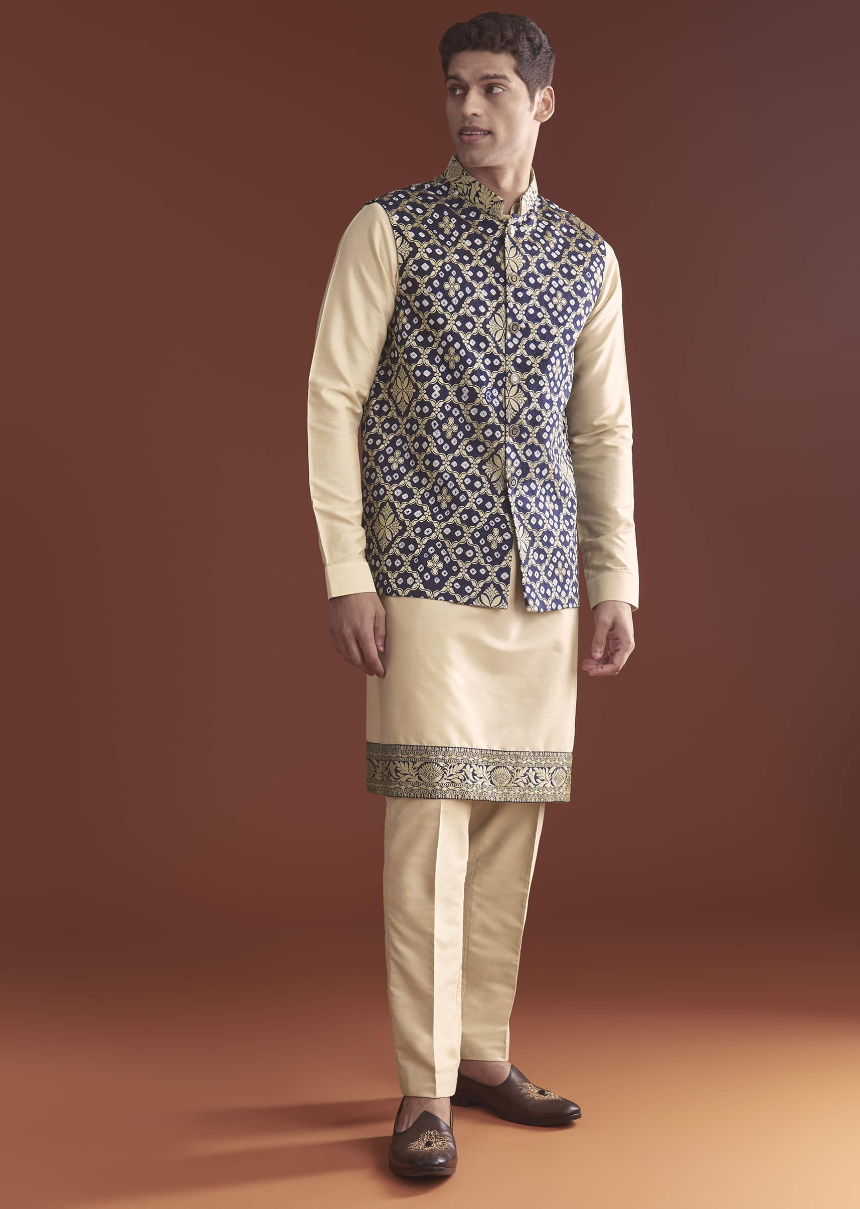Fit Tips:Expect a structured shoulder on the jacket with a comfortable taper, and a straight, airy kurta that layers without bulk.