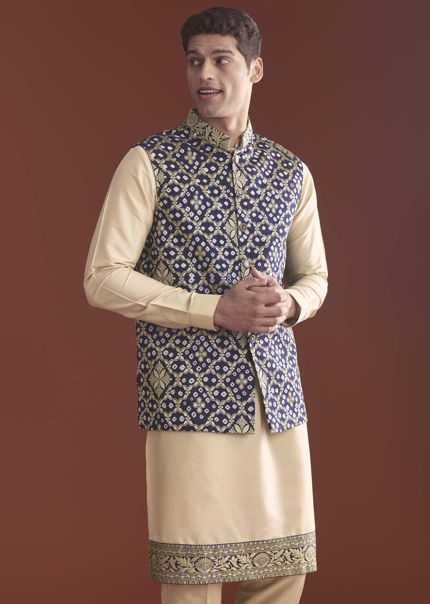 Clear colour meets pattern as this blue art silk men’s kurta jacket set works bandhani print and crisp geometric motifs over a structured jacket. The contrast photographs neatly under evening lights. You feel sharp, lively, and ready for festive gatherings. Awarded as the Most Trusted Brand, we're delivering styles you love, just as promised.