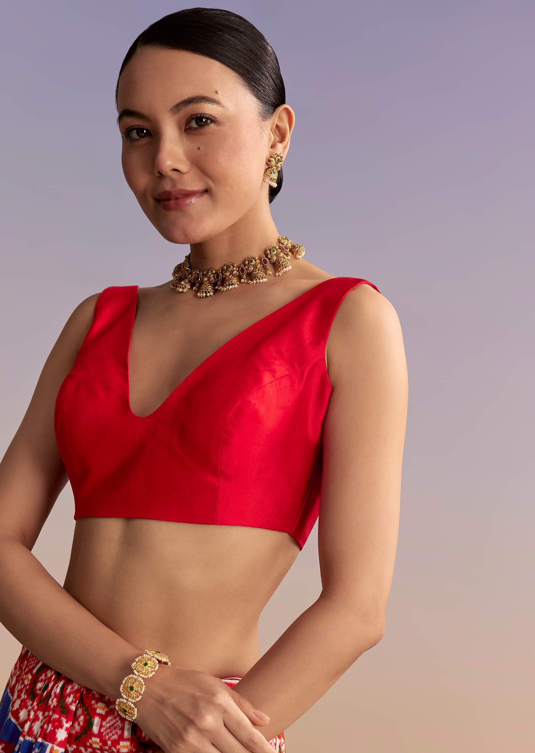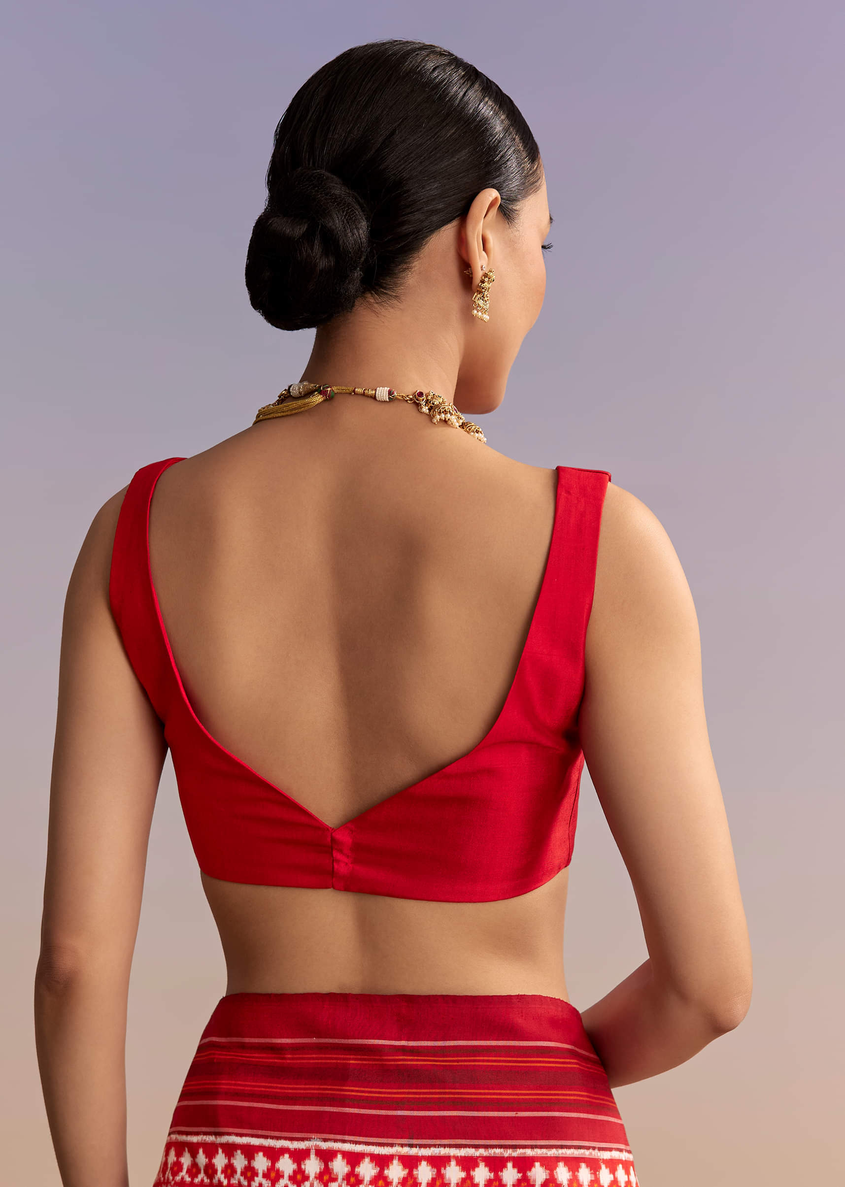 Opt for minimal kundan studs, smooth hair, and block heels, and keep accessories clean to let the weave shine.