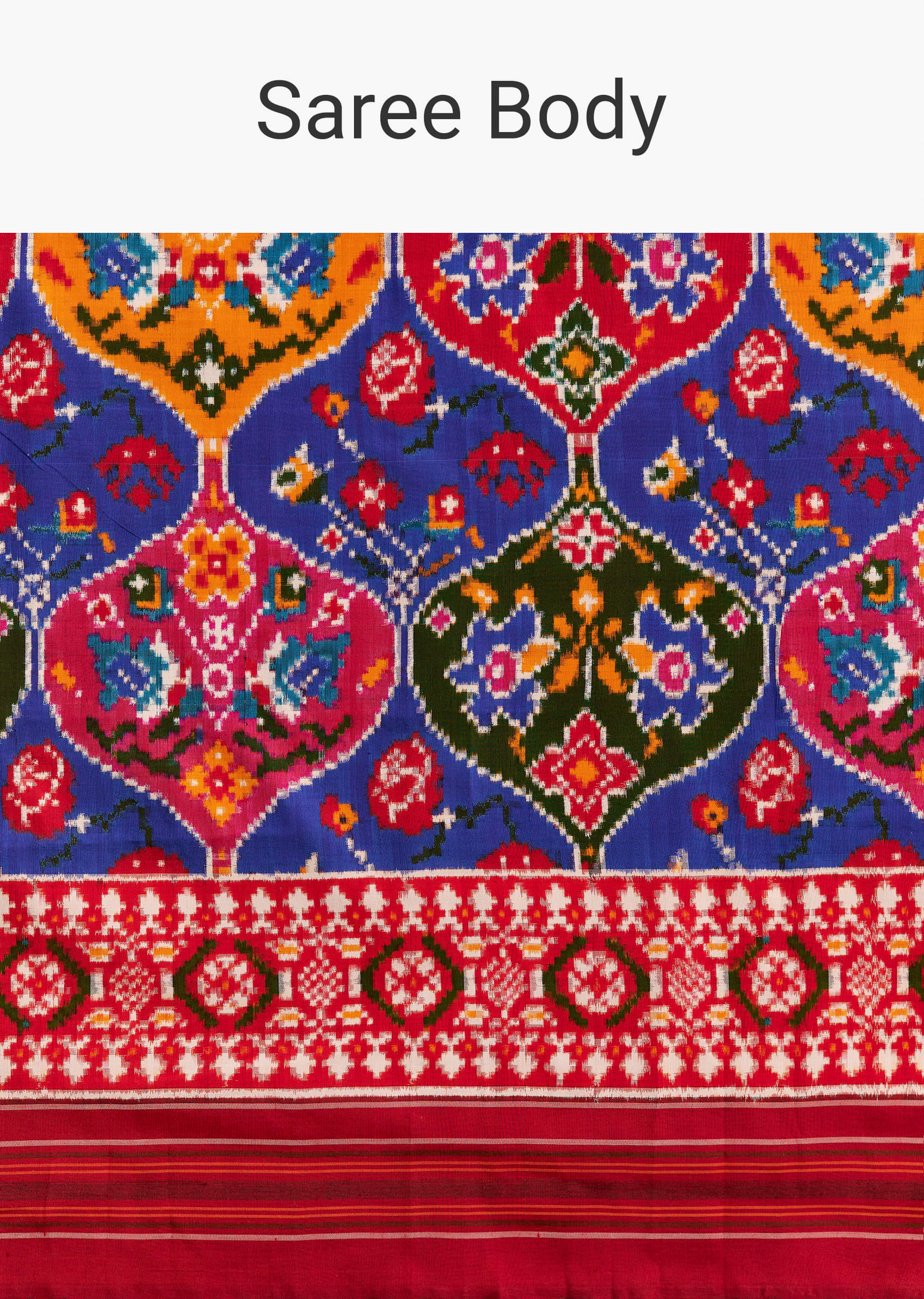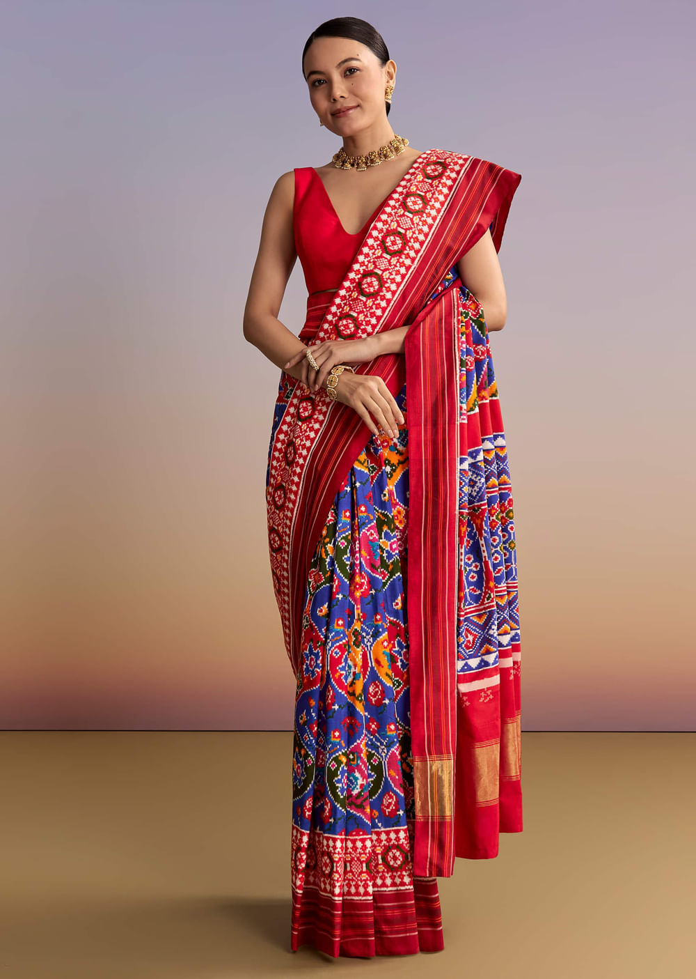 Colour play meets craft in this red and blue silk handwoven Patola saree. Double Ikkat weaving showcases multicolour floral and geometric motifs with incredible precision. It is made for big... More Product Details