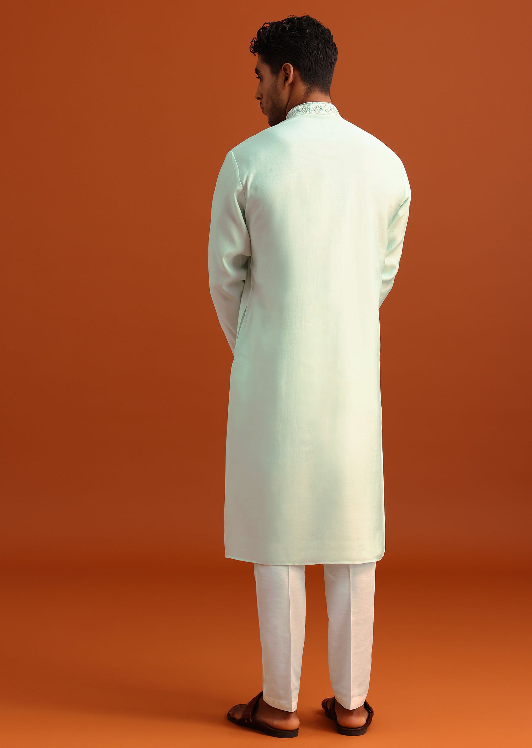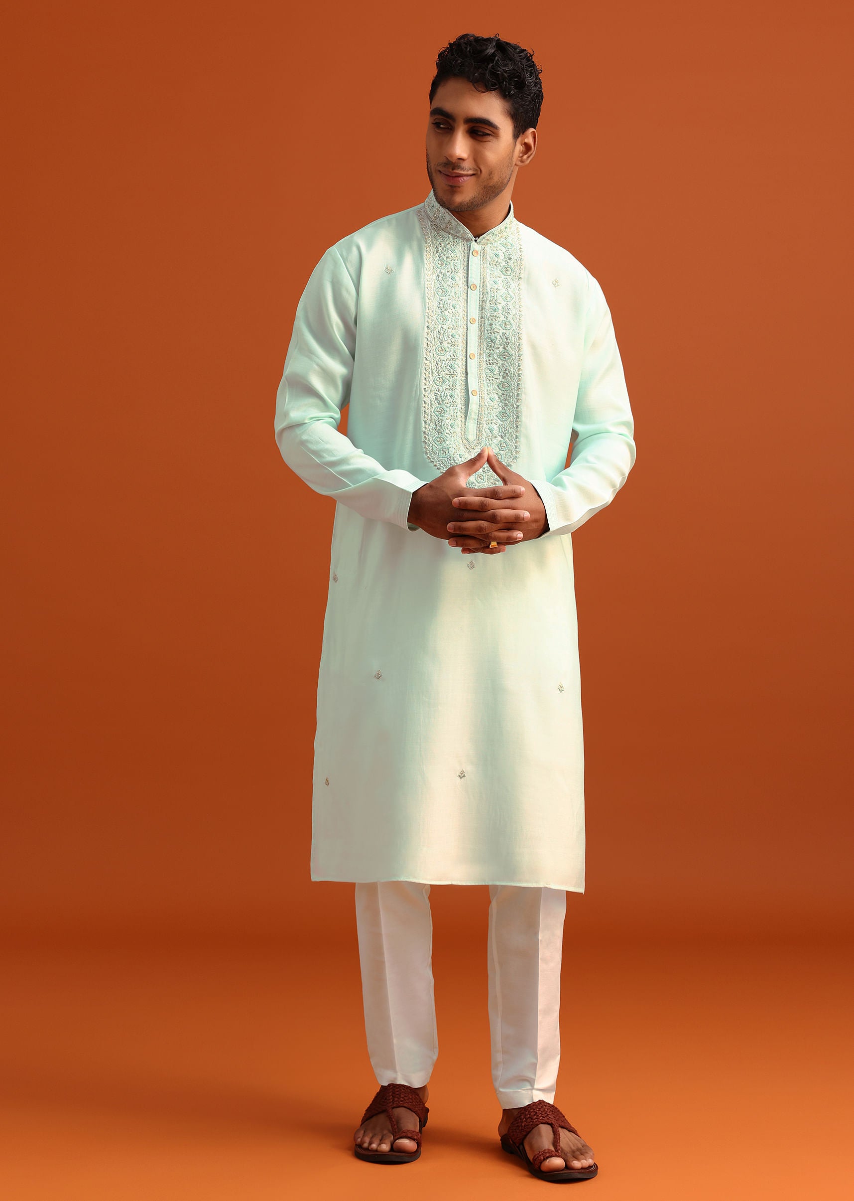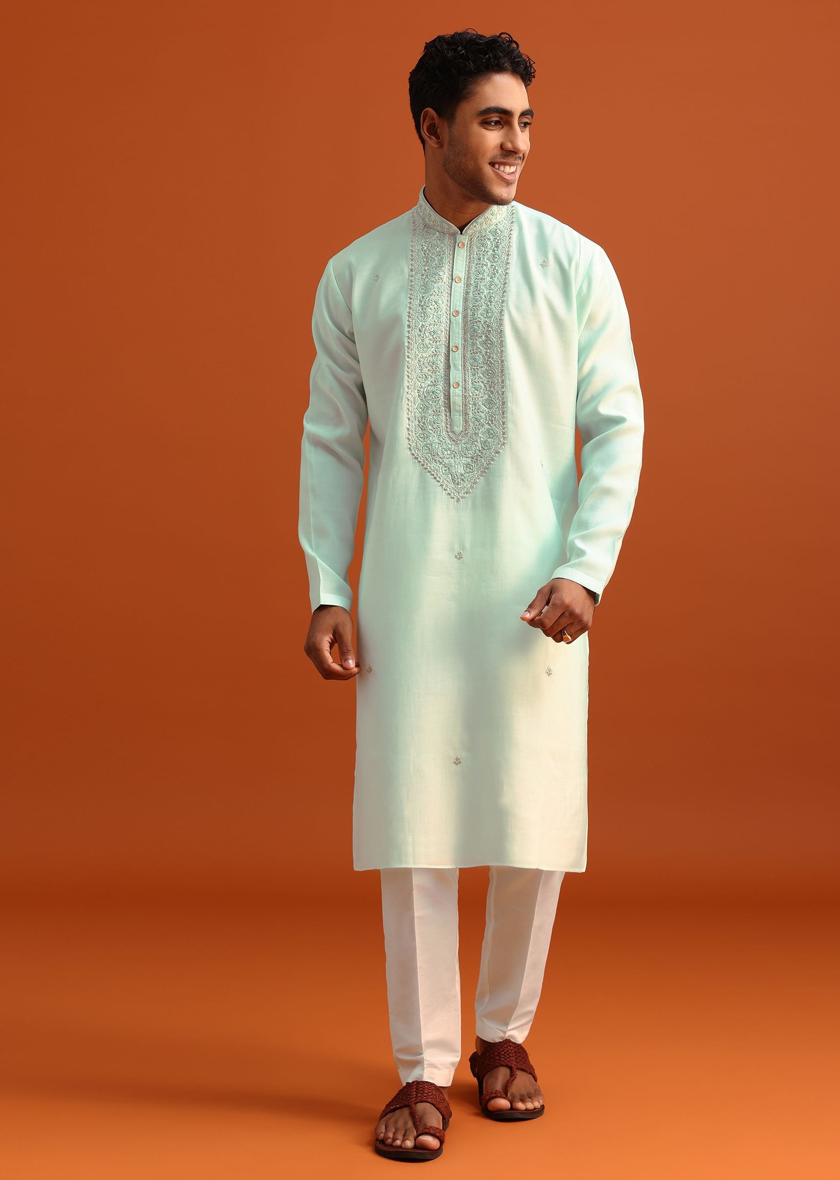 Balancing traditional artistry and modern design is this serene blue kurta and pant set. Crafted from opulent silk, the kurta is enriched with intricate hand embroidery on the yoke. Featuring a refined mandarin collar, front placket and full sleeves, this contemporary fit is perfect for year-round festivals and wedding celebrations. Awarded as the Most Trusted Brand, we're delivering styles you love, just as promised.