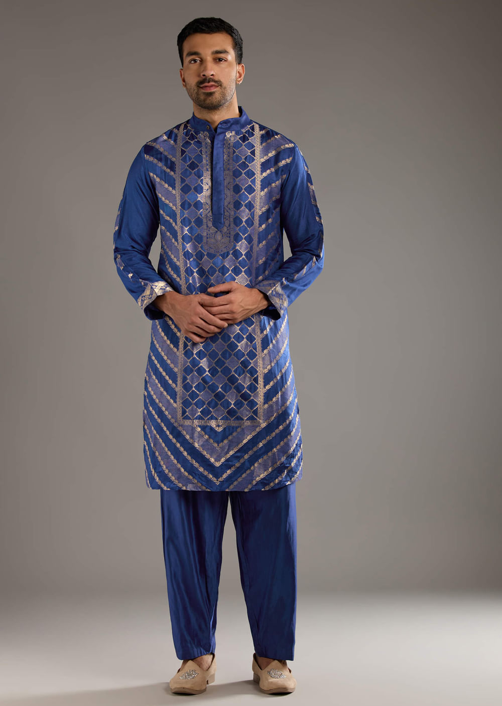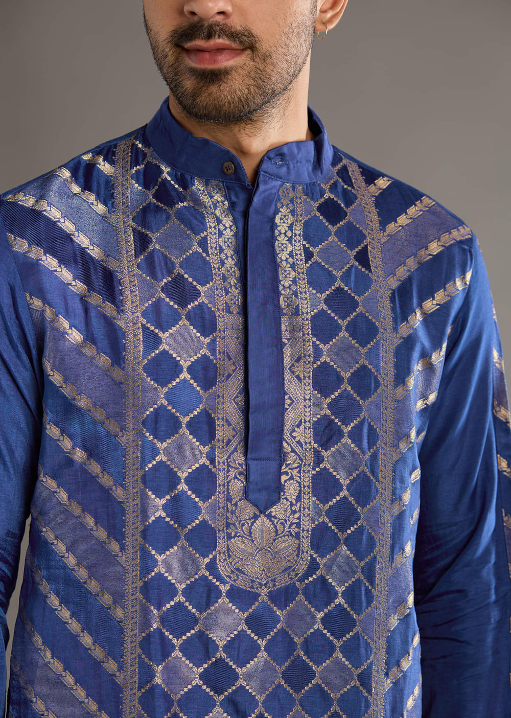 Blue Silk Kurta Set For Men With Handwoven Jacquard Work