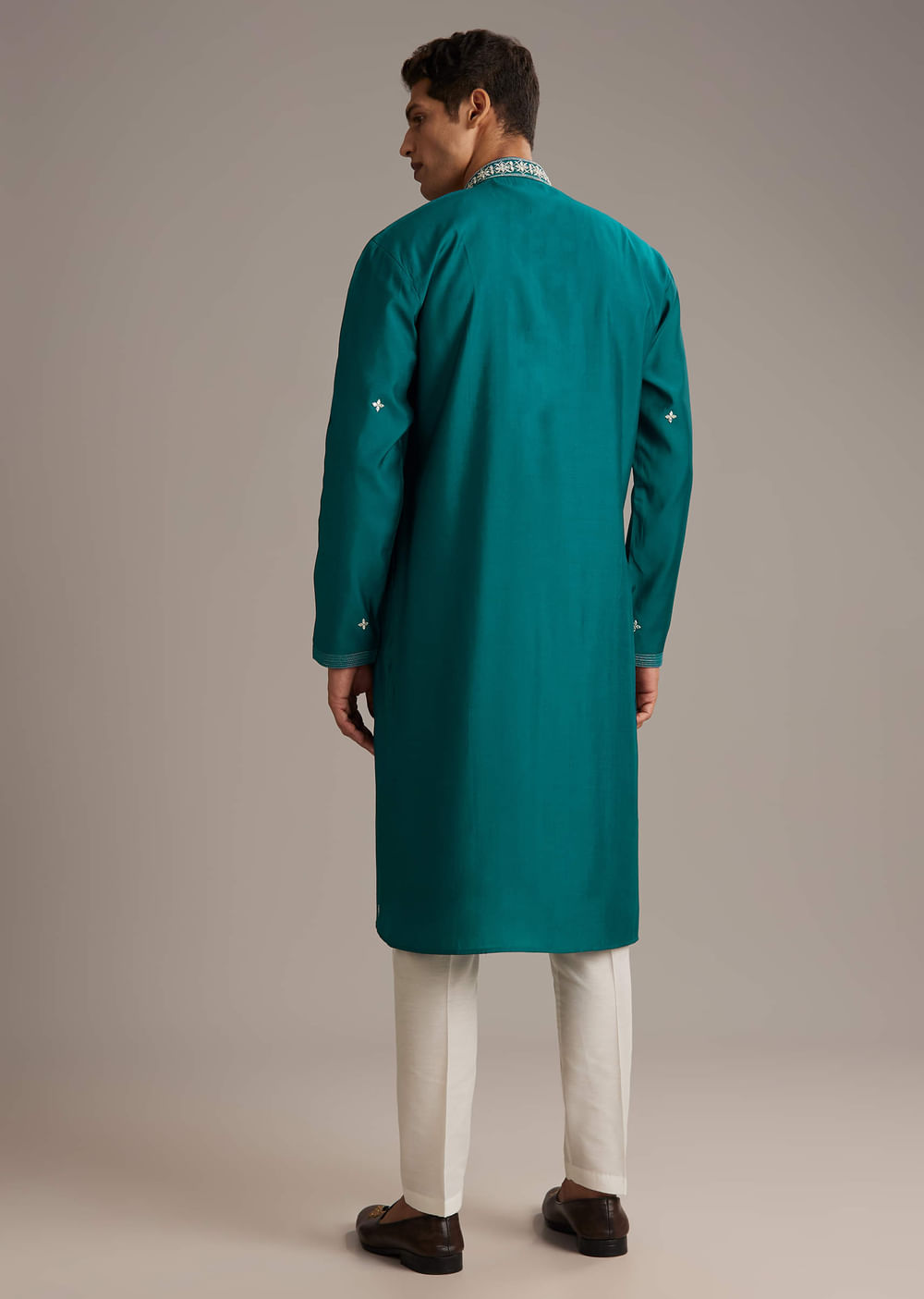 Blue Silk Kurta Set For Men With Mirror And Thread Work