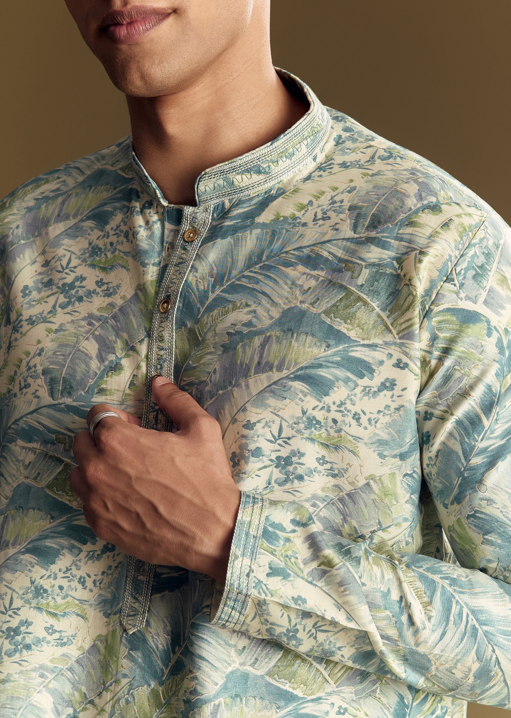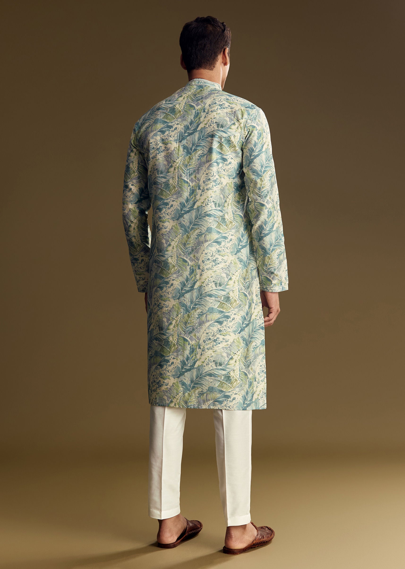 Crafted in smooth silk, this pastel blue kurta set features a subtle all-over floral print elevated with delicate foil highlights. Designed with a classic mandarin collar and full sleeves, it... More Product Details