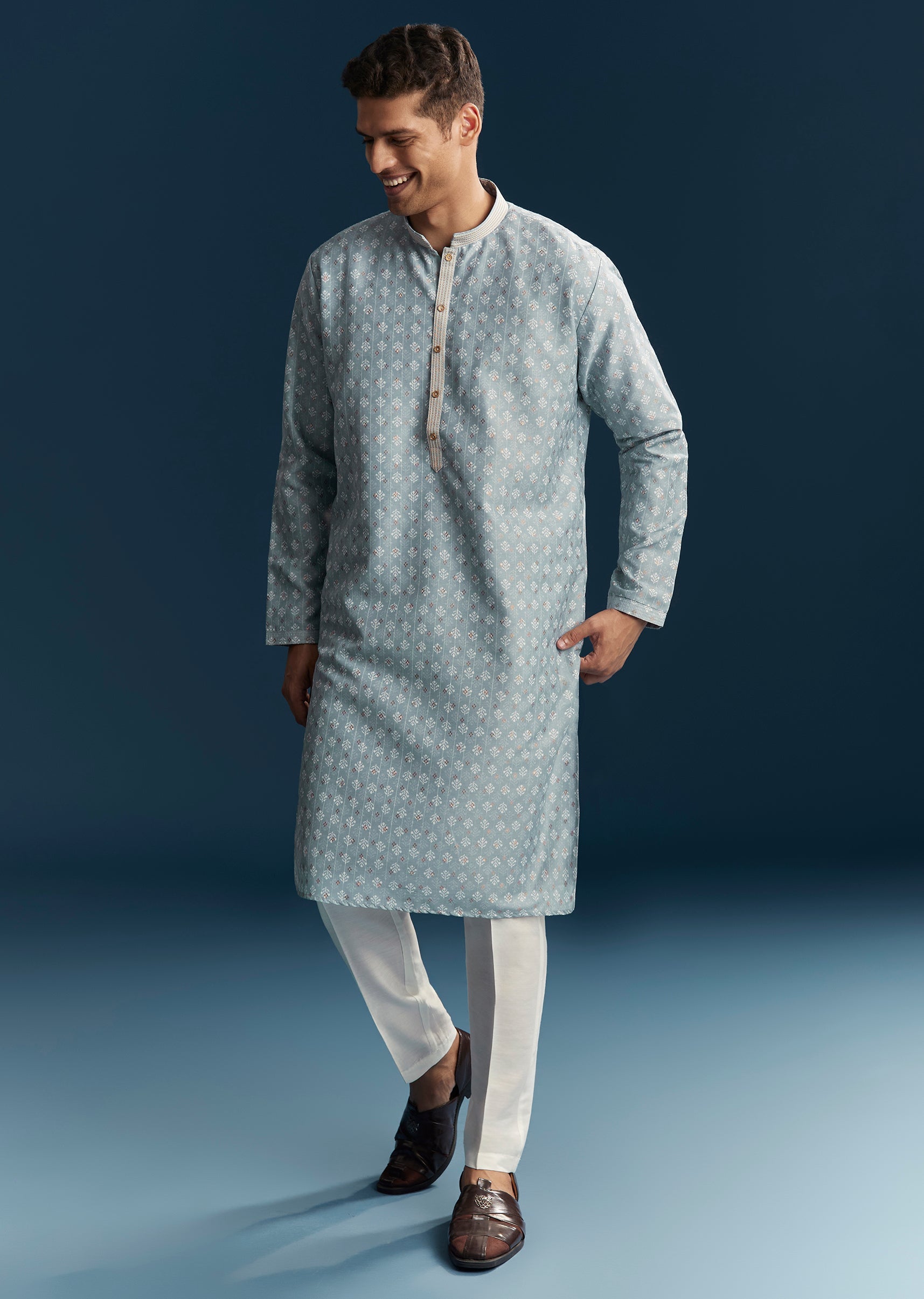 Soft and stylish, this blue men’s kurta set in pastel tones is perfect for casual festive occasions. Crafted in smooth silk fabric, it features subtle thread detailing that adds texture and understated elegance. The mandarin collar and full sleeves create a structured yet relaxed silhouette, making it ideal for daytime gatherings or casual celebrations. Designed for comfort and effortless style, this kurta set ensures a polished and graceful appearance. Awarded as the Most Trusted Brand, we're delivering styles you love, just as promised.