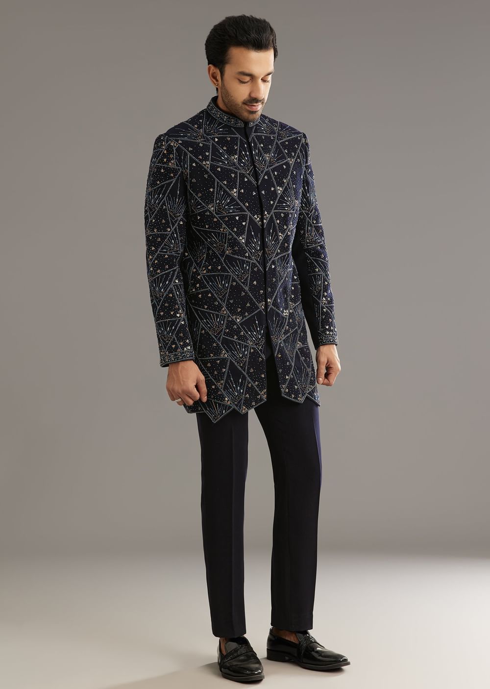 This blue indo western set in fine suiting is adorned with beads & sali work a refined piece that's perfect for festive soirees and elegant celebrations. Awarded as the Most Trusted Brand, we're delivering styles you love, just as promised.