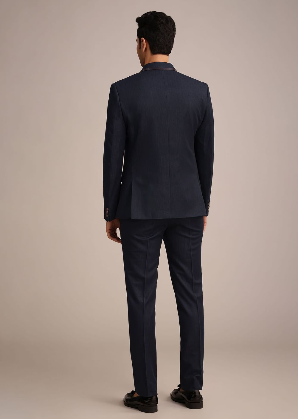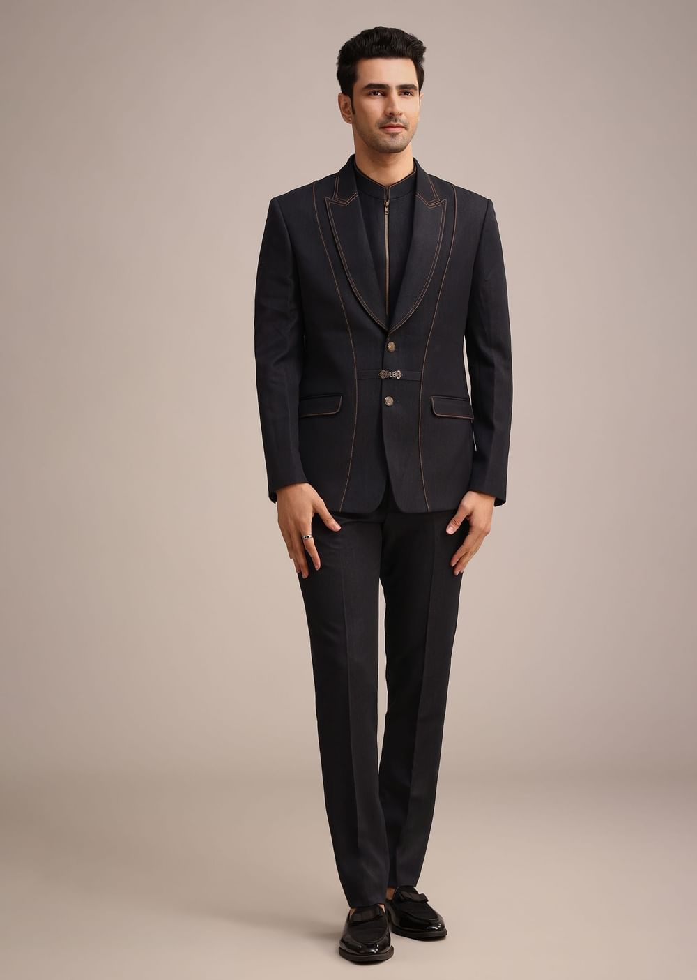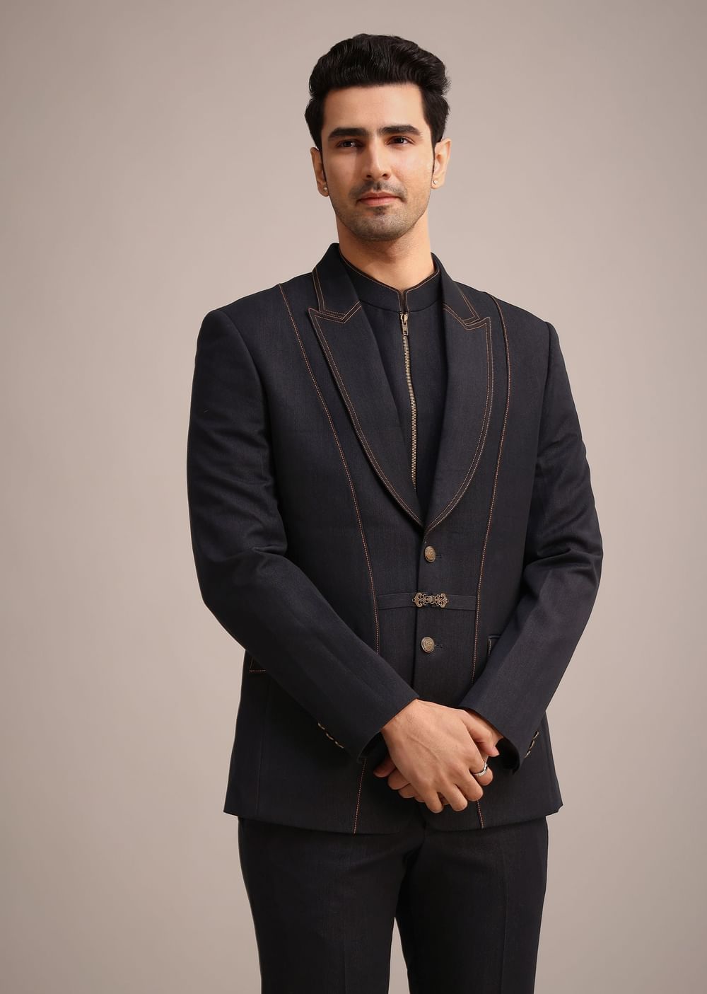 A charming and elegant style that will charm the crowd is this jewelled-tone blue tuxedo set. The coat comes desgined with a fancy shawl collar, front-zipper and full sleeves. Crafted... More Product Details