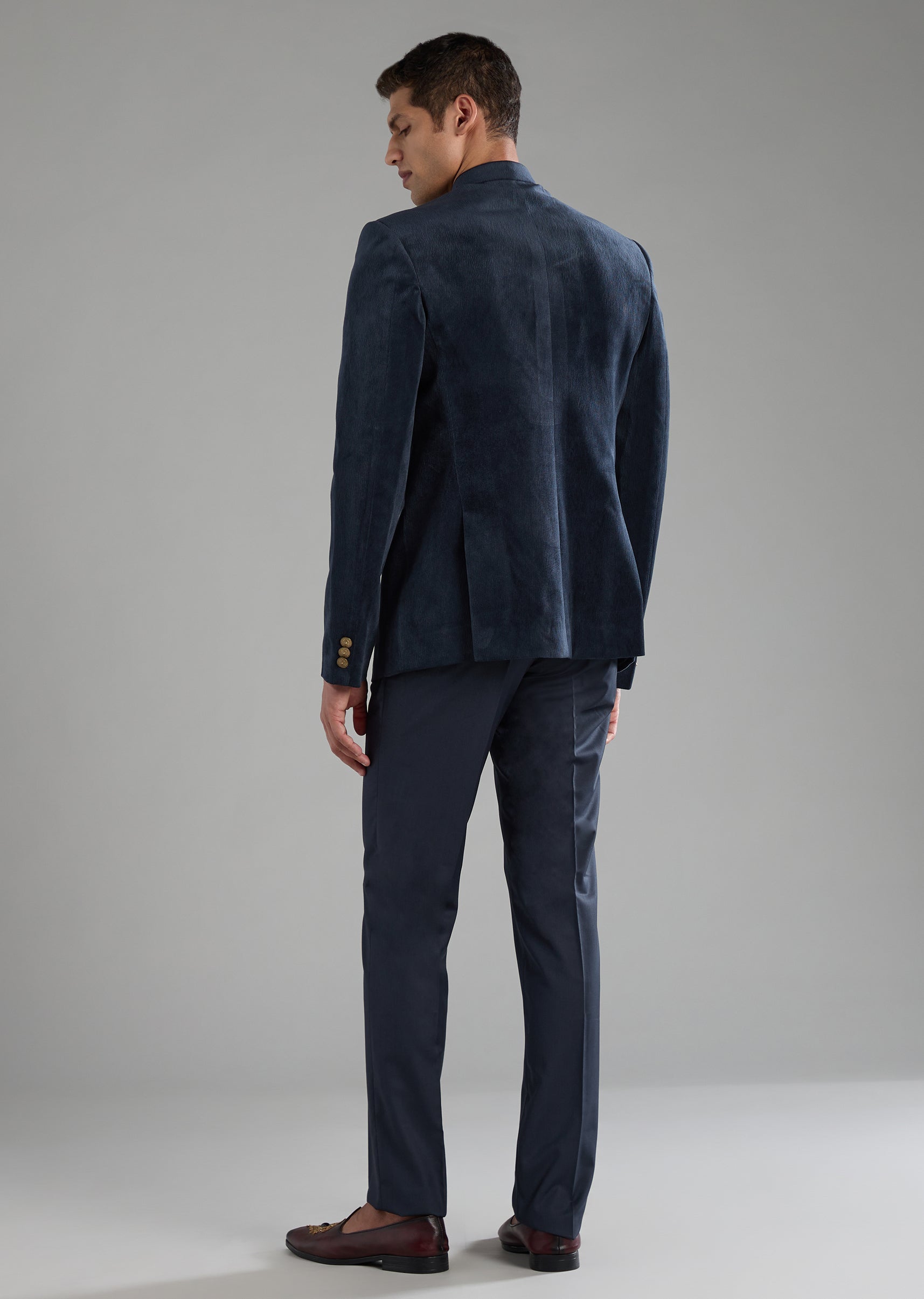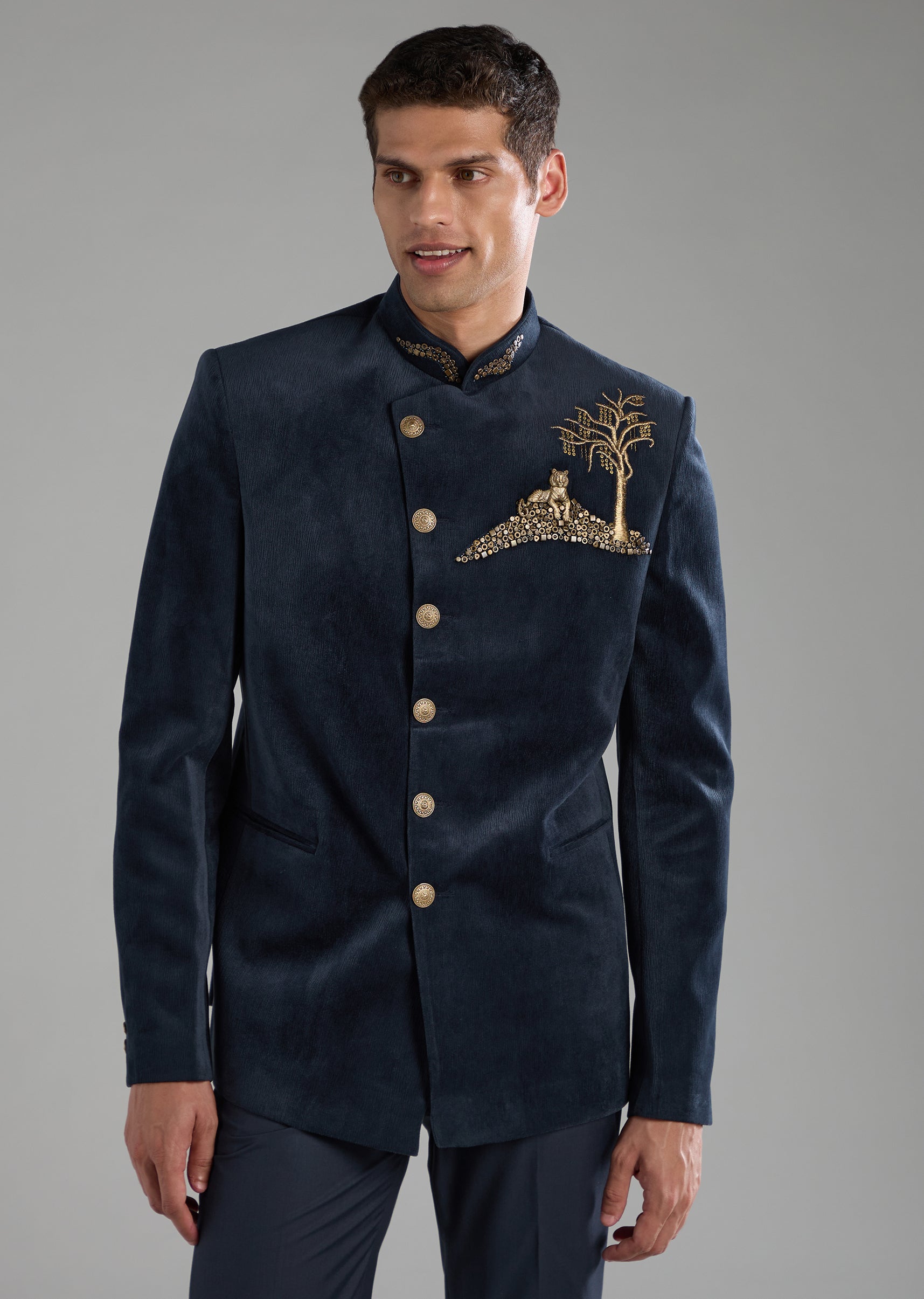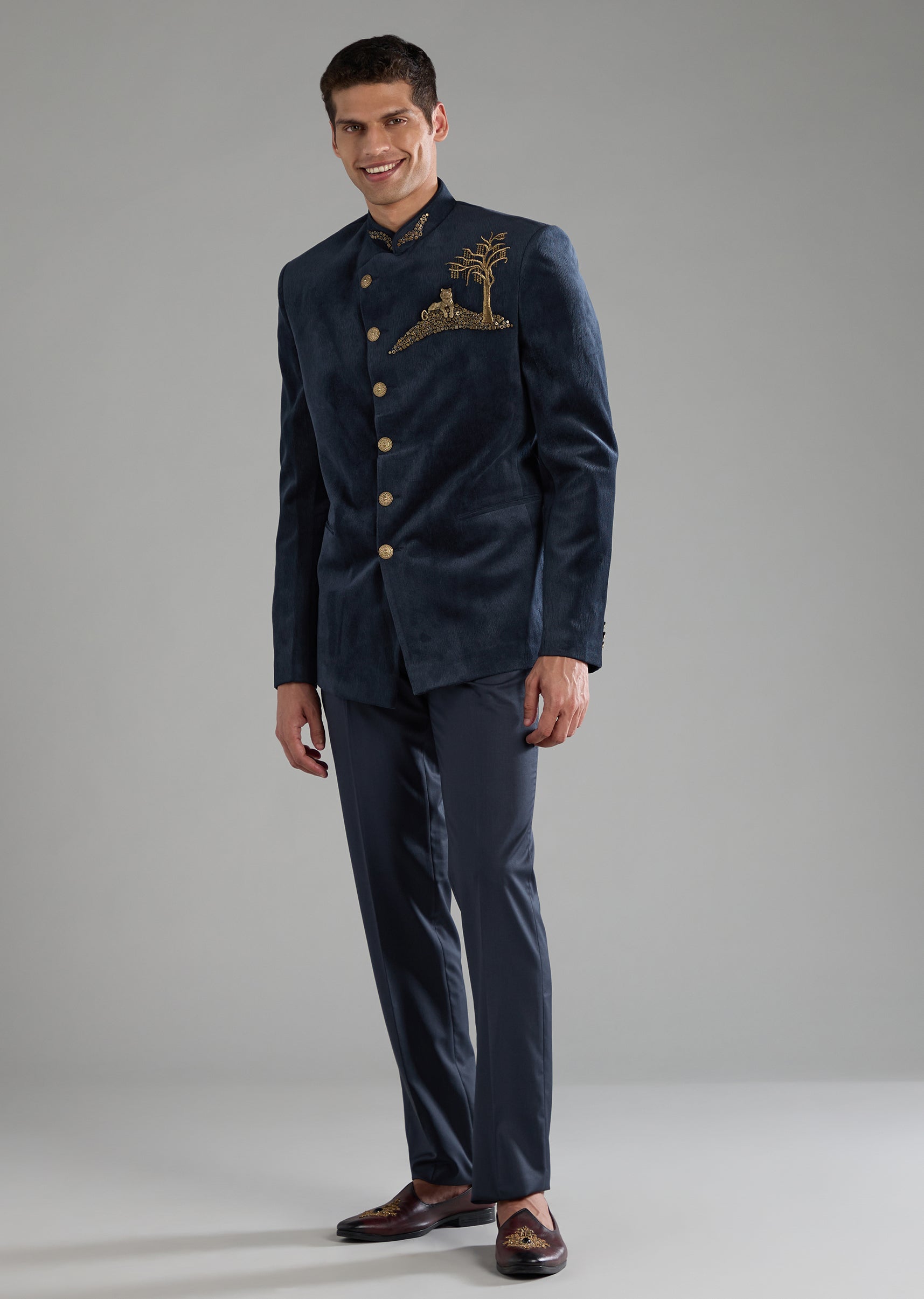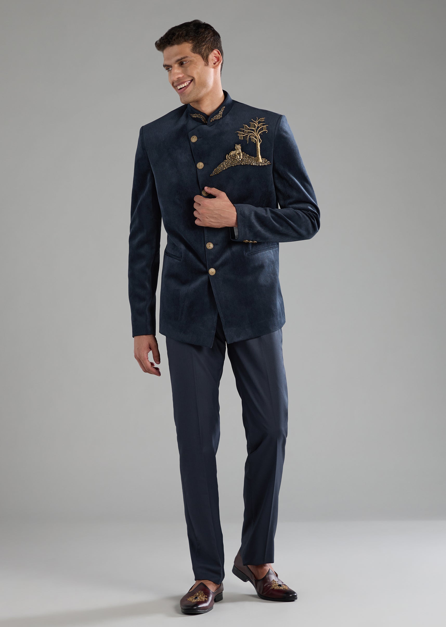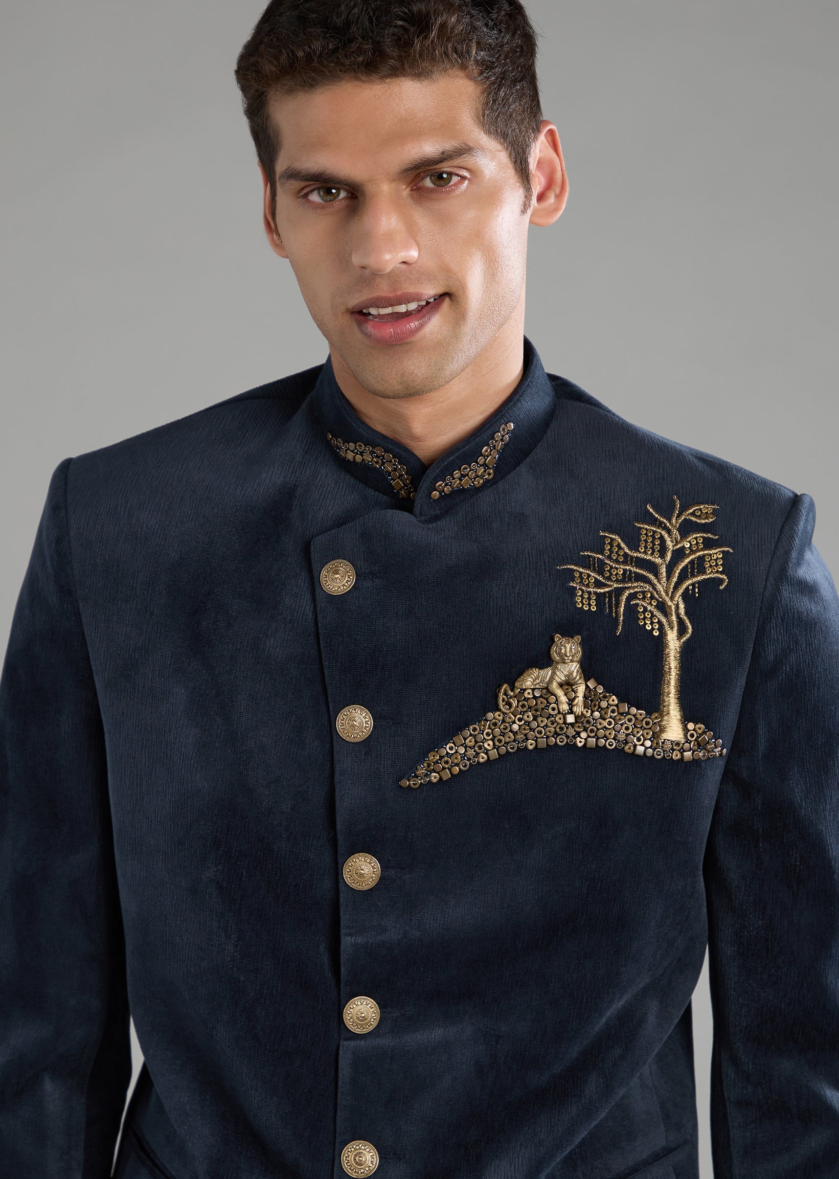 Blue Velvet Embellished Jodhpuri and Pant Set