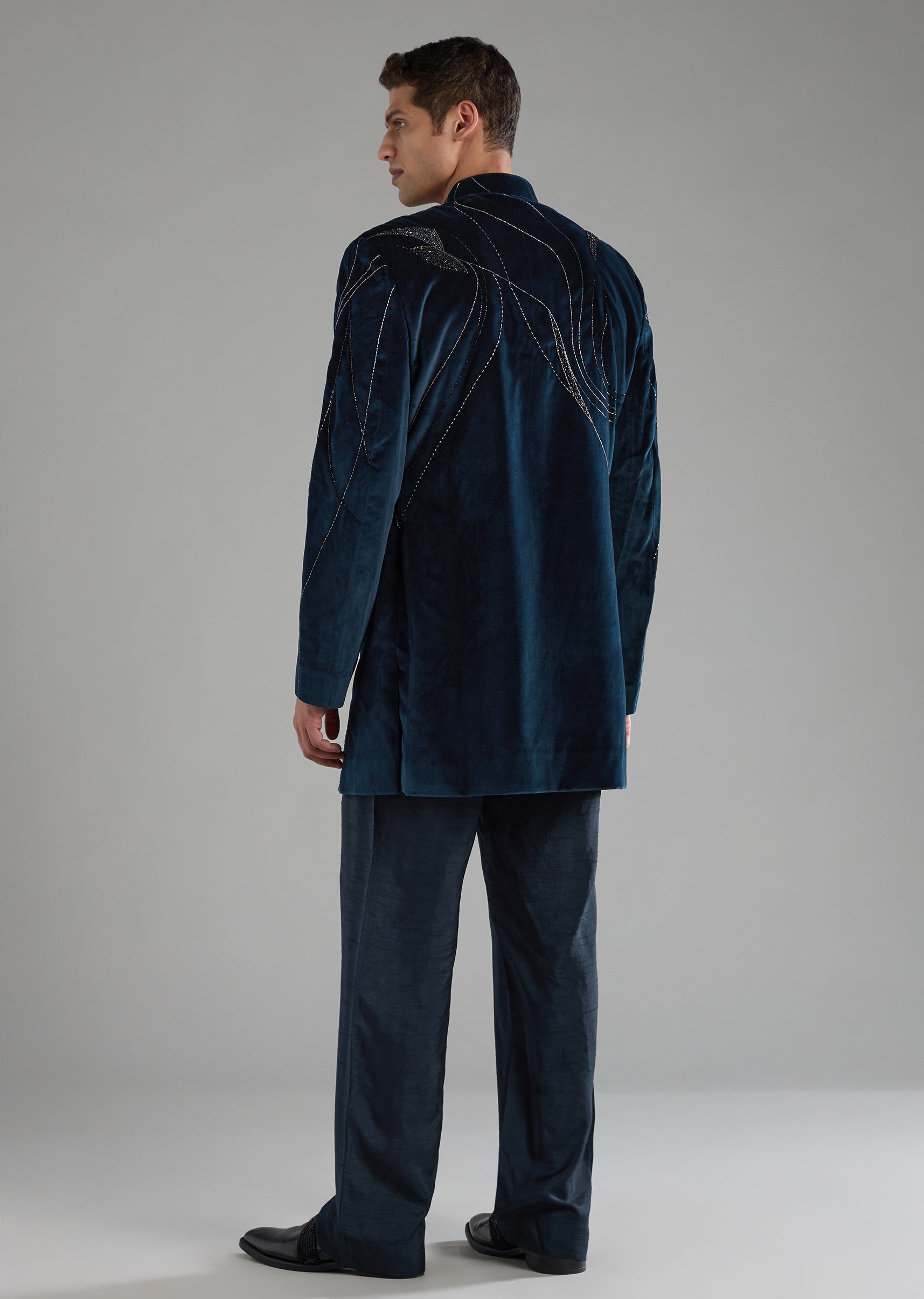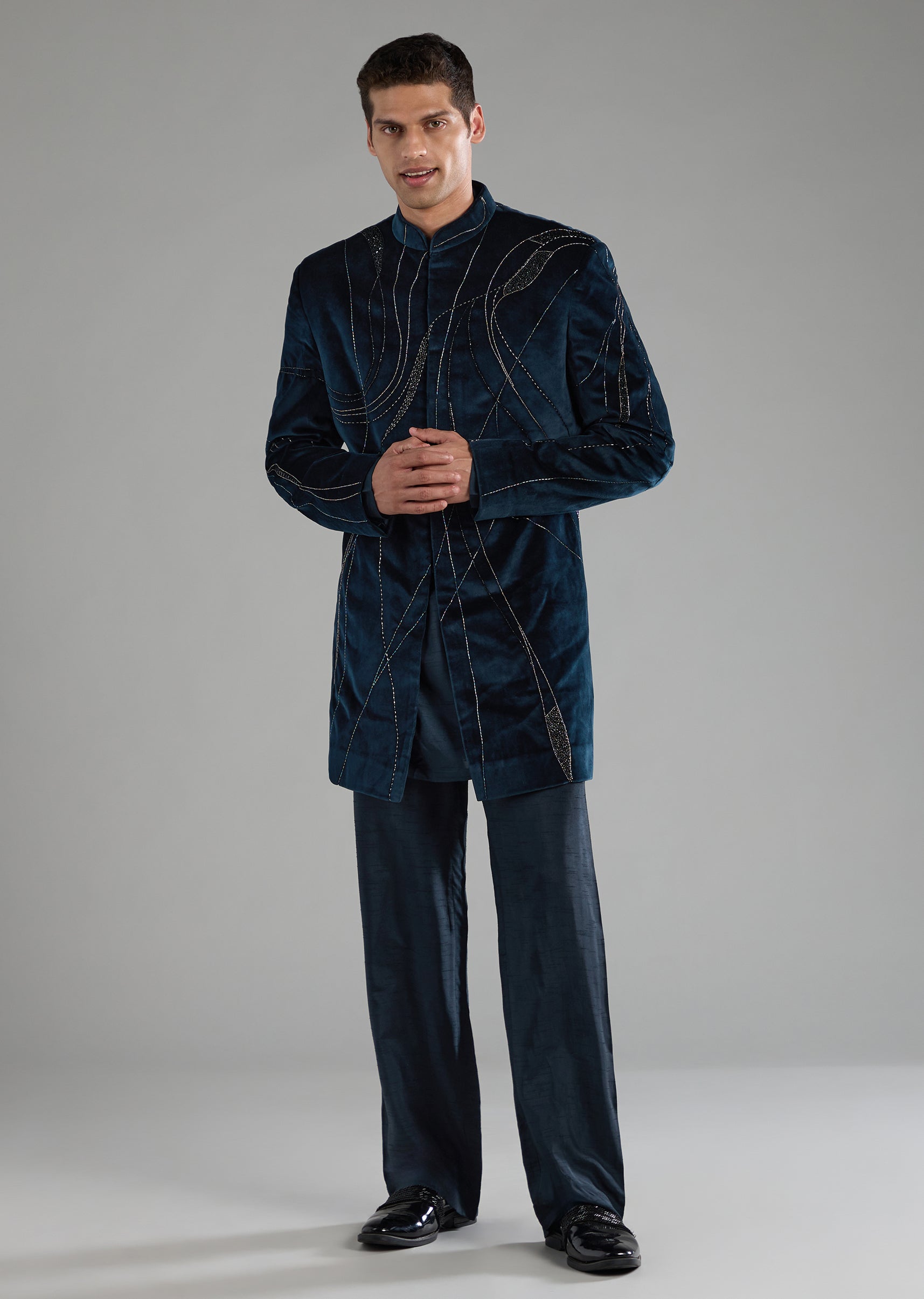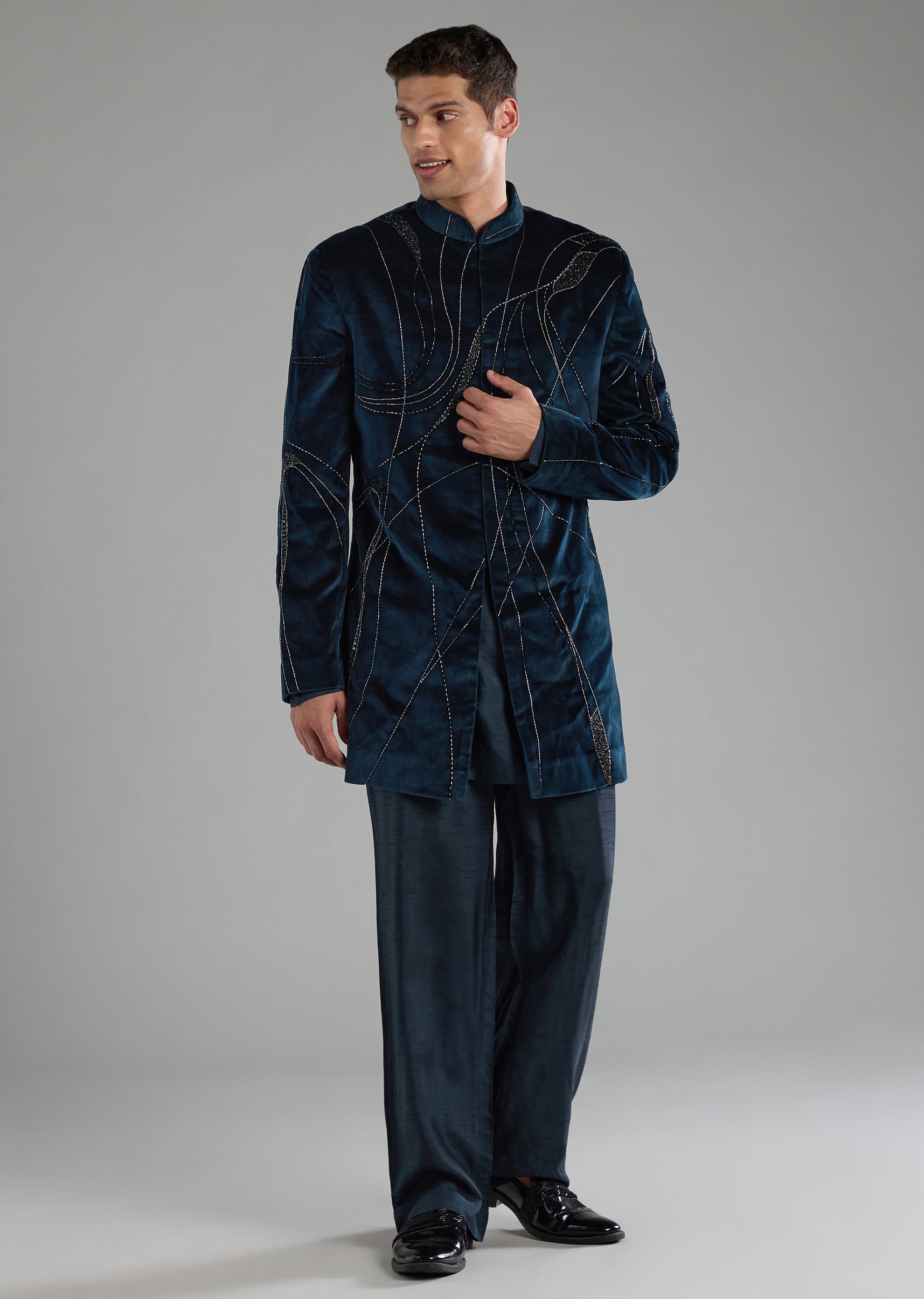 Make a statement in this velvet indowestern set that catches the eye with its luxe sheen and dazzling sequin and cut dana detailing. The full sleeve mandarin collar design brings... More Product Details