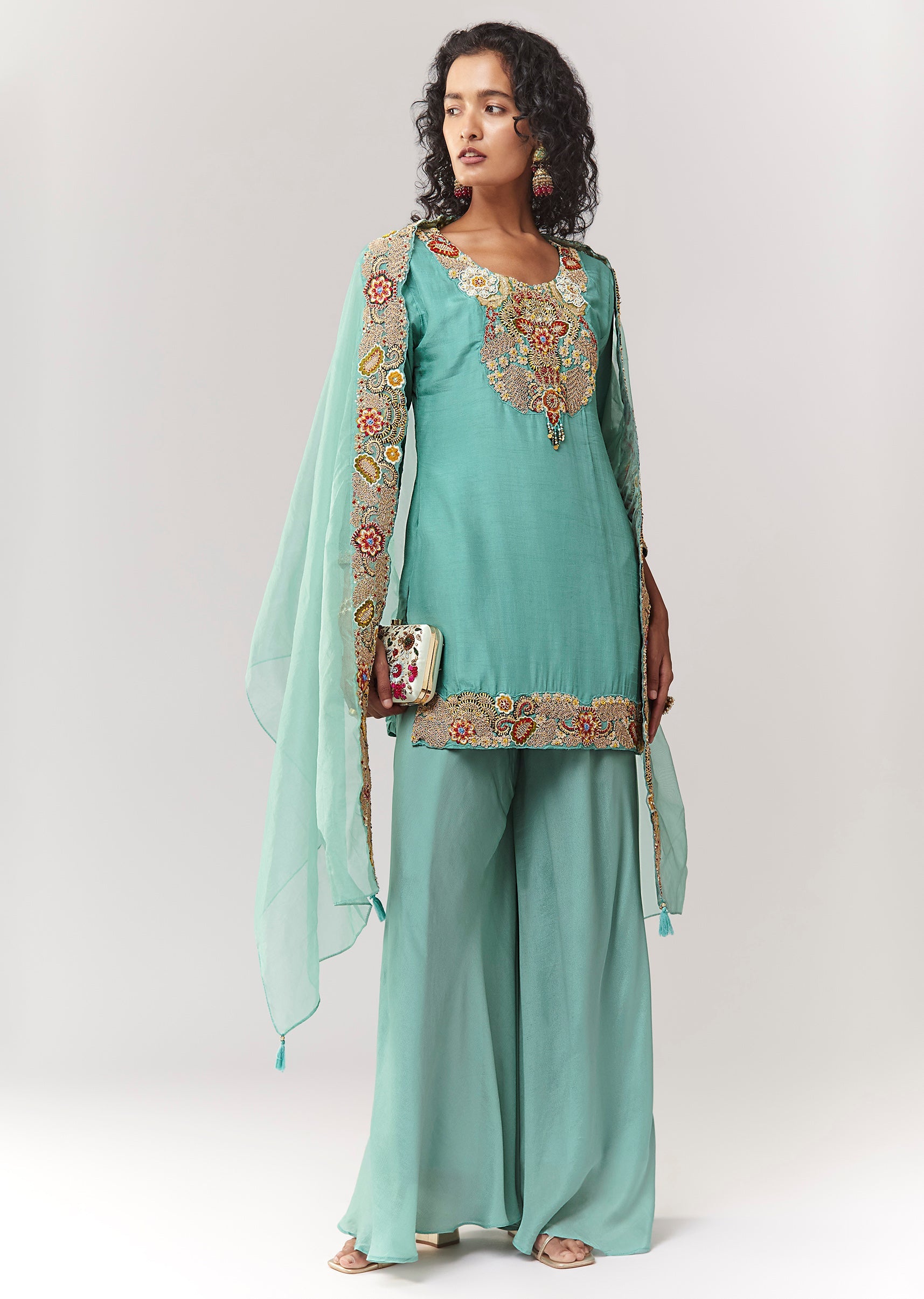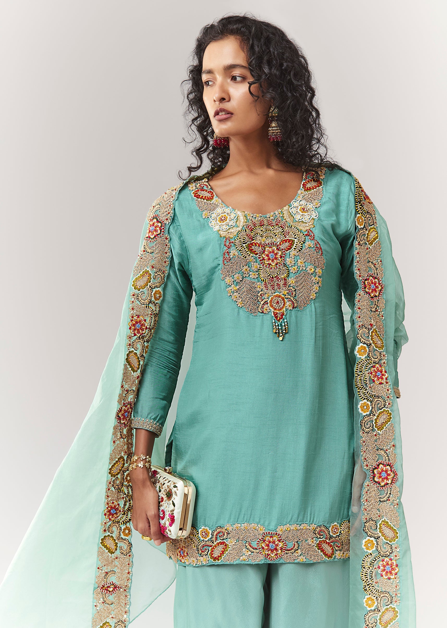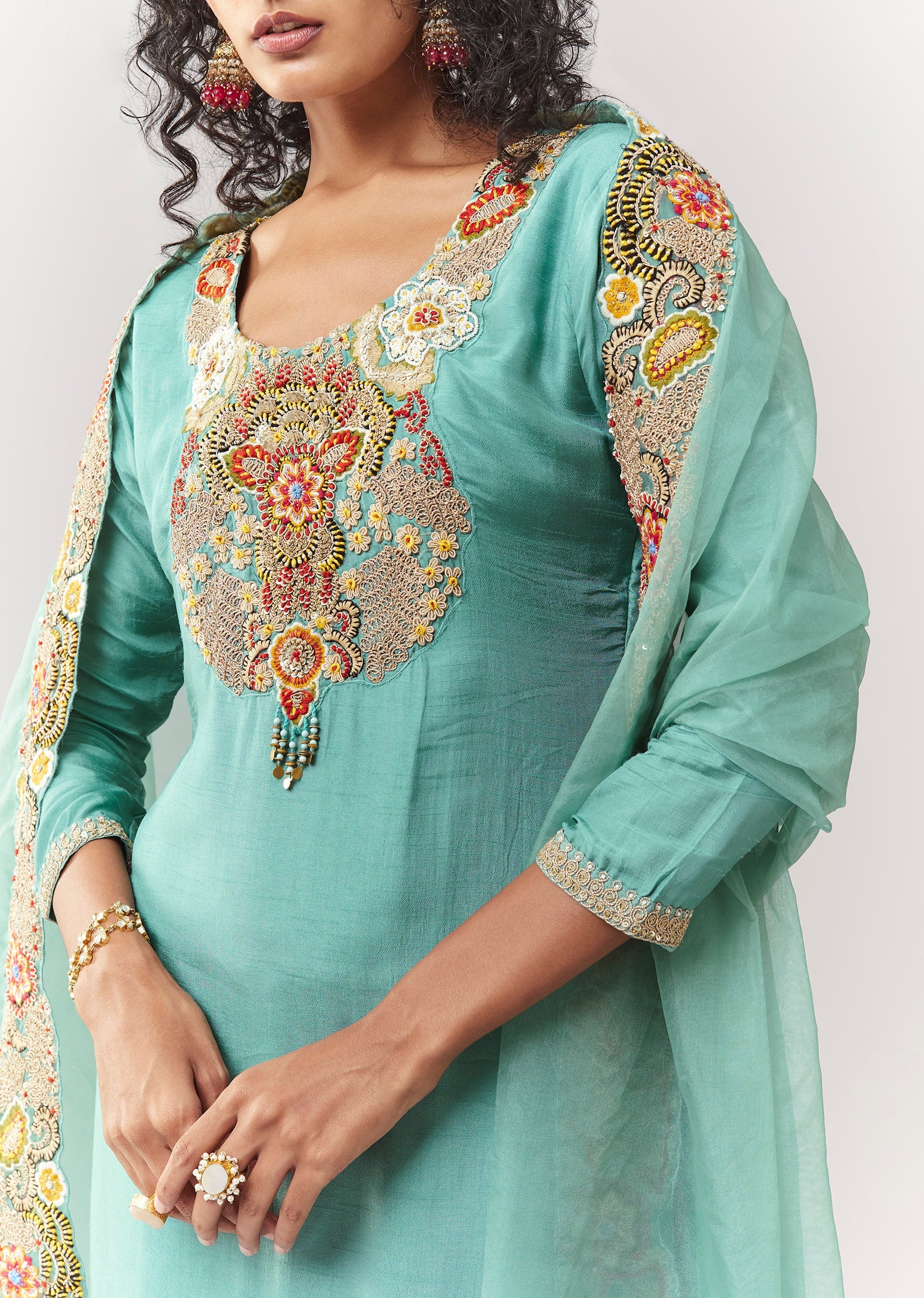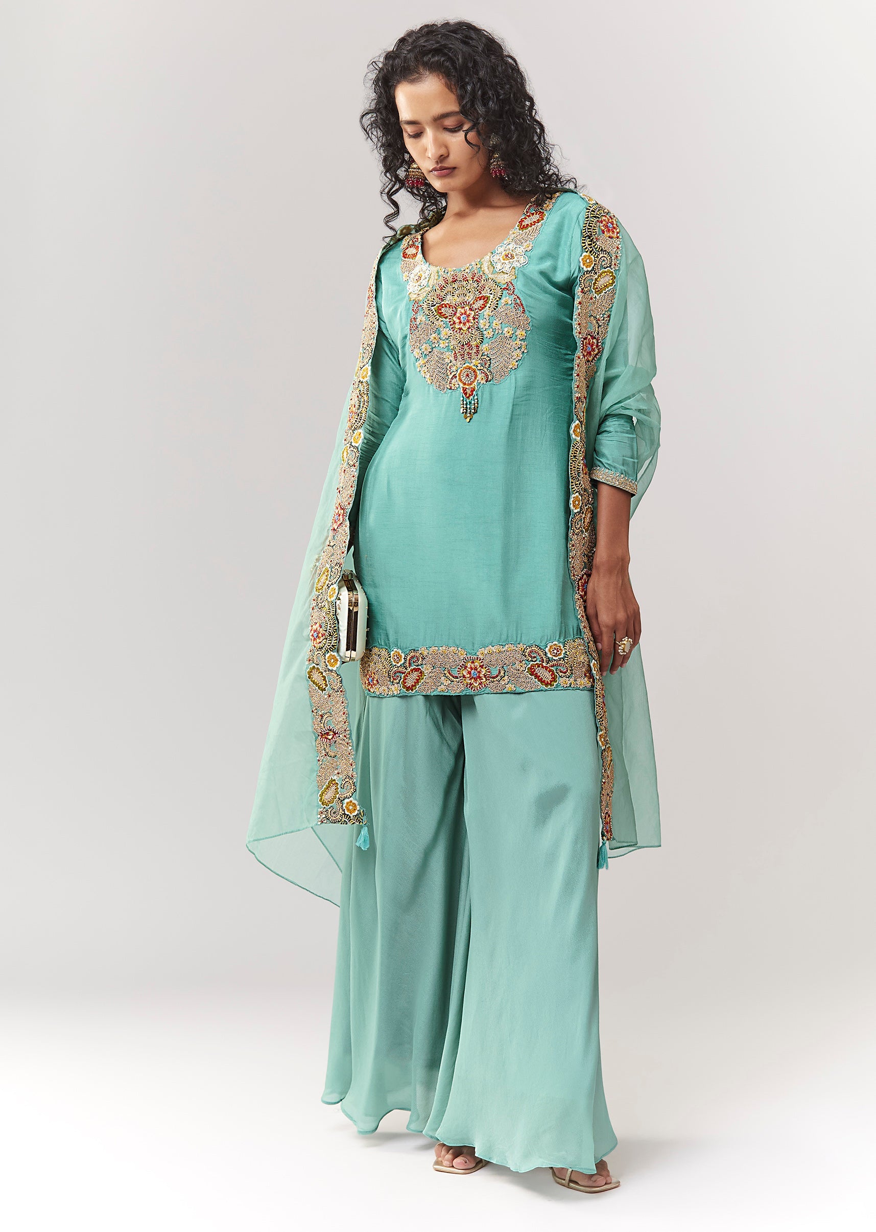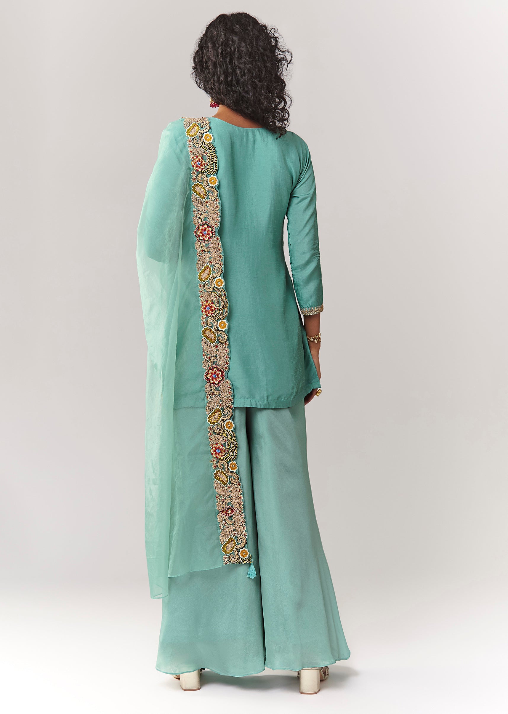 A pastel festive 3-piece set in dola silk featuring zardosi and thread work on a straight kurta. Styled with a round neckline and 3/4 sleeves, paired with a mid-waist elasticated... More Product Details