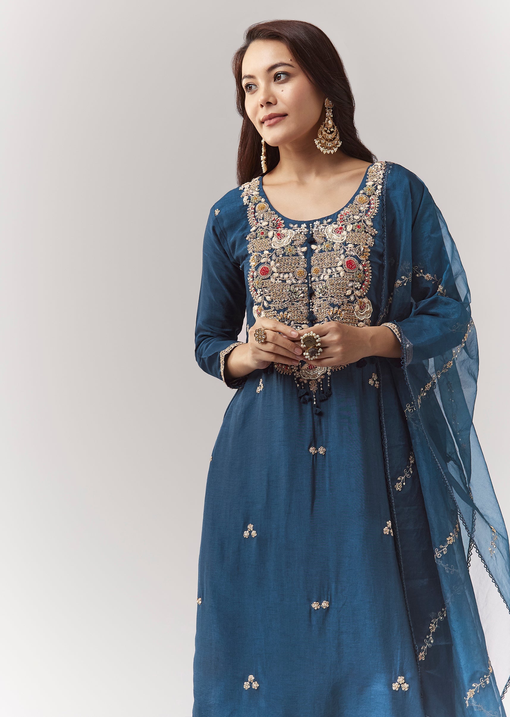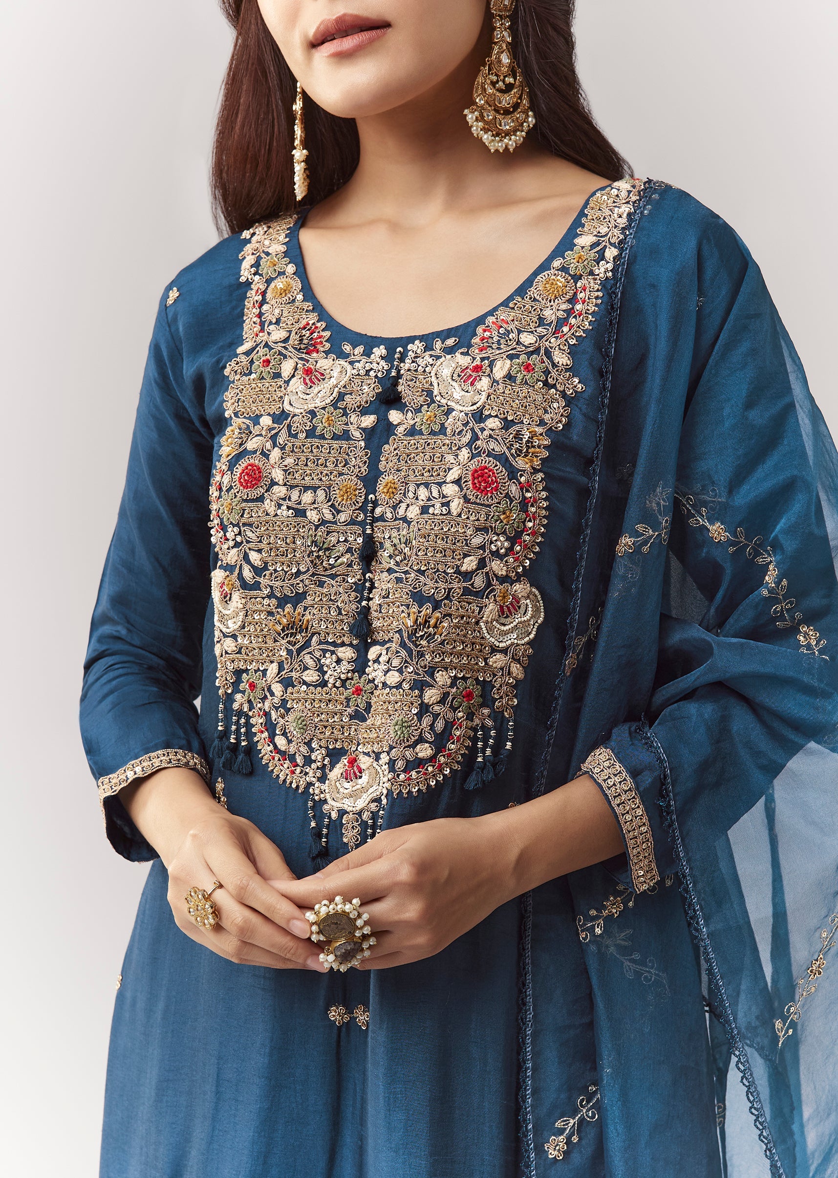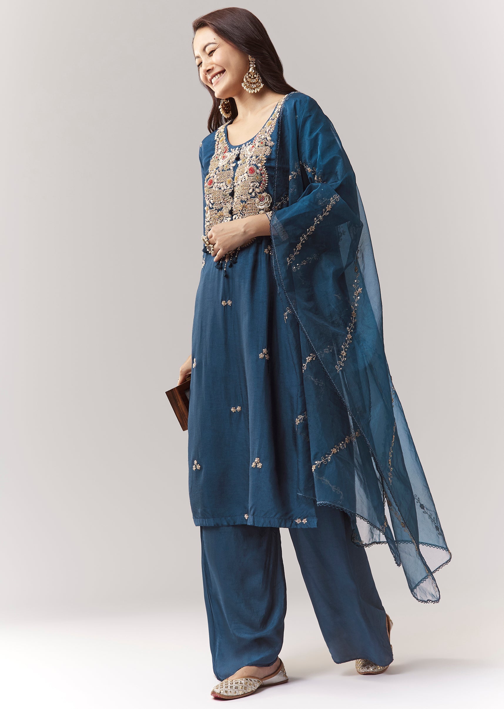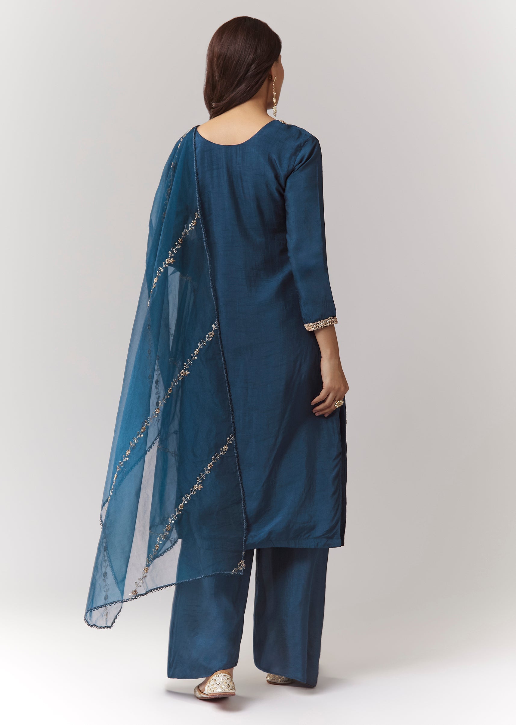 A classic straight blue kurta set in dola silk with zardosi work, styled with elasticated straight pants and organza dupatta. Clean, timeless, and easy for repeat festive wear. Awarded as... More Product Details