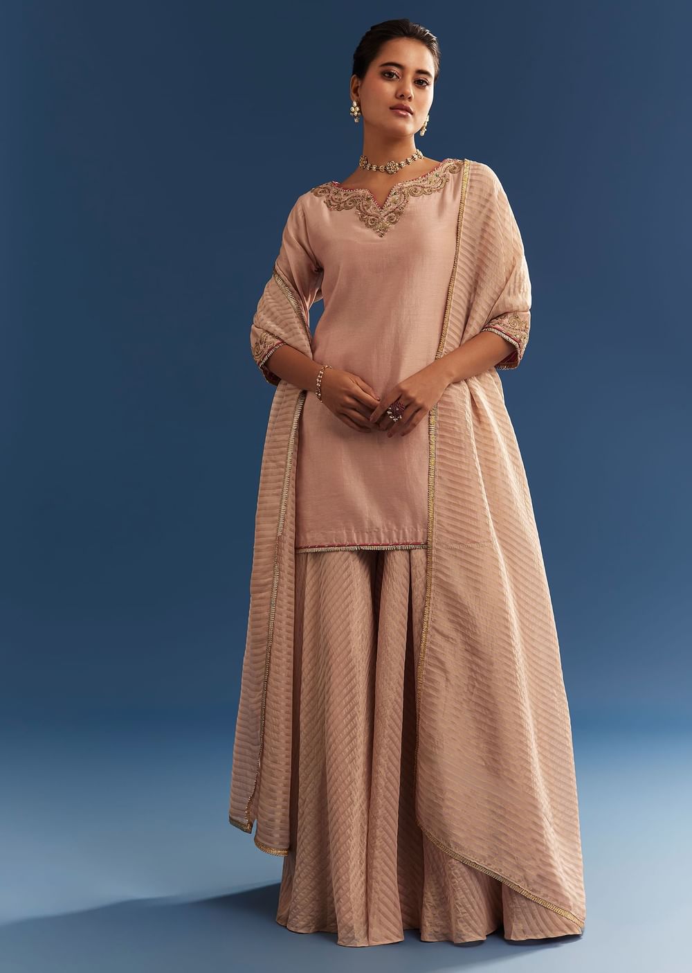 Blush Pink Chanderi Kurta Palazzo Set With Organza Dupatta