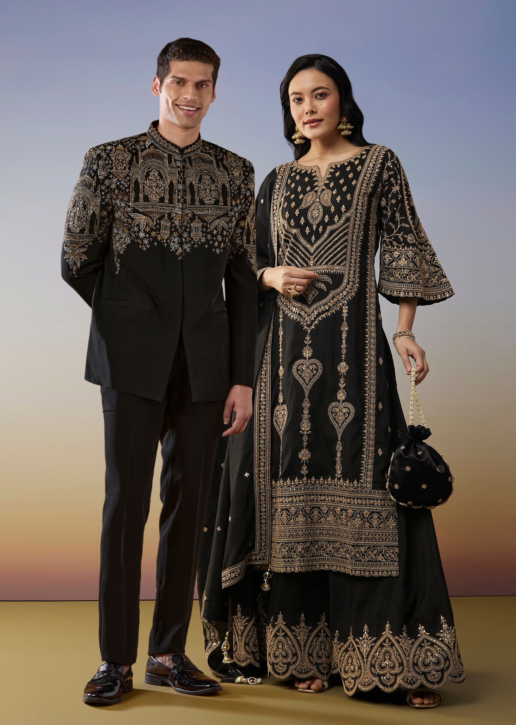 Bold Festive Couple Set – Black Silk Palazzo Suit With Zari Thread And Sequins Work For Her And Black Suiting Jodhpuri Pant Set With Embroidery For Him
